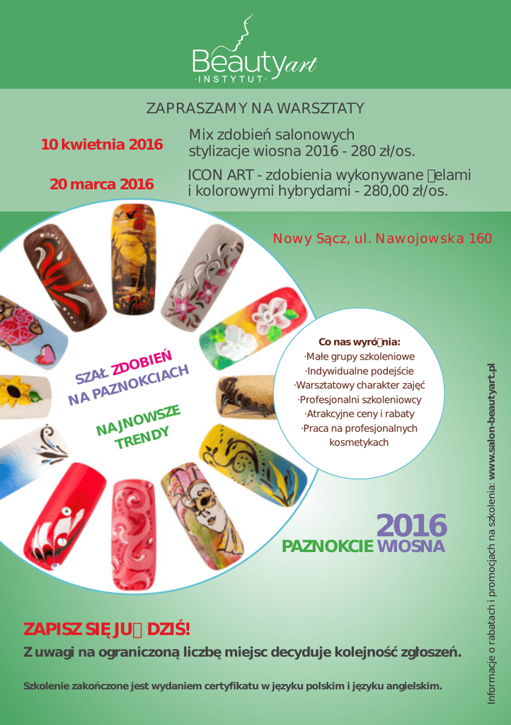 ZAPRASZAMY NA WARSZTATY 10 kwietnia 2016 20 marca 2016 Mix zdobień salonowych stylizacje wiosna 2016 - 280 zł/os. ICON ART - zdobienia wykonywane żelami i kolorowymi hybrydami - 280,00 zł/os. IEŃ DOB Z Ł CH SZA KC I A O N AZ NA P ZE OW S N J NA DY TREN Co nas wyróżnia: ·Małe grupy szkoleniowe ·Indywidualne podejście ·Warsztatowy charakter zajęć ·Profesjonalni szkoleniowcy ·Atrakcyjne ceny i rabaty ·Praca na profesjonalnych kosmetykach 2016 PAZNOKCIE WIOSNA ZAPISZ SIĘ JUŻ DZIŚ! Z uwagi na ograniczoną liczbę miejsc decyduje kolejność zgłoszeń. Szkolenie zakończone jest wydaniem certyfikatu w języku polskim i języku angielskim. Informacje o rabatach i promocjach na szkolenia: www.salon-beautyart.pl Nowy Sącz, ul. Nawojowska 160 W programie m.in.: ICON ART dobór odpowiednich pędzli, sposób malowania poszczególnych wzorów na tablicy, tworzenie ikon krok po kroku, przeniesienie wzorów na wzornik, najmodniejsze stylizacje. Mix zdobień wiosna 2016 - outline nails (paznokcie w ramce), sugar efect, negativ space (manicure z prześwitami), cieniowanie wzorów, popękane szkło. Potwierdzeniem zgłoszenia jest wpłata zaliczki 150 zł na konto ING Bank Śląski 95 1050 1722 1000 0090 6309 8561 lub gotówki w siedzibie Instytutu (proszę podać imię i nazwisko i data kursu). Szkoleniowiec: IWONA KIWACKA – MA JERCZYK Instruktor stylizacji paznokci w renomowanej firmie Mistero Milano sp. z o.o. Właściciel: Studio ILLUSION - Gabinet stylizacji paznokci, studio wizażu, centrum szkoleniowe. Stylistka paznokci specjalizująca się w zdobnictwie farbami akrylowymi, akwarelowymi i paint-gelem. Informacje i zgłoszenia: Beauty Art Instytut, ul. Nawojowska 160, Nowy Sącz, 604 626 567; 796 444 616, [email protected] www.salon-beautyart.pl Nasze szkolenia i kursy mogą być finansowane przez Urząd Pracy ZAPRASZAMY