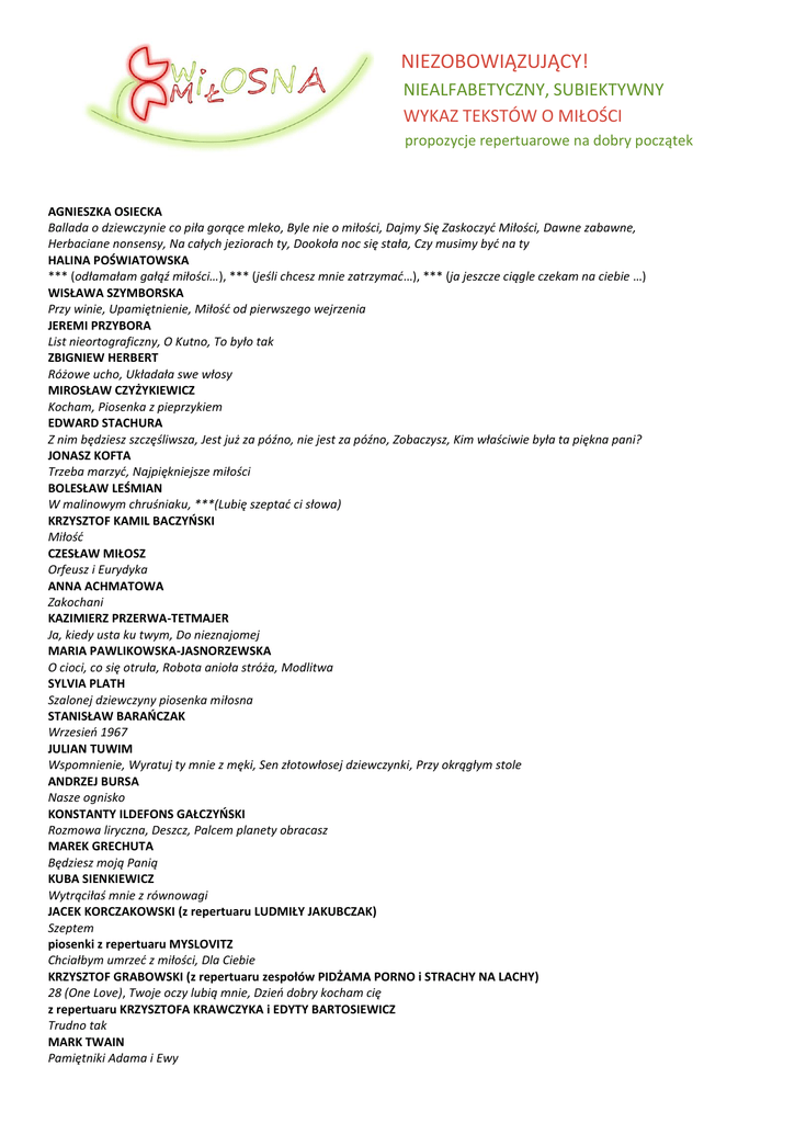 NIEZOBOWIĄZUJĄCY! NIEALFABETYCZNY, SUBIEKTYWNY WYKAZ TEKSTÓW O MIŁOŚCI propozycje repertuarowe na dobry początek AGNIESZKA OSIECKA Ballada o dziewczynie co piła gorące mleko, Byle nie o miłości, Dajmy Się Zaskoczyć Miłości, Dawne zabawne, Herbaciane nonsensy, Na całych jeziorach ty, Dookoła noc się stała, Czy musimy być na ty HALINA POŚWIATOWSKA *** (odłamałam gałąź miłości…), *** (jeśli chcesz mnie zatrzymać…), *** (ja jeszcze ciągle czekam na ciebie …) WISŁAWA SZYMBORSKA Przy winie, Upamiętnienie, Miłość od pierwszego wejrzenia JEREMI PRZYBORA List nieortograficzny, O Kutno, To było tak ZBIGNIEW HERBERT Różowe ucho, Układała swe włosy MIROSŁAW CZYŻYKIEWICZ Kocham, Piosenka z pieprzykiem EDWARD STACHURA Z nim będziesz szczęśliwsza, Jest już za późno, nie jest za późno, Zobaczysz, Kim właściwie była ta piękna pani? JONASZ KOFTA Trzeba marzyć, Najpiękniejsze miłości BOLESŁAW LEŚMIAN W malinowym chruśniaku, ***(Lubię szeptać ci słowa) KRZYSZTOF KAMIL BACZYŃSKI Miłość CZESŁAW MIŁOSZ Orfeusz i Eurydyka ANNA ACHMATOWA Zakochani KAZIMIERZ PRZERWA-TETMAJER Ja, kiedy usta ku twym, Do nieznajomej MARIA PAWLIKOWSKA-JASNORZEWSKA O cioci, co się otruła, Robota anioła stróża, Modlitwa SYLVIA PLATH Szalonej dziewczyny piosenka miłosna STANISŁAW BARAŃCZAK Wrzesień 1967 JULIAN TUWIM Wspomnienie, Wyratuj ty mnie z męki, Sen złotowłosej dziewczynki, Przy okrągłym stole ANDRZEJ BURSA Nasze ognisko KONSTANTY ILDEFONS GAŁCZYŃSKI Rozmowa liryczna, Deszcz, Palcem planety obracasz MAREK GRECHUTA Będziesz moją Panią KUBA SIENKIEWICZ Wytrąciłaś mnie z równowagi JACEK KORCZAKOWSKI (z repertuaru LUDMIŁY JAKUBCZAK) Szeptem piosenki z repertuaru MYSLOVITZ Chciałbym umrzeć z miłości, Dla Ciebie KRZYSZTOF GRABOWSKI (z repertuaru zespołów PIDŻAMA PORNO i STRACHY NA LACHY) 28 (One Love), Twoje oczy lubią mnie, Dzień dobry kocham cię z repertuaru KRZYSZTOFA KRAWCZYKA i EDYTY BARTOSIEWICZ Trudno tak MARK TWAIN Pamiętniki Adama i Ewy