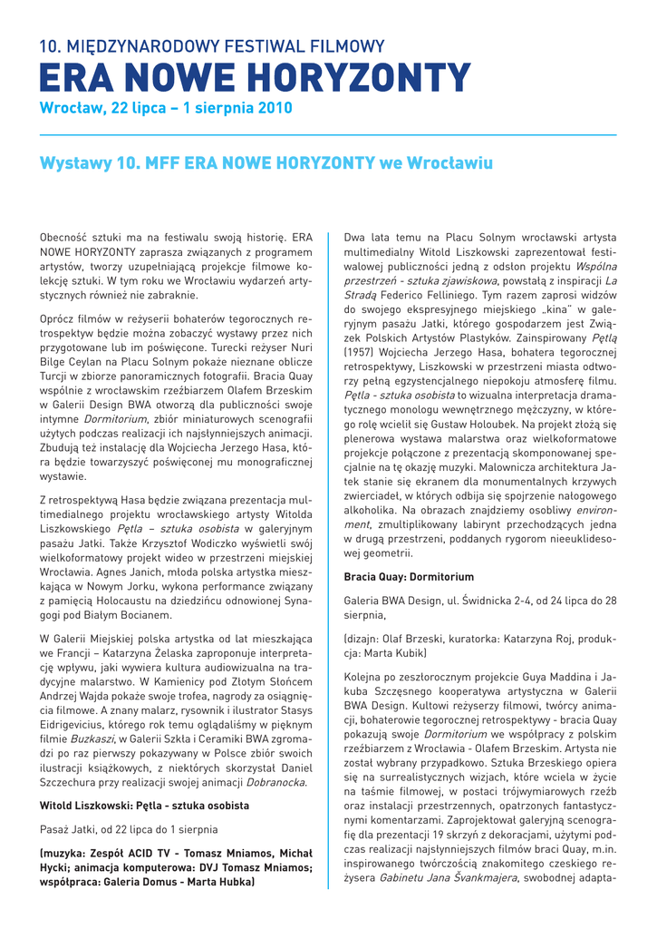 Wystawy 10. MFF ERA NOWE HORYZONTY we Wrocławiu Obecność sztuki ma na festiwalu swoją historię. ERA NOWE HORYZONTY zaprasza związanych z programem artystów, tworzy uzupełniającą projekcje filmowe kolekcję sztuki. W tym roku we Wrocławiu wydarzeń artystycznych również nie zabraknie. Oprócz filmów w reżyserii bohaterów tegorocznych retrospektyw będzie można zobaczyć wystawy przez nich przygotowane lub im poświęcone. Turecki reżyser Nuri Bilge Ceylan na Placu Solnym pokaże nieznane oblicze Turcji w zbiorze panoramicznych fotografii. Bracia Quay wspólnie z wrocławskim rzeźbiarzem Olafem Brzeskim w Galerii Design BWA otworzą dla publiczności swoje intymne Dormitorium, zbiór miniaturowych scenografii użytych podczas realizacji ich najsłynniejszych animacji. Zbudują też instalację dla Wojciecha Jerzego Hasa, która będzie towarzyszyć poświęconej mu monograficznej wystawie. Z retrospektywą Hasa będzie związana prezentacja multimedialnego projektu wrocławskiego artysty Witolda Liszkowskiego Pętla – sztuka osobista w galeryjnym pasażu Jatki. Także Krzysztof Wodiczko wyświetli swój wielkoformatowy projekt wideo w przestrzeni miejskiej Wrocławia. Agnes Janich, młoda polska artystka mieszkająca w Nowym Jorku, wykona performance związany z pamięcią Holocaustu na dziedzińcu odnowionej Synagogi pod Białym Bocianem. W Galerii Miejskiej polska artystka od lat mieszkająca we Francji – Katarzyna Żelaska zaproponuje interpretację wpływu, jaki wywiera kultura audiowizualna na tradycyjne malarstwo. W Kamienicy pod Złotym Słońcem Andrzej Wajda pokaże swoje trofea, nagrody za osiągnięcia filmowe. A znany malarz, rysownik i ilustrator Stasys Eidrigevicius, którego rok temu oglądaliśmy w pięknym filmie Buzkaszi, w Galerii Szkła i Ceramiki BWA zgromadzi po raz pierwszy pokazywany w Polsce zbiór swoich ilustracji książkowych, z niektórych skorzystał Daniel Szczechura przy realizacji swojej animacji Dobranocka. Witold Liszkowski: Pętla - sztuka osobista Pasaż Jatki, od 22 lipca do 1 sierpnia (muzyka: Zespół ACID TV - Tomasz Mniamos, Michał Hycki; animacja komputerowa: DVJ Tomasz Mniamos; współpraca: Galeria Domus - Marta Hubka) Dwa lata temu na Placu Solnym wrocławski artysta multimedialny Witold Liszkowski zaprezentował festiwalowej publiczności jedną z odsłon projektu Wspólna przestrzeń - sztuka zjawiskowa, powstałą z inspiracji La Stradą Federico Felliniego. Tym razem zaprosi widzów do swojego ekspresyjnego miejskiego „kina” w galeryjnym pasażu Jatki, którego gospodarzem jest Związek Polskich Artystów Plastyków. Zainspirowany Pętlą (1957) Wojciecha Jerzego Hasa, bohatera tegorocznej retrospektywy, Liszkowski w przestrzeni miasta odtworzy pełną egzystencjalnego niepokoju atmosferę filmu. Pętla - sztuka osobista to wizualna interpretacja dramatycznego monologu wewnętrznego mężczyzny, w którego rolę wcielił się Gustaw Holoubek. Na projekt złożą się plenerowa wystawa malarstwa oraz wielkoformatowe projekcje połączone z prezentacją skomponowanej specjalnie na tę okazję muzyki. Malownicza architektura Jatek stanie się ekranem dla monumentalnych krzywych zwierciadeł, w których odbija się spojrzenie nałogowego alkoholika. Na obrazach znajdziemy osobliwy environment, zmultiplikowany labirynt przechodzących jedna w drugą przestrzeni, poddanych rygorom nieeuklidesowej geometrii. Bracia Quay: Dormitorium Galeria BWA Design, ul. Świdnicka 2-4, od 24 lipca do 28 sierpnia, (dizajn: Olaf Brzeski, kuratorka: Katarzyna Roj, produkcja: Marta Kubik) Kolejna po zeszłorocznym projekcie Guya Maddina i Jakuba Szczęsnego kooperatywa artystyczna w Galerii BWA Design. Kultowi reżyserzy filmowi, twórcy animacji, bohaterowie tegorocznej retrospektywy - bracia Quay pokazują swoje Dormitorium we współpracy z polskim rzeźbiarzem z Wrocławia - Olafem Brzeskim. Artysta nie został wybrany przypadkowo. Sztuka Brzeskiego opiera się na surrealistycznych wizjach, które wciela w życie na taśmie filmowej, w postaci trójwymiarowych rzeźb oraz instalacji przestrzennych, opatrzonych fantastycznymi komentarzami. Zaprojektował galeryjną scenografię dla prezentacji 19 skrzyń z dekoracjami, użytymi podczas realizacji najsłynniejszych filmów braci Quay, m.in. inspirowanego twórczością znakomitego czeskiego reżysera Gabinetu Jana Švankmajera, swobodnej adapta- cji prozy Bruno Schulza - Ulicy krokodyli (uznanej przez Terry’ego Gilliama za jedną z dziesięciu najlepszych animacji na świecie), czy Bezimiennej panny młodej. Precyzyjnie wykonane, miniaturowe światy były punktem wyjścia dla formalnych eksperymentów filmowych. Dormitorium staje się naszą wspólną sypialnią, oniryczną krainą, rezerwuarem dziwnych istot, niekompletnych zabawek, zakurzonych mechanizmów, które ożywają w filmach braci Quay. współpracy z mistrzem animacji, bohaterem tegorocznej retrospektywy Danielem Szczechurą była Dobranocka (1997) z muzyką Jerzego Satanowskiego i poetyckim tekstem Jana Wołka. Motywy z twórczości Stasysa znalazły się w filmie, splecione w historię i wprawione w ruch przez Szczechurę. Bracia Quay dla Hasa Katarzyna Żelaska: 19-sty Pitch Galeria Sztuki Współczesnej Awangarda, ul. Wita Stwosza 32 Galeria Miejska, ul. Kiełbaśnicza 28, od 24 lipca do 19 sierpnia W październiku 2009 roku w ramach Polska! Year w londyńskim Barbicanie odbyła się retrospektywa twórczości Wojciecha Jerzego Hasa. Towarzyszyła jej specjalnie na tę okazję przygotowana instalacja braci Quay, wielbicieli Hasa, którzy właśnie realizują remake jego filmu Sanatorium pod Klepsydrą. We Wrocławiu instalacja dołączy do wystawy w Galerii Sztuki Współczesnej Awangarda, poświęconej filmom i osobie wizjonera polskiego kina, bohatera tegorocznej retrospektywy. Bezpośrednią inspiracją dla pracy braci Quay był fotograficzny portret Hasa otoczonego atrybutami swoich filmowych wizji. Reżyser nicz