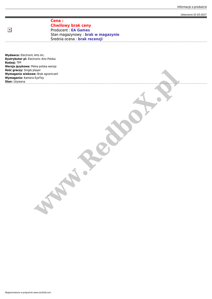 Informacje o produkcie Utworzono 01-03-2017 Cena : Chwilowy brak ceny Producent : EA Games Stan magazynowy : brak w magazynie Średnia ocena : brak recenzji w w w .R ed b oX .p l Wydawca: Electronic Arts Inc. Dystrybutor pl: Electronic Arts Polska Rodzaj: TPP Wersja językowa: Pełna polska wersja Ilość graczy: Single player Wymagania wiekowe: Brak ograniczeń Wymagania: Kamera EyeToy Stan: Używana Wygenerowano w programie www.oscGold.com