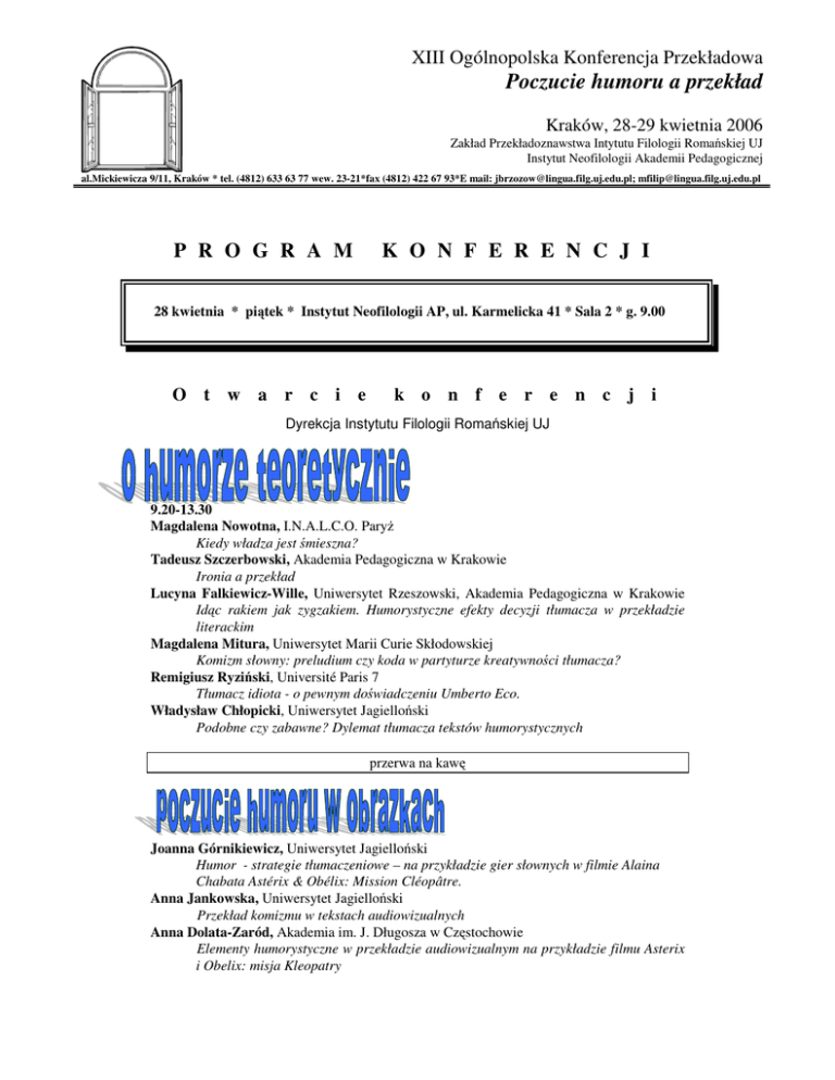 XIII Ogólnopolska Konferencja Przekładowa Poczucie humoru a przekład Kraków, 28-29 kwietnia 2006 Zakład Przekładoznawstwa Intytutu Filologii Roma skiej UJ Instytut Neofilologii Akademii Pedagogicznej al.Mickiewicza 9/11, Kraków * tel. (4812) 633 63 77 wew. 23-21*fax (4812) 422 67 93*E mail: [email protected]; [email protected] P R O G R A M K O N F E R E N C J I 28 kwietnia * pi tek * Instytut Neofilologii AP, ul. Karmelicka 41 * Sala 2 * g. 9.00 O t w a r c i e k o n f e r e n c j i Dyrekcja Instytutu Filologii Roma skiej UJ 9.20-13.30 Magdalena Nowotna, I.N.A.L.C.O. Pary Kiedy władza jest mieszna? Tadeusz Szczerbowski, Akademia Pedagogiczna w Krakowie Ironia a przekład Lucyna Falkiewicz-Wille, Uniwersytet Rzeszowski, Akademia Pedagogiczna w Krakowie Id c rakiem jak zygzakiem. Humorystyczne efekty decyzji tłumacza w przekładzie literackim Magdalena Mitura, Uniwersytet Marii Curie Skłodowskiej Komizm słowny: preludium czy koda w partyturze kreatywno ci tłumacza? Remigiusz Ryzi ski, Université Paris 7 Tłumacz idiota - o pewnym do wiadczeniu Umberto Eco. Władysław Chłopicki, Uniwersytet Jagiello ski Podobne czy zabawne? Dylemat tłumacza tekstów humorystycznych przerwa na kaw Joanna Górnikiewicz, Uniwersytet Jagiello ski Humor - strategie tłumaczeniowe – na przykładzie gier słownych w filmie Alaina Chabata Astérix & Obélix: Mission Cléopâtre. Anna Jankowska, Uniwersytet Jagiello ski Przekład komizmu w tekstach audiowizualnych Anna Dolata-Zaród, Akademia im. J. Długosza w Cz stochowie Elementy humorystyczne w przekładzie audiowizualnym na przykładzie filmu Asterix i Obelix: misja Kleopatry XIII Ogólnopolska Konferencja Przekładowa Poczucie humoru a przekład Kraków, 28-29 kwietnia 2006 Zakład Przekładoznawstwa Intytutu Filologii Roma skiej UJ Instytut Neofilologii Akademii Pedagogicznej al.Mickiewicza 9/11, Kraków * tel. (4812) 633 63 77 wew. 23-21*fax (4812) 422 67 93*E mail: [email protected]; [email protected] Michał Garcarz, Uniwersytet Wrocławski Humor a przekład – telewizyjne tłumaczenia ameryka skich komedii sytuacyjnych na j zyk polski Irina Kisielowa, Uniwersytet Kazimierza Wielkiego w Bydgoszczy Humor i argon w polskich przekładach współczesnego kina rosyjskiego D Y S K U S J A p r z e r w a n a o b i a d 13.30-15.00 15.00- 20.00 Urszula Paprocka-Piotrowska, Katolicki Uniwerwsytet Lubelski Z czego miej si Francuzi? Z czego miej si Polacy?O polskim przekładzie albumu „Asteriks na Korsyce” (Go cinny – Uderzo). El bieta Sierosławska, Akademia Pedagogiczna w Krakowie Humor (elementem) nazw dróg wspinaczkowych Adam Czesak, Polska Akademia Nauk, Kraków „Kajko i Kokosz" po l sku – szpas na serio Przemysław Chojnowski, Uniwersytet Viadrina Niemieckie perypetie z humorem ks. Jana Twardowskiego Anna Bednarczyk, Uniwersytet Łódzki Rzeczywisto skrzeczy po rosyjsku – o tłumaczeniu satyrycznych wierszy K.I.Gałczy skiego Przemysław Piekarski, Uniwersytet Jagiello ski, Czy kobieta mo e by ogniem? Humor słowny Amira Khusro Dehlevi. Krzysztof Mróz, Uniwersytet Warszawski, Mi dzy liryzmem a ironi , czyli poetycka metoda double linkage Baudelaire’a na przykładzie cyklu Spleenów – implikacje translatologiczne przerwa na kaw Paweł B k, Uniwersytet Rzeszowski, Humor w aforyzmach Stanisława Jerzego Leca w przekładzie na j zyk niemiecki. Bogdan Piotrowski, Uniwersytet w La Sabana, Kolumbia O niektórych elementach humoru w poezji Leona de Greiff i rado ciach tłumacza Piotr Sobolczyk, Uniwersytet Jagiello ski, Humor Białoszewskiego w przekładzie wybrane aspekty Edyta Manasterska-Wi cek, Uniwersytet Marii Curie Skłodowskiej Kalambury w wierszach dla dzieci oraz ich przekładach na j zyk rosyjski 2 XIII Ogólnopolska Konferencja Przekładowa Poczucie humoru a przekład Kraków, 28-29 kwietnia 2006 Zakład Przekładoznawstwa Intytutu Filologii Roma skiej UJ Instytut Neofilologii Akademii Pedagogicznej al.Mickiewicza 9/11, Kraków * tel. (4812) 633 63 77 wew. 23-21*fax (4812) 422 67 93*E mail: [email protected]; [email protected] Marta Detyna, Uniwersytet Jagiello ski Gra z cytatem filmowym i jego kontekstem w tzw. miesznych przekładach Dymitra Puczkowa Sebastian Nowakowski, Uniwersytet Jagiello ski Tak zwany " mieszny przekład" Goblina. Zabawa z oryginałem, rzeczywisto ci i kultur . Anna Matusiak, Uniwersytet Jagiello ski Jak hobbita Merry zrobiono w konia-humor nazw własnych w " miesznym "przekładzie "Władcy pier cieni" Małgorzata Zawadzka, Uniwersytet Warszawski, Pani pozwoli, Mademoiselle – czyli o kłopotach z komizmem słownym Jeana Tardieu Agnieszka Obidzi ska, Uniwersytet Warszawski, Ponge éponge, czyli ile tłumacz mo e wycisn z poety DY S K U S J A 3 XIII Ogólnopolska Konferencja Przekładowa Poczucie humoru a przekład Kraków, 28-29 kwietnia 2006 Zakład Przekładoznawstwa Intytutu Filologii Roma skiej UJ Instytut Neofilologii Akademii Pedagogicznej al.Mickiewicza 9/11, Kraków * tel. (4812) 633 63 77 wew. 23-21*fax (4812) 422 67 93*E mail: [email protected]; [email protected] 29 kwietnia * sobota * Instytut Neofilologii AP, ul. Karmelicka 41 * Sala 2 * g. 9.00 9.00-14.00 Tadeusz Borucki, Akademia Pedagogiczna w Krakowie Czytaj c Schulza po rosyjsku Irina Lappo, Uniwersytet Marii Curie Skłodowskiej Komizm czechowowski w przekładach polskich Marta Ka mierczak, Uniwersytet Łódzki, O niektórych aspektach humoru w utworach JRR Tolkiena w przekładach na j zyk polski i rosyjski Małgorzata Sieradzka, Uniwersytet Rzeszowski, Wybrane aspekty przekładu komizmu j zykowego na przykładzie Zemsty Aleksandra Fredry w tłumaczeniu na j zyk niemiecki Anna Majkiewicz, Uniwersytet l ski O poczuciu humoru austriackiej noblistki — Elfriede Jelinek Giselinde Kuipers, Erasmus Universiteit Rotterdam Humor and social background in Netherlands and the United States przerwa na kaw Jadwiga Konieczna-Twardzikowa, Akademia Polonijna w Cz stochowie Czy to jest humor czy kpina? Agnieszka Adamczyk, Uniwersytet Jagiello ski 