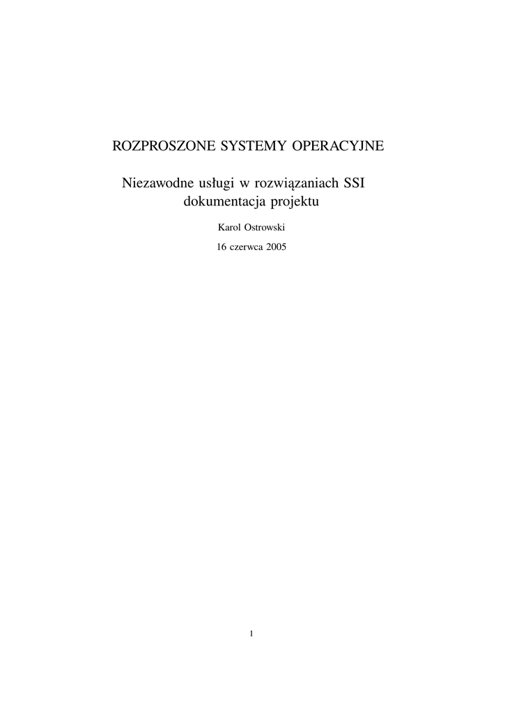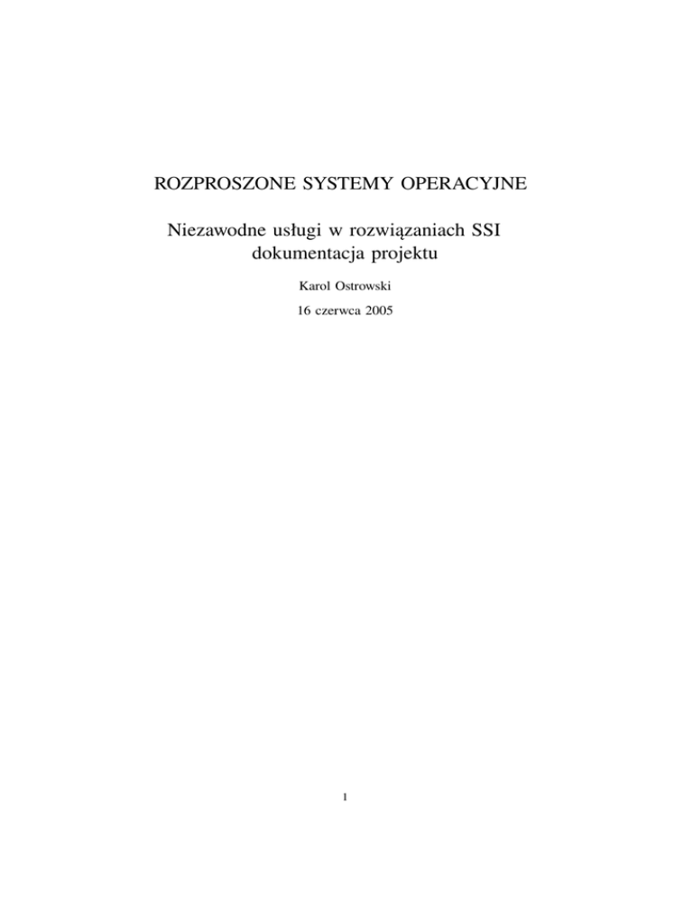 ROZPROSZONE SYSTEMY OPERACYJNE Niezawodne usługi w rozwiązaniach SSI dokumentacja projektu Karol Ostrowski 16 czerwca 2005 1 SPIS TREŚCI Spis treści 1 Wstęp 1.1 Kryteria oceny . . . . . . . . . . . . . . . . . . . . . . . . . . . . . 1.2 Rozwiązania . . . . . . . . . . . . . . . . . . . . . . . . . . . . . . . 3 3 3 2 Realizacja niezawodności oparta na systemach SSI 2.1 Zagadnienia związane z zapewnieniem niezawodności usług . . 2.1.1 Restart usługi na innym węźle (komputerze) w klastrze 2.1.2 Replikacja danych procesu usługi pomiędzy węzłami . 2.1.3 Możliwość rekonfiguracji usługi bez przerywania pracy 2.2 Wsparcie realizacji niezawodności usług w systemie OpenSSI . . . . . . 3 4 4 4 4 4 3 Projekt wstępny implementacji 3.1 Analiza zadania . . . . . . . . . . . . . . . . . . . . . . . . . . . . . 3.2 Dodatkowe funkcje dostępne w systemie OpenSSI . . . . . . . . . . 5 5 5 4 Implementacja 4.1 Wstęp . . . . . . . . . . . . . . 4.2 Zmiana założeń . . . . . . . . . 4.3 Komunikacja między procesami 4.4 Opis działania programu . . . . 6 6 6 7 8 5 Możliwe rozszerzenia 6 Zakończenie . . . . . . . . . . . . . . . . . . . . . . . . . . . . . . . . . . . . . . . . . . . . . . . . . . . . . . . . . . . . . . . . . . . . . . . . . . . . . . . . . . . . . . . . . . 9 10 2 2 1 REALIZACJA NIEZAWODNOŚCI OPARTA NA SYSTEMACH SSI Wstęp Realizacja niezawodności świadczonych usług stała się jednym z podstawowych zagadnień w tematyce sieci komputerowych. Dotyczy to zwłaszcza takich obszarów jak bankowość, gdzie przerwanie świadczenia usługi może wiązać się z dużymi stratami nie tylko materialnymi (utrata zaufania klientów). Na pewno nie podnosi również prestiżu portalowi internetowemu przerwanie działania z „przyczyn technicznych”. 1.1 Kryteria oceny Podstawowym kryterium oceny niezawodności usługi jest to jak moment potencjalnej awarii odczuje klient połączony z usługą. Możliwe są następujące warianty: • niewidoczna dla klienta naprawa awarii, • przerwanie i ponowne wznowienia sesji, • przerwanie i ponowne wznowienie sesji z utratą danych poprzedniej sesji, • przerwanie sesji i zawieszenie działania usługi na czas naprawy awarii, 1.2 Rozwiązania Najbardziej rozpowszechnionym modelem zapewniającym niezawodność świadczenia usług jest model „serwer macierzystym, serwer kopii” w którym dane, pliki konfiguracyjne z serwera podstawowego są powielane na inny (inne) komputery. W przypadku awarii serwera macierzystego następuje „przełączenie” na serwer kopii. Podstawową wadą takiego rozwiązania jest to że faktycznie rolę serwera spełnia w danym momencie tylko jeden komputer, natomiast pozostałe (kopie) do momentu awarii nie pełnią żadnej roli. Problem niezawodności świadczonych usług można również rozwiązywać stosując moduł wspierający rozproszone przetwarzanie danych (klaster). Klaster to zbiór niezależnych komputerów (węzłów), połączonych siecią komunikacyjną, które z punktu widzenia użytkownika są postrzegane jako pojedynczy system (komputer) . Klaster oprócz zwiększenia niezawodności zapewnia również zwiększenie szybkości i dostępności usług, choć te zagadnienia nie będą rozwijane w dalszej części pracy. 2 Realizacja niezawodności oparta na systemach SSI Wykorzystanie systemów rozproszonych (SSI) do realizacji niezawodności usług opiera się na odporności tych systemów na awarię pojedynczej maszyny (węzła). Jeżeli klaster zapewnia mechanizmy niewidocznej dla użytkownika obsługi awarii węzła, to zastosowanie rozproszonej architektury systemu operacyjnego korzystającej z wielu komputerów może być bardzo udanym sposobem uzyskania niezawodności systemu informatycznego. W systemach rozproszonych (SSI) najczęściej jeden węzeł pełni rolę zarządcy (CLMS Master). Jest on uruchamiany jako pierwszy i do niego „przyłączają” się pozostałe węzły. Nadzoruje on pracę pozostałych węzłów (przykładowo może nakazać odłączenie węzła). Nie musi być on jednak przypisany do jednego konkretnego węzła – w przypadku awarii możliwe jest przypisanie jego roli innemu węzłowi (wybranemu np. algorytmem elekcji). 3 2 REALIZACJA NIEZAWODNOŚCI OPARTA NA SYSTEMACH SSI 2.1 Zagadnienia związane z zapewnieniem niezawodności usług 2.1.1 Restart usługi na innym węźle (komputerze) w klastrze W przypadku awarii jednego węzła usługa powinna zostać jak najszybciej wznowiona na innym węźle, 2.1.2 Replikacja danych procesu usługi pomiędzy węzłami Zwiększa odporność klastra na awarie (aż do pełnej replikacji w której każdy węzeł replikuje swoje sesje do wszystkich pozostałych węzłów, przy takim rozwiązaniu wystarczy, że chociaż jeden z węzłów pozostanie sprawny, aby nie utracić informacji). 2.1.3 2.2 Możliwość rekonfiguracji usługi bez przerywania pracy Wsparcie realizacji niezawodności usług w systemie OpenSSI W systemie OpenSSI możemy określić pewne usługi które chcemy, aby były cały czas uruchomione w ramach klastra, ale tylko na jednym węźle jednocześnie (każda usługa tylko raz uruchomiona w ramach klastra). Nazywane są one kluczowymi usługami (CLMS Key Services). Podczas bootowania każdego węzeł zostaje określone, czy może być na nim wykonywana konkretna kluczowa usługa. Każda kluczowa usługa określa sposób postępowania podczas awarii węzła wywołując funkcję clms_register_key_service. W momencie wystąpienia awarii wśród węzłów klastra zostaje wybrany kolejny węzeł mający przejąć usługę. Zostają wywołane funkcje określone przez argumenty clms_register_key_service (failover function, pull data function, failover data function, server ready function), oraz ostaje zarejestrowana nowa procedura awaryjna (funkcja clms_register_key_service) dla nowego węzła. Można również określić procedurę odzyskiwania danych (pull_data routine). W momencie utraty węzła zostaje 