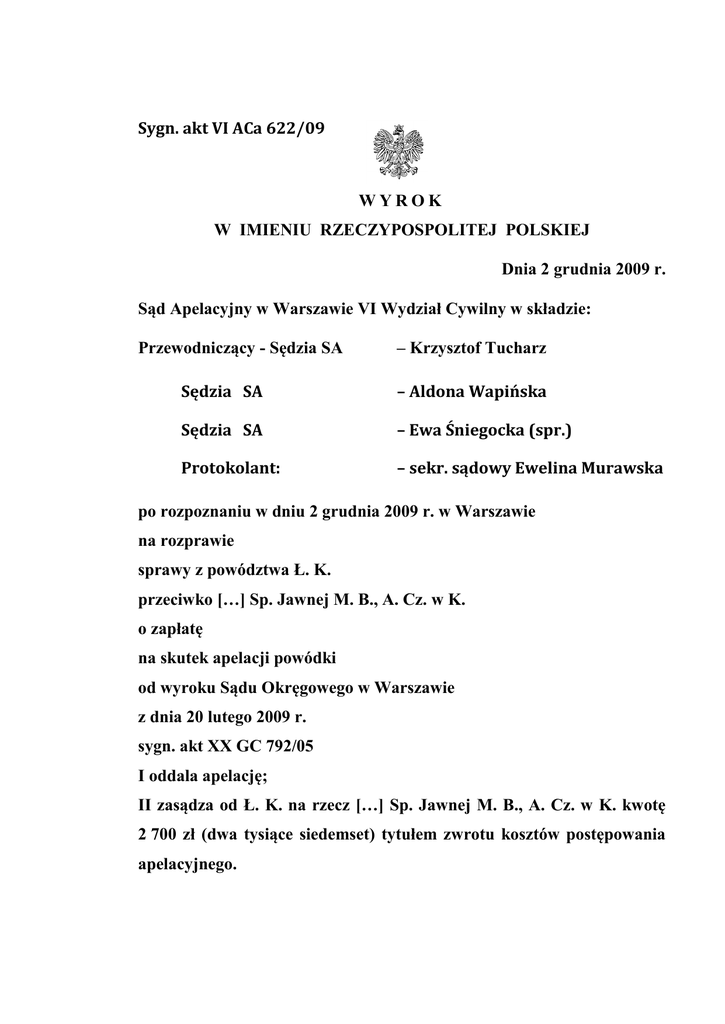 Sygn. akt VI ACa 622/09 WYROK W IMIENIU RZECZYPOSPOLITEJ POLSKIEJ Dnia 2 grudnia 2009 r. Sąd Apelacyjny w Warszawie VI Wydział Cywilny w składzie: Przewodniczący - Sędzia SA – Krzysztof Tucharz Sędzia SA – Aldona Wapińska Sędzia SA – Ewa Śniegocka (spr.) Protokolant: – sekr. sądowy Ewelina Murawska po rozpoznaniu w dniu 2 grudnia 2009 r. w Warszawie na rozprawie sprawy z powództwa Ł. K. przeciwko […] Sp. Jawnej M. B., A. Cz. w K. o zapłatę na skutek apelacji powódki od wyroku Sądu Okręgowego w Warszawie z dnia 20 lutego 2009 r. sygn. akt XX GC 792/05 I oddala apelację; II zasądza od Ł. K. na rzecz […] Sp. Jawnej M. B., A. Cz. w K. kwotę 2 700 zł (dwa tysiące siedemset) tytułem zwrotu kosztów postępowania apelacyjnego. 2 Sygn. akt VI A Ca 622/09 Uzasadnienie Zaskarżonym wyrokiem Sąd Okręgowy w Warszawie oddalił powództwo Ł. K. prowadzącej działalność gospodarczą pod nazwą […] w W. skierowane przeciwko […] Spółka Jawna M. B., A. Cz. w K. o zapłatę kwoty 50.747,40 zł tytułem odszkodowania za nienależyte wykonanie zobowiązań umownych. Sąd Okręgowy ustalił, co następuje: Powódka w dniu […] lipca 2003r kupiła od pozwanej trzy układy nadawcze typu GPS-GPRS TM SAT; dwa z nich o numerach […] i […] zostały w dniu […] lipca 2003r zainstalowane przez pracownika powódki T. R. w skuterach wodnych marki Yamaha i Kawasaki. Skutery te zostały przetransportowane z W. do miejscowości R.-N., gdzie miały być wypożyczane klientom. Po zainstalowaniu nadajników powódka zawarła z pozwaną umowę monitoringu technicznego i monitoringu ochronnego. W zakres usług monitoringu technicznego wchodziły: przyjmowanie, gromadzenie oraz przetwarzanie danych odbieranych z monitorowanych pojazdów na serwerze SpaceGUARD połączone z utworzeniem dla klienta na tym serwerze konta umożliwiającego właścicielowi pojazdu oraz osobom upoważnionym generowanie raportów zawierających dane odbierane z monitorowanego pojazdu. W zakres usługi monitoringu ochronnego wchodziło: odbieranie sygnałów alarmowych, ich weryfikacja oraz powiadamianie właściciela o zaistniałej sytuacji. Po kilkunastu dniach powódka uznała, iż nie ma żadnej kontroli nad pracą skuterów wodnych i nie może wyegzekwować należności za wynajem. W dniu […] sierpnia 2003r wystosowała do pozwanej pismo informujące o powyższym i zarzucające brak reakcji i zainteresowania sprawą; kolejne pismo wysłała w dniu […] sierpnia 2003r. T. R. udał się do miejsca, gdzie znajdowały się skutery, stwierdził, że akumulatory w skuterach są rozładowane, nie mógł skontaktować się z pracownikiem pozwanej spółki i przetransportował skutery do W. Powódka w piśmie z dnia […] sierpnia 2003r zażądała wyjaśnienia sprawy, zaś pozwana w odpowiedzi poinformowała o konieczności zmian w 3 instalacji. We wrześniu 2003r powódka zdemontowała nadajniki, a w marcu 2004r zażądała od pozwanej spółki zapłacenia odszkodowania w wysokości 49.870 zł, na którą to kwotę składały się koszty: zakupu trzech nadajników, montażu dwóch nadajników, serwisowania, transportu skuterów wodnych z W. do R.-N. i z powrotem oraz kwotę utraconych zarobków obliczoną na podstawie kosztorysu imprezy rekreacyjno-szkoleniowej sporządzonego przez firmę […]. Sąd Okręgowy uznał, iż powództwo nie zasługuje na uwzględnienie. W ocenie Sądu pozwana spółka wywiązała się należycie ze swych zobowiązań umownych, zaś oczekiwania powódki wykraczały poza warunki umowy. Na mocy zawartych z powódką umów pozwana miała obowiązek jedynie odbierania sygnałów alarmowych, ich weryfikację oraz powiadamianie właściciela o zaistniałej sytuacji, a także przyjmowania, gromadzenia i przetwarzania danych odbieranych z monitorowanych pojazdów oraz umożliwienia właścicielowi generowania raportów zawierających te dane, przy czym dostępność danych zależna była od zakresu dokonanej instalacji, natomiast powódka uważała, że obowiązkiem pozwanej jest całodobowy nadzór pojazdów i weryfikowanie godzin ich jazdy w formie drukowanych raportów. Zgodnie z Regulaminem świadczenia usług w zakresie monitorowania pojazdów w systemie lokalizacji pojazdów SpaceGUARD montaż nadajników powinien być dokonany przez Autoryzowaną Stację Instalacji z wyłączeniem osób postronnych (w tym także klienta), zaś w niniejszym przypadku urządzenia zostały zamontowane przez pracownika powódki, a pozwana wskazywała na wadliwość tego montażu. Nie ma potwierdzenia prawidłowości instalacji w postaci przeprowadzenia procedury testowej. Dla zapewnienia prawidłowego funkcjonowania nadajników konieczne jest zapewnienie stałego zasilania, tymczasem pracownik powódki informował o rozładowaniu akumulatorów. Z zeznań świadków wynika, iż wskutek niewłaściwego montażu skutery nie miały podłączonych wszystkich funkcji, a do pozwanej nadchodziły fałszywe alarmy. Powyższe wskazuje na to, że to sama powódka swymi działaniami uniemożliwiła prawidłowe generowanie danych, które pozwoliłyby na weryfikowanie czasu pracy skuterów. Rozliczanie kosztów wynajmu skuterów jest możliwe także przy pomocy innych metod niż nadajniki GPS. Uszkodzenia tych nadajników powódka nigdy nie zgłaszała. Wątpliwości 4 budzi także sam sposób wyliczenia szkody. Powódka zakupiła wprawdzie trzy nadajniki, ale zastrzeżenia zgłaszała tylko w stosunku do dwóch zamontowanych w skuterach wodnych, poza tym koszty określone jako rzeczywista strata nie pozostają w normalnym związku przyczynowym z utrudnieniem lub niemożliwością wynajmowania skuterów wodnych; nadto powódka nie wykazała, że żądaną przez siebie kwotę jako dochód z wynajmu skuterów rzeczywiście osiągnęłaby (lub wcześniej osiągała). Z powyższych przyczyn Sąd Okręgowy uznał powództwo za niezasadne i orzekł, jak w wyroku. Apelację od tego wyroku złożyła powódka. Zar