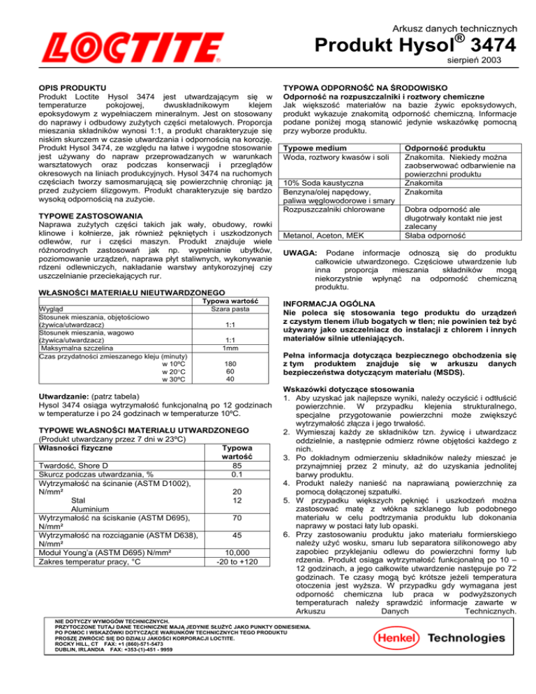Arkusz danych technicznych Produkt Hysol® 3474 sierpień 2003 OPIS PRODUKTU Produkt Loctite Hysol 3474 jest utwardzającym się w temperaturze pokojowej, dwuskładnikowym klejem epoksydowym z wypełniaczem mineralnym. Jest on stosowany do naprawy i odbudowy zużytych części metalowych. Proporcja mieszania składników wynosi 1:1, a produkt charakteryzuje się niskim skurczem w czasie utwardzania i odpornością na korozję. Produkt Hysol 3474, ze względu na łatwe i wygodne stosowanie jest używany do napraw przeprowadzanych w warunkach warsztatowych oraz podczas konserwacji i przeglądów okresowych na liniach produkcyjnych. Hysol 3474 na ruchomych częściach tworzy samosmarującą się powierzchnię chroniąc ją przed zużyciem ślizgowym. Produkt charakteryzuje się bardzo wysoką odpornością na zużycie. TYPOWE ZASTOSOWANIA Naprawa zużytych części takich jak wały, obudowy, rowki klinowe i kołnierze, jak również pękniętych i uszkodzonych odlewów, rur i części maszyn. Produkt znajduje wiele różnorodnych zastosowań jak np. wypełnianie ubytków, poziomowanie urządzeń, naprawa płyt staliwnych, wykonywanie rdzeni odlewniczych, nakładanie warstwy antykorozyjnej czy uszczelnianie przeciekających rur. WŁASNOŚCI MATERIAŁU NIEUTWARDZONEGO Wygląd Stosunek mieszania, objętościowo (żywica/utwardzacz) Stosunek mieszania, wagowo (żywica/utwardzacz) Maksymalna szczelina Czas przydatności zmieszanego kleju (minuty) w 10ºC w 20°C w 30ºC Typowa wartość Szara pasta 1:1 1:1 1mm 180 60 40 Utwardzanie: (patrz tabela) Hysol 3474 osiąga wytrzymałość funkcjonalną po 12 godzinach w temperaturze i po 24 godzinach w temperaturze 10ºC. TYPOWE WŁASNOŚCI MATERIAŁU UTWARDZONEGO (Produkt utwardzany przez 7 dni w 23ºC) Własności fizyczne Typowa wartość Twardość, Shore D 85 Skurcz podczas utwardzania, % 0.1 Wytrzymałość na ścinanie (ASTM D1002), N/mm² 20 Stal 12 Aluminium Wytrzymałość na ściskanie (ASTM D695), 70 N/mm² Wytrzymałość na rozciąganie (ASTM D638), 45 N/mm² Moduł Young’a (ASTM D695) N/mm² 10,000 Zakres temperatur pracy, °C -20 to +120 TYPOWA ODPORNOŚĆ NA ŚRODOWISKO Odporność na rozpuszczalniki i roztwory chemiczne Jak większość materiałów na bazie żywic epoksydowych, produkt wykazuje znakomitą odporność chemiczną. Informacje podane poniżej mogą stanowić jedynie wskazówkę pomocną przy wyborze produktu. Typowe medium Woda, roztwory kwasów i soli 10% Soda kaustyczna Benzyna/olej napędowy, paliwa węglowodorowe i smary Rozpuszczalniki chlorowane Metanol, Aceton, MEK Odporność produktu Znakomita. Niekiedy można zaobserwować odbarwienie na powierzchni produktu Znakomita Znakomita Dobra odporność ale długotrwały kontakt nie jest zalecany Słaba odporność UWAGA: Podane informacje odnoszą się do produktu całkowicie utwardzonego. Częściowe utwardzenie lub inna proporcja mieszania składników mogą niekorzystnie wpłynąć na odporność chemiczną produktu. INFORMACJA OGÓLNA Nie poleca się stosowania tego produktu do urządzeń z czystym tlenem i/lub bogatych w tlen; nie powinien też być używany jako uszczelniacz do instalacji z chlorem i innych materiałów silnie utleniających. Pełna informacja dotycząca bezpiecznego obchodzenia się z tym produktem znajduje się w arkuszu danych bezpieczeństwa dotyczącym materiału (MSDS). Wskazówki dotyczące stosowania 1. Aby uzyskać jak najlepsze wyniki, należy oczyścić i odtłuścić powierzchnie. W przypadku klejenia strukturalnego, specjalne przygotowanie powierzchni może zwiększyć wytrzymałość złącza i jego trwałość. 2. Wymieszaj każdy ze składników tzn. żywicę i utwardzacz oddzielnie, a następnie odmierz równe objętości każdego z nich. 3. Po dokładnym odmierzeniu składników należy mieszać je przynajmniej przez 2 minuty, aż do uzyskania jednolitej barwy produktu. 4. Produkt należy nanieść na naprawianą powierzchnię za pomocą dołączonej szpatułki. 5. W przypadku większych pęknięć i uszkodzeń można zastosować matę z włókna szklanego lub podobnego materiału w celu podtrzymania produktu lub dokonania naprawy w postaci łaty lub opaski. 6. Przy zastosowaniu produktu jako materiału formierskiego należy użyć wosku, smaru lub separatora silikonowego aby zapobiec przyklejaniu odlewu do powierzchni formy lub rdzenia. Produkt osiąga wytrzymałość funkcjonalną po 10 – 12 godzinach, a jego całkowite utwardzenie następuje po 72 godzinach. Te czasy mogą być krótsze jeżeli temperatura otoczenia jest wyższa. W przypadku gdy wymagana jest odporność chemiczna lub praca w podwyższonych temperaturach należy sprawdzić informacje zawarte w Arkuszu Danych Technicznych. NIE DOTYCZY WYMOGÓW TECHNICZNYCH. PRZYTOCZONE TUTAJ DANE TECHNICZNE MAJĄ JEDYNIE SŁUŻYĆ JAKO PUNKTY ODNIESIENIA. PO POMOC I WSKAZÓWKI DOTYCZĄCE WARUNKÓW TECHNICZNYCH TEGO PRODUKTU PROSZĘ ZWRÓCIĆ SIĘ DO DZIAŁU JAKOŚCI KORPORACJI LOCTITE. ROCKY HILL, CT FAX: +1 (860)-571-5473 DUBLIN, IRLANDIA FAX: +353-(1)-451 - 9959 TDS Hysol®3474 sierpień 2003 UWAGA: Ze względu na wydzielanie ciepła podczas utwardzania proces ten może przebiegać szybciej gdy objętość produktu jest duża. 7. Nadmiar kleju można usunąć rozpuszczalnikiem organicznym (np. acetonem). 8. Złącze powinno pozostawać w zacisku do czasu ustalenia się kleju. Nie należy obciążać złącza, dopóki nie osiągnie ono pełnej wytrzymałości. 9. Urządzenie mieszające i dozujące należy umyć gorącą wodą mydlaną, zanim klej stwardnieje. Magazynowanie O ile na etykiecie produktu nie ma innych wskazań, idealnym sposobem jego przechowywania będzie pozostawienie go w zamkniętych pojemnikach w chłodnym i suchym pomieszczeniu w temperaturze pomiędzy 8oC a 21oC (46°F do 70°F). Optymalna temperatura to dolna połowa tego zakresu. Resztek materiału nie należy umieszczać z powrotem w jego oryginalnym pojemniku, gdyż mogłoby dojść do zanieczysz