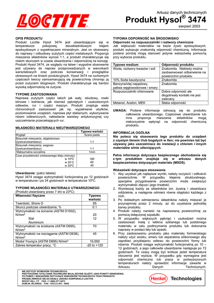 Produkt Hysol 3474 - ALFA Uszczelnienia Techniczne