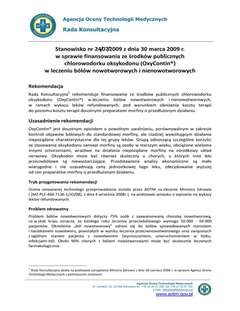 Agencja Oceny Technologii Medycznych Rada Konsultacyjna Stanowisko nr 24/07/2009 z dnia 30 marca 2009 r. w sprawie finansowania ze środków publicznych chlorowodorku oksykodonu (OxyContin®) w leczeniu bólów nowotworowych i nienowotworowych Rekomendacja Rada Konsultacyjna1 rekomenduje finansowanie ze środków publicznych chlorowodorku oksykodonu (OxyContin®) w leczeniu bólów nowotworowych i nienowotworowych, w ramach wykazu leków refundowanych, pod warunkiem obniżenia kosztu terapii do poziomu kosztu terapii doustnymi preparatami morfiny o przedłużonym działaniu. Uzasadnienie rekomendacji OxyContin® jest doustnym opioidem o powolnym uwalnianiu, porównywalnym w zakresie kontroli objawów bólowych do standardowej morfiny, ale rzadziej wywołującym działania niepożądane charakterystyczne dla tej grupy leków. Grupą odnoszącą szczególne korzyści ze stosowania oksykodonu zamiast morfiny są osoby w starszym wieku, obciążone wieloma innymi schorzeniami, wrażliwe na działania niepożądane morfiny na ośrodkowy układ nerwowy. Oksykodon może być również skuteczny u chorych, u których inne leki przeciwbólowe są niewystarczające. Przedstawione analizy ekonomiczne są mało wiarygodne i nie uzasadniają ceny jednostkowej tego leku, zdecydowanie wyższej od cen preparatów morfiny o przedłużonym działaniu. Tryb przygotowania rekomendacji Ocena omawianej technologii przeprowadzona została przez AOTM na zlecenie Ministra Zdrowia ( [MZ-PLE-460-7136-1/JO/08], z dnia 4 września 2008r.), na podstawie wniosku o wpisanie na wykazy leków refundowanych. Problem zdrowotny Problem bólów nowotworowych dotyczy 75% osób z zaawansowaną chorobą nowotworową, co w skali kraju oznacza, że każdego roku leczenia przeciwbólowego wymaga 50 000 - 64 000 pacjentów. Określenie „ból nowotworowy” odnosi się do bólów spowodowanych rozrostem i naciekaniem nowotworu, powstałych w wyniku leczenia przeciwnowotworowego oraz związanych z ogólnym stanem pacjenta z nowotworem (wyniszczeniem, unieruchomieniem w łóżku, infekcjami itd). Około 90% chorych z bólami nowotworowymi może być skutecznie leczonych farmakologicznie. 1 Rada Konsultacyjna działa na podstawie zarządzenia Ministra Zdrowia z dnia 30 czerwca 2006 r. w sprawie Agencji Oceny Technologii Medycznych z późniejszymi zmianami. Agencja Oceny Technologii Medycznych Al. Lotników 22, 02-668 Warszawa tel. +48 22 56 67 200 fax +48 22 56 67 202 e-mail: [email protected] www.aotm.gov.pl Stanowisko Rady Konsultacyjnej AOTM nr 24/07/2009 z dnia 30 marca 2009 r. Obecna standardowa terapia Leczenie bólu powinno odbywać się zgodnie z zasadami określonymi w tzw. „drabinie przeciwbólowej”, która zakłada stosowanie coraz mocniejszych analgetyków w miarę narastania bólu. Leczenie rozpoczyna się za pomocą prostych analgetyków (np. ibuprofen), następnie dołącza się słaby opioid (tramadol, kodeina), który w trzecim etapie zamienia się na mocny opioid (morfina, fentanyl). Terapia powinna obejmować również wszechstronne leczenie uzupełniające. [1] Opioidy wskazane są również w leczeniu bólów ostrych o dużym nasileniu oraz bólów przewlekłych, trwających ponad 3 miesiące, gdy inne metody leczenia, w tym program leczenia wielodyscyplinarnego i chirurgicznego, okazały się nieskuteczne lub powodowały objawy niepożądane. Podstawowym celem w opiece nad chorym z bólem powinno być zniesienie bólu. Zalecane jest stosowanie preparatów o zmodyfikowanym uwalnianiu substancji czynnej i podawanie ich w regularnych odstępach czasu. Leczenie powinno być monitorowane. [2] Podstawowymi silnymi opioidami stosowanymi w praktyce klinicznej w Polsce są morfina (głównie w postaci preparatów o przedłużonym działaniu) i fentanyl w postaci plastrów. Inne silne opioidy (metadon, buprenorfina) nie są w Polsce popularne. [3] Proponowana terapia Oksykodon jest agonistą receptorów opioidowych, nieposiadającym działania przeciwstawnego, wykazującym powinowactwo do receptorów opioidowych kappa, mi i delta w mózgu, rdzeniu kręgowym i narządach obwodowych, działającym przeciwbólowo i uspakajająco. Oksykodon jest zarejestrowany w leczeniu bólu o umiarkowanym lub dużym nasileniu. Dawka początkowa dla pacjenta, który nie przyjmował wcześniej opioidów, wynosi 10 mg doustnie na 12 godzin. OxyContin jest dostępny w postaci tabletek o przedłużonym uwalnianiu w dawkach 5, 10, 20, 40 i 80 mg. [4] Skuteczność proponowanej terapii Przedstawione dowody naukowe mają ograniczoną wiarygodność, ze względu na małe grupy pacjentów objęte badaniami oraz krótki czas trwania obserwacji i nie wykazują przewagi efektywności klinicznej oksykodonu o przedłużonym uwalnianiu nad innymi silnymi opioidami w postaci preparatów o przedłużonym uwalnianiu. W leczeniu bólu nowotworowego oksykodon ma działanie porównywalne do morfiny, hydromorfonu oraz oksymorfonu w zakresie łagodzenia bólu, uspokojenia pacjenta oraz subiektywnej opinii pacjenta i lekarza. Nie wykazano istotnych statystycznie różnic pomiędzy tymi preparatami dla wymienionych punktów końcowych. W neuralgii półpaścowej oraz neuropatii cukrzycowej wykazano istotną przewagę oksykodonu nad placebo dla większości badanych punktów końcowych, w tym jakości życia mierzonej generycznym kwestionariuszem SF-36. Bezpieczeństwo terapii Najczęstszymi działaniami niepożądanymi oksykodonu są zaparcia, nadmierne uspokojenie oraz duszność. Preparat ten może powodować uzależnienie. [4] Wyniki badań klinicznych wskazują, że oksykodon ma podobny profil bezpieczeństwa do innych silnych opioidów. Nie wykazano istotnych różnic pomiędzy preparatami w częstości występowania działań niepożądanych charakterystycznych dla tej grupy leków. [5] Koszty terapii i wpływ na budżet płatnika Przedstawiona analiza ekonomiczna wskazuje na około czterokrotnie wyższy koszt rocznej terapii oksykodonem o przedłużonym