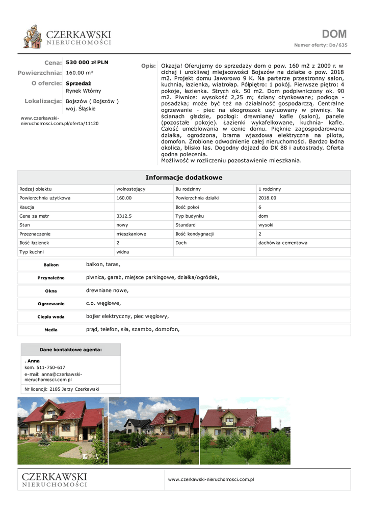 DOM Numer oferty: Do/635 Cena: 530 000 zł PLN Powierzchnia: 160.00 m² O ofercie: Sprzedaż Rynek Wtórny Lokalizacja: Bojszów ( Bojszów ) woj. Śląskie www.czerkawskinieruchomosci.com.pl/oferta/11120 Opis: Okazja! Oferujemy do sprzedaży dom o pow. 160 m2 z 2009 r. w cichej i urokliwej miejscowości Bojszów na działce o pow. 2018 m2. Projekt domu Jaworowo 9 K. Na parterze przestronny salon, kuchnia, łazienka, wiatrołap. Półpiętro: 1 pokój. Pierwsze piętro: 4 pokoje, łazienka. Strych ok. 50 m2. Dom podpiwniczony ok. 90 m2. Piwnice: wysokość 2,25 m; ściany otynkowane; podłoga posadzka; może być też na działalność gospodarczą. Centralne ogrzewanie - piec na ekogroszek usytuowany w piwnicy. Na ścianach gładzie, podłogi: drewniane/ kafle (salon), panele (pozostałe pokoje). Łazienki wykafelkowane, kuchnia- kafle. Całość umeblowania w cenie domu. Pięknie zagospodarowana działka, ogrodzona, brama wjazdowa elektryczna na pilota, domofon. Zrobione odwodnienie całej nieruchomości. Bardzo ładna okolica, blisko las. Dogodny dojazd do DK 88 i autostrady. Oferta godna polecenia. Możliwość w rozliczeniu pozostawienie mieszkania. Informacje dodatkowe Rodzaj obiektu wolnostojący Ilu rodzinny 1 rodzinny Powierzchnia użytkowa 160.00 Powierzchnia działki 2018.00 Kaucja Ilość pokoi 6 Cena za metr 3312.5 Typ budynku dom Stan nowy Standard wysoki Przeznaczenie mieszkaniowe Ilość kondygnacji 2 Ilość łazienek 2 Dach dachówka cementowa Typ kuchni widna Balkon Przynależne Okna balkon, taras, piwnica, garaż, miejsce parkingowe, działka/ogródek, drewniane nowe, Ogrzewanie c.o. węglowe, Ciepła woda bojler elektryczny, piec węglowy, Media prąd, telefon, siła, szambo, domofon, Dane kontaktowe agenta: . Anna kom. 511-750-617 e-mail: [email protected] Nr licencji: 2185 Jerzy Czerkawski www.czerkawski-nieruchomosci.com.pl