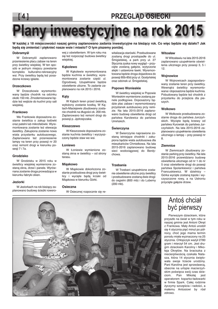 [4] PRZEGLĄD OSIECKI Plany inwestycyjne na rok 2015 W każdej z 18 miejscowości naszej gminy zaplanowano zadania inwestycyjne na bieżący rok. Co więc będzie się działo? Jak będą się zmieniać i pięknieć nasze wsie i miasto? O tym piszemy poniżej. Dobramyśl W Dobramyśli zaplanowano przeniesienie placu zabaw na teren przy świetlicy wiejskiej. W ten sposób w jednym miejscu powstanie kompleks kulturalno-rekreacyjny wsi. Przy świetlicy będą też posadzone krzewy iglaste. Drzeczkowo W Drzeczkowie wyremontowany będzie chodnik na odcinku około 150 mb. Zmodernizowane będzie też wejście do kuchni przy sali wiejskiej. Frankowo We Frankowie doposażona zostanie świetlica o zakup lodówki oraz patelni lub mikrofalówki. Wyremontowana zostanie też elewacja świetlicy. Zakupiona zostanie nowa wiata przystanku autobusowego. Zaplanowano też przeniesienie lampy na teren przy posesji nr 20 oraz remont drogi w kierunku posesji 7 i 7a. Grodzisko W Grodzisku w 2015 roku w świetlicy wiejskiej wymienione zostaną okna, drzwi i panele. Wyrównana zostanie droga prowadząca w kierunku fabryki okien. Jeziorki W Jeziorkach na rok bieżący zaplanowano budowę ścieżki rowero- wej z oświetleniem. W tym roku ma się też rozpocząć budowa świetlicy wiejskiej. Kąkolewo W Kąkolewie wyremontowana będzie kuchnia w świetlicy, wyremontowana zostanie część ul. Ogrodowej. Uzupełniane będzie oświetlenie uliczne. To zadanie zaplanowano na rok 2015 i 2016. Kąty W Kątach teren przed świetlicą wyłożony zostanie kostką. W Kątach-Maciejewie zbudowany zostanie chodnik na długości ok. 200 mb. Zaplanowano też remont drogi do posesji p. Jędrzejczaka. Kleszczewo W Kleszczewie doposażona zostanie kuchnia świetlicy i wyczyszczony będzie staw we wsi. Łoniewo W Łoniewie wymienione zostaną okna w świetlicy – od strony tarasu. witalizacja starówki. Przebudowane zostaną drogi prostopadłe do ul. Śmigielskiej, a park przy ul. 27 Stycznia zyska nowy wygląd – przycięte zostaną gałęzie, wytyczone alejki i ustawione ławki. Wyremontowana będzie droga dojazdowa do posesji 85b-85d przy ul. Gostyńskiej oraz odcinek ul. Śmigielskiej. Popowo Wonieskie W świetlicy wiejskiej w Popowie Wonieskim wymienione zostaną panele podłogowe. Doposażony będzie plac zabaw i wyremontowany przystanek autobusowy przy remizie. Na lata 2015-2016 zaplanowano budowę oświetlenia drogi od państwa Karolewicz do państwa Umińskich. Świerczyna W Świerczynie naprawione zostaną istniejące chodniki i zakupiona będzie wiata autobusowa dla mieszkańców Chmielkowa. Na lata 2015-2016 zaplanowano budowę sieci wodociągowej do Berdychowa. Miąskowo Trzebania W Miąskowie dokończona zostanie przebudowa drogi przy świetlicy i wycięte będą krzaki od Miąskowa w kierunku Górki. W Trzebani uzupełnione zostanie oświetlenie uliczne przy świetlicy i przebudowane zostaną dwie drogi: do cegielni (800 mb) i do Lubemy (200 mb). Osieczna Witosław W Witosławiu na lata 2015-2016 zaplanowano uzupełnienie oświetlenia ulicznego przy posesji 3, 5 i 12. Wojnowice W Wojnowicach zagospodarowany zostanie teren przy świetlicy. Wewnątrz świetlicy wyremontowana i doposażona będzie kuchnia. Pobudowany będzie też chodnik z przystanku do przejścia dla pieszych. Wolkowo W Wolkowie przebudowana zostanie droga do państwa Jurczyńskich. Wycięte będą krzewy od państwa Kurowiak do państwa Jurczyńskich. Na lata 2015-2016 zaplanowano uzupełnienie oświetlenia ulicznego o lampę – przy posesji nr 8. Ziemnice W Ziemnicach zbudowany zostanie parking przy świetlicy. Na lata 2015-2016 przewidziano budowę oświetlenia ulicznego od nr 1 do nr 5 oraz oświetlenie drogi do posesji państwa Spolankiewicz i państwa Francuskiewicz. W dzielnicy – Górka wycięte zostaną topole i wyczyszczone rowy, a na Ustroniu przycięte gałęzie drzew. W Osiecznej rozpocznie się re- Antoś chciał być pierwszy Pierwszym dzieckiem, które przyszło na świat w tym roku w naszej gminie jest Antoni Okręt z Frankowa. Mały Antoś urodził się 4 stycznia pięć minut po północy, choć jego mama termin porodu miała wyznaczony na 25 stycznia. Chłopczyk ważył 2780 gram i mierzył 54 cm. Jest drugim dzieckiem Karoliny i Mikołaja Okrętów. Na braciszka z niecierpliwością czekała Natasza, która 14 stycznia świętowała swoje trzecie urodziny. Pani Karolina jest sprzedawcą, obecnie na urlopie macierzyńskim poświęca swój czas dzieciom. Pan Mikołaj jest operatorem koparko-ładowarki w firmie Spark. Całej rodzinie życzymy szczęścia i radości, a małemu Antosiowi by rósł zdrowo.