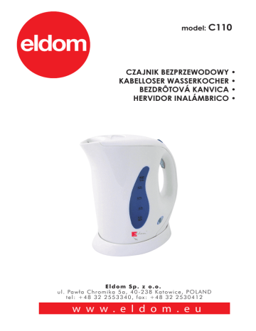 model: C110 CZAJNIK BEZPRZEWODOWY • KABELLOSER WASSERKOCHER • BEZDRÔTOVÁ KANVICA • HERVIDOR INALÁMBRICO • Eldom Sp. z o.o. u l . Pa w ł a C h r o m i k a 5 a , 4 0 - 2 3 8 Ka t o w i c e , P O L A N D tel: +48 32 2553340, fax: +48 32 2530412 w w w . e l d o m . e u WSKAZÓWKI BEZPIECZEŃSTWA - przed pierwszym użyciem prosimy uważnie zapoznać się z całością treści niniejszej instrukcji - przewód przyłączeniowy podstawki zasilającej należy podłączyć do gniazdka o prametrach zgodnych z podanymi w instrukcji wyposażonego w kołek ochronny - urządzenie ustawić na stabilnym i suchym podłożu - nie zanurzać przewodu lub urządzenia w wodzie, - urządzenie należy odłączać od sieci zawsze poprzez pociągnięcie za wtyczkę a nie za przewód zasilający - nie używać na wolnym powietrzu, - urządzenie przeznaczone jest tylko do użytku domowego, - nie należy stawiać urządzenia w pobliżu źródeł ciepła - przed włączeniem trzeba upewnić się czy w dzbanku jest woda. Nie należy uruchamiać dzbanka bez wody - nie wolno nalewać powyżej poziomu max na wskaźniku Przepełnienie dzbanka grozi niekontrolowanym wypływem gorącej wody na zewnątrz (grozi to zalaniem połączeń elektrycznych i zwarciem) - dzbanek włączony do sieci lub zawierający gorącą wodę - pozostawiony bez nadzoru może być niebezpieczny dla dzieci - wyłączyć urządzenie z sieci, jeśli nie jest już ono używane oraz przed jego czyszczeniem - Niniejszy sprzęt może być użytkowany przez dzieci w wieku co najmniej 8 lat i przez osoby o obniżonych możliwościach fizycznych, umysłowych i osoby o braku doświadczenia i znajomości sprzętu, jeżeli zapewniony zostanie nadzór lub instruktaż odnośnie do użytkowania sprzętu w bezpieczny sposób, tak aby związane z tym zagrożenia były zrozumiałe. Dzieci nie powinny bawić się sprzętem. Dzieci bez nadzoru nie powinny wykonywać czyszczenia i konserwacji sprzętu. - należy uważać na wydobywającą się z dzbanka podczas gotowania gorącą parę - dzbanek może być używany tylko z dołączoną, oryginalną podstawą - nie przenosić ani nie przesuwać w trakcie użytkowania - sprzęt tylko do użytku domowego, przy eksploatacji przemysłowej, niezgodnej z przeznaczeniem lub wbrew niniejszej instrukcji sprzedawca nie ponosi żadnej odpowiedzialności a uprawnienia z tytułu gwarancji wygasają 2 WSKAZÓWKI BEZPIECZEŃSTWA - nie używać w przypadku uszkodzenia przewodu zasilającego, gdy urządzenie spadło lub zostało uszkodzone w inny sposób. Naprawę urządzenia należy powierzyć autoryzowanemu serwisowi; wykaz serwisów w załączniku oraz na stronie www.eldom.eu, - napraw sprzętu może dokonać jedynie autoryzowany punkt serwisowy. Wszelkie modernizacje lub stosowanie innych niż oryginalne części zamiennych lub elementów urządzenia jest zabronione i zagraża bezpieczeństwu użytkowania. - Firma Eldom Sp. z o. o. nie ponosi odpowiedzialności za ewentualne szkody powstałe w wyniku niewłaściwego używania urządzenia. OCHRONA ŚRODOWISKA - urządzenie jest zbudowane z materiałów, które mogą być poddane ponownemu przetwarzaniu lub recyklingowi - należy je przekazać do odpowiedniego punktu, który zajmuje się zbieraniem i recyklingiem urządzeń elektrycznych i elektronicznych. GWARANCJA - urządzenie przeznaczone jest do użytku prywatnego w gospodarstwie domowym - nie może być używane do celów zawodowych - gwarancja traci ważność w przypadku nieprawidłowej obsługi. Szczegółowe warunki gwarancji w załączniku. 3 1 OPIS OGÓLNY 1. Odchylana pokrywa 2. Wylewka + filtr siatkowy 3. Podstawa 4. Wskaźnik poziomu wody 5. Lampka kontrolna 6. Uchwyt 7. Włącznik 7 2 DANE TECHNICZNE - moc: 800W - napięcie zasilania: 230V ~ 50Hz - poj. 0,6 l - zabezpieczenie sieci 10 A - klasa izolacji ochronnej I 6 5 4 3 UŻYTKOWANIE URZĄDZENIA Dzbanek bezprzewodowy C110 przeznaczony jest wyłącznie do gotowania lub podgrzewania wody. Jednorazowo można zagotować od 0,2 do 0,6 l wody. Poziom wody wskazuje podziałka (4) znajdująca się na obudowie dzbanka. Podstawę urządzenia (3) należy ustawić na płaskiej powierzchni. W podstawie jest miejsce na nadmiar przewodu. Ważne by przewód był wyprowadzony z podstawy (3) przez specjalny rowek. Przed pierwszym użyciem dzbanek należy umyć oraz 2-3 krotnie zagotować wodę i wylać. Czajnik można napełniać bezpośrednio przez wylewkę (2), lub po otwarciu pokrywy (1). Nie należy napełniać dzbanka kiedy stoi na podstawie. Filtr musi być założony podczas gotowania. Dzbanek rozpoczyna pracę po włączeniu przycisku (7). Praca urządzenia sygnalizowana jest lampką kontrolną (5). Dzbanek wyłącza się automatycznie po zagotowaniu wody. 4 Pokrywa (1) musi być zamknięta w czasie gotowania. W przeciwnym wypadku nie zadziała automatyczny wyłącznik. Pracę urządzenia można przerwać w dowolnym momencie przełącznikiem (7). Dzbanek wyłącza się automatycznie w przypadku wygotowania sie wody. Posiada również zabezpieczenie, które przerywa obwód grzejny w przypadku włączenia urządzenia bez wody, jednakże włączenie czajnika bez wody powoduje uszkodzenie z winy klienta i utratę gwarancji. CZYSZCZENIE I KONSERWACJA - czyścić wolno tylko zimne urządzenie, - podczas mycia nie wolno zanurzać dzbanka w wodzie, - zewnętrzne powierzchnie można czyścić przy pomocy wilgotnej ściereczki z dodatkiem płynu do mycia naczyń, - osad z wody na wewnętrznych powierzchniach należy usuwać ściereczką zwilżoną w occie, po czym imbryk wypłukać czystą wodą - w przypadku osadzania się kamienia wapiennego na grzałce należy go regularnie usuwać w podany niżej sposób: - zagotować w dzbanku - 0,5 l wody - wyłączyć dzbanek oraz wyjąć wtyczkę z kontaktu - wlać do dzbanka - 0,1l octu - pozostawić roztwór na kilka godzin w imbryku - wylać roztwór, wypłukać czajnik czystą wodą - zagotować w dzbanku wodę w ilości 0,6l - wy