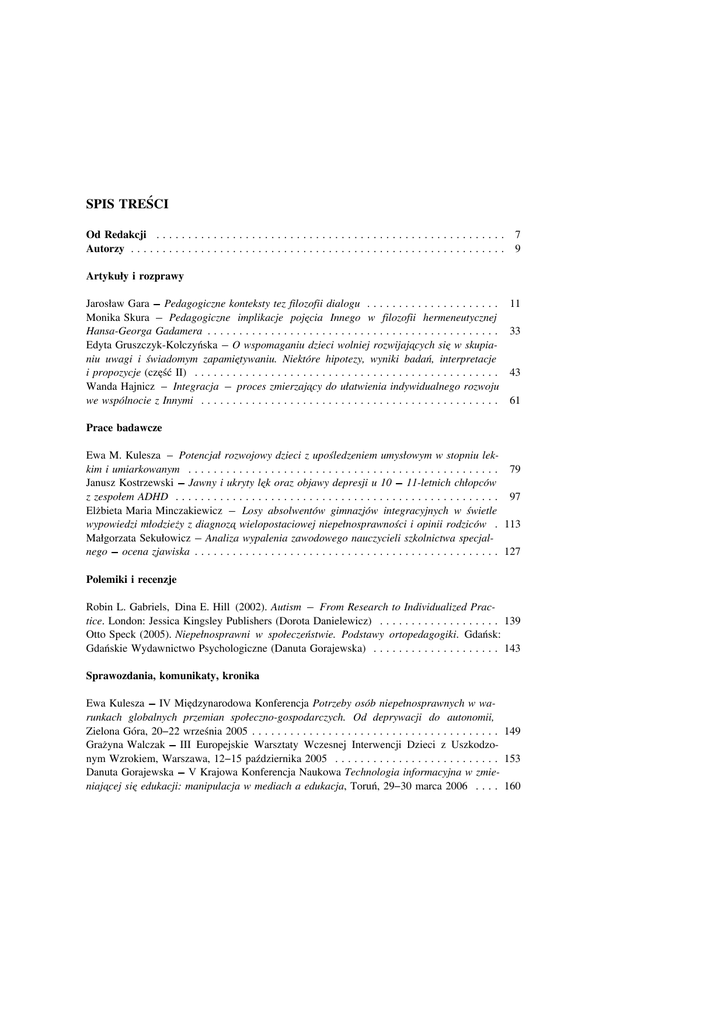 SPIS TREŚCI Od Redakcji . . . . . . . . . . . . . . . . . . . . . . . . . . . . . . . . . . . . . . . . . . . . . . . . . . . . . . . Autorzy . . . . . . . . . . . . . . . . . . . . . . . . . . . . . . . . . . . . . . . . . . . . . . . . . . . . . . . . . . . 7 9 Artykuły i rozprawy Jarosław Gara Pedagogiczne konteksty tez filozofii dialogu . . . . . . . . . . . . . . . . . . . . . Monika Skura Pedagogiczne implikacje poje˛cia Innego w filozofii hermeneutycznej Hansa-Georga Gadamera . . . . . . . . . . . . . . . . . . . . . . . . . . . . . . . . . . . . . . . . . . . . . . Edyta Gruszczyk-Kolczyńska O wspomaganiu dzieci wolniej rozwijaja˛cych sie˛ w skupianiu uwagi i świadomym zapamie˛tywaniu. Niektóre hipotezy, wyniki badań, interpretacje i propozycje (cze˛ść II) . . . . . . . . . . . . . . . . . . . . . . . . . . . . . . . . . . . . . . . . . . . . . . . . Wanda Hajnicz Integracja proces zmierzaja˛cy do ułatwienia indywidualnego rozwoju we wspólnocie z Innymi . . . . . . . . . . . . . . . . . . . . . . . . . . . . . . . . . . . . . . . . . . . . . . . 11 33 43 61 Prace badawcze Ewa M. Kulesza Potencjał rozwojowy dzieci z upośledzeniem umysłowym w stopniu lekkim i umiarkowanym . . . . . . . . . . . . . . . . . . . . . . . . . . . . . . . . . . . . . . . . . . . . . . . . . Janusz Kostrzewski Jawny i ukryty le˛k oraz objawy depresji u 10 11-letnich chłopców z zespołem ADHD . . . . . . . . . . . . . . . . . . . . . . . . . . . . . . . . . . . . . . . . . . . . . . . . . . . Elżbieta Maria Minczakiewicz Losy absolwentów gimnazjów integracyjnych w świetle wypowiedzi młodzieży z diagnoza˛ wielopostaciowej niepełnosprawności i opinii rodziców . Małgorzata Sekułowicz Analiza wypalenia zawodowego nauczycieli szkolnictwa specjalnego ocena zjawiska . . . . . . . . . . . . . . . . . . . . . . . . . . . . . . . . . . . . . . . . . . . . . . . . 79 97 113 127 Polemiki i recenzje Robin L. Gabriels, Dina E. Hill (2002). Autism From Research to Individualized Practice. London: Jessica Kingsley Publishers (Dorota Danielewicz) . . . . . . . . . . . . . . . . . . . 139 Otto Speck (2005). Niepełnosprawni w społeczeństwie. Podstawy ortopedagogiki. Gdańsk: Gdańskie Wydawnictwo Psychologiczne (Danuta Gorajewska) . . . . . . . . . . . . . . . . . . . . 143 Sprawozdania, komunikaty, kronika Ewa Kulesza IV Mie˛dzynarodowa Konferencja Potrzeby osób niepełnosprawnych w warunkach globalnych przemian społeczno-gospodarczych. Od deprywacji do autonomii, Zielona Góra, 20−22 września 2005 . . . . . . . . . . . . . . . . . . . . . . . . . . . . . . . . . . . . . . . 149 Grażyna Walczak III Europejskie Warsztaty Wczesnej Interwencji Dzieci z Uszkodzonym Wzrokiem, Warszawa, 12−15 października 2005 . . . . . . . . . . . . . . . . . . . . . . . . . . 153 Danuta Gorajewska V Krajowa Konferencja Naukowa Technologia informacyjna w zmieniaja˛cej sie˛ edukacji: manipulacja w mediach a edukacja, Toruń, 29−30 marca 2006 . . . . 160 4 Spis treści Przegla˛d czasopism Katarzyna Opowicz-Górowska Journal of Special Education and Technology (JSET), 2005, Volume 20, number 1−4 . . . . . . . . . . . . . . . . . . . . . . . . . . . . . . . . . . . . . . . . . . 167 Ewa Zase˛pa American Journal on Mental Retardation, 2005, number 1−6 . . . . . . . . . . 187 CONTENTS Editor’s letter . . . . . . . . . . . . . . . . . . . . . . . . . . . . . . . . . . . . . . . . . . . . . . . . . . . . . . Authors . . . . . . . . . . . . . . . . . . . . . . . . . . . . . . . . . . . . . . . . . . . . . . . . . . . . . . . . . . . Articles and dissertations Jarosław Gara Pedagogical Contexts of the Main Thesis of the Philosophy of the Dialogue . . . . . . . . . . . . . . . . . . . . . . . . . . . . . . . . . . . . . . . . . . . . . . . . . . . . . . . . . . Monika Skura Pedagogical Implications of the Concept of the Other in Hans-Georg Gadamer’s Hermeneutic Philosophy . . . . . . . . . . . . . . . . . . . . . . . . . . . . . . . . . . . . . . . Edyta Gruszczyk-Kolczyńska Supporting Children who Develop at a Slower Rate in Focusing their Attention and in Conscious Remembering. Hypothesis, Research, Interpretation and Suggestions (Part II) . . . . . . . . . . . . . . . . . . . . . . . . . . . . . . . . . . . . . . . . . . . . . . Wanda Hajnicz Integration Process which Aims at Facilitating Individual Development in Community whith Others . . . . . . . . . . . . . . . . . . . . . . . . . . . . . . . . . . . . . . . . . . . . 7 9 11 33 43 61 Research papers Ewa M. Kulesza Developmental Potential of Mentally Disabled Children . . . . . . . . . . . 79 Janusz Kostrzewski Overt and Covert Anxiety, and Depressive Disorder in 10−11-Years Boys with ADHD Disorder . . . . . . . . . . . . . . . . . . . . . . . . . . . . . . . . . . . . . . . . . . . . . 97 Elżbieta Maria Minczakiewicz Integrated Secondary Schools Graduates and their Parents on Barriers and Prospects for Life and Education of the Disabled . . . . . . . . . . . . . 113 Małgorzata Sekułowicz Analysis of Professional Burnout in Special Education Teachers Evaluation of the Phenomenon . . . . . . . . . . . . . . . . . . . . . . . . . . . . . . . . . . . . . . . . . 127 Reviews and polemics Robin L. Gabriels, Dina E. Hill (2002). Autism From Research to Individualized Practice. London: Jessica Kingsley Publishers (Dorota Danielewicz) . . . . . . . . . . . . . . . . . . . 139 Otto Speck (2005). The Disabled in Society. The Rudiments of Orthopedagogy. Gdańsk: Gdańskie Wydawnictwo Psychologiczne (Danuta Gorajewska) . . . . . . . . . . . . . . . . . . . . 143 Reports, announcements, chronicle Ewa Kulesza The 4th International Conference The Needs of Disabled People in Conditions of Global Social and Economic Changes. From Deprivation toward Independence. Zielona Góra, 20−22 September 2005 . . . . . . . . . . . . . . . . . . . . . . . . . . . . . . . . . . . . . 149 Grażyna Walczak The 3rd European Workshop on Early Intervention for Visu