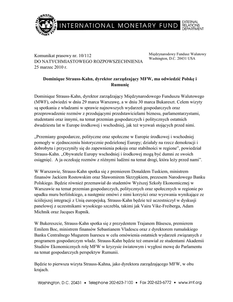 Komunikat prasowy nr. 10/112 DO NATYCHMIASTOWEGO ROZPOWSZECHNIENIA 25 marzec 2010 r. Międzynarodowy Fundusz Walutowy Washington, D.C. 20431 USA Dominique Strauss-Kahn, dyrektor zarządzający MFW, ma odwiedzić Polskę i Rumunię Dominique Strauss-Kahn, dyrektor zarządzający Międzynarodowego Funduszu Walutowego (MWF), odwiedzi w dniu 29 marca Warszawę, a w dniu 30 marca Bukareszt. Celem wizyty są spotkania z władzami w sprawie najnowszych wydarzeń gospodarczych oraz przeprowadzenie rozmów z przodującymi przedstawicielami biznesu, parlamentarzystami, studentami oraz innymi, na temat przemian gospodarczych i politycznych ostatnich dwudziestu lat w Europe środkowej i wschodniej, jak też wyzwań stojących przed nimi. „Przemiany gospodarcze, polityczne oraz społeczne w Europie środkowej i wschodniej pomogły w zjednoczeniu historycznie podzielonej Europy; działały na rzecz demokracji i dobrobytu i przyczyniły się do zapewnienia pokoju oraz stabilności w regione”, powiedział Strauss-Kahn. „Obywatele Europy wschodniej i środkowej mogą być dumni ze swoich osiągnięć. A ja oczekuję rozmów z różnymi ludźmi na temat drogi, która leży przed nami”. W Warszawie, Strauss-Kahn spotka się z premierem Donaldem Tuskiem, ministrem finansów Jackiem Rostowskim oraz Sławomirem Skrzypkiem, prezesem Narodowego Banku Polskiego. Będzie również przemawiał do studentów Wyższej Szkoły Ekonomicznej w Warszawie na temat przemian gospodarczych, politycznych oraz społecznych w regionie po upadku muru berlińskiego, a następnie omówi z nimi korzyści oraz wyzwania wynikające ze ściślejszej integracji z Unią europejską. Strauss-Kahn będzie też uczestniczył w dyskusji panelowej z uczestnikami wysokiego szczebla, takimi jak Vaira Vike-Freiberga, Adam Michnik oraz Jacques Rupnik. W Bukereszcie, Strauss-Kahn spotka się z prezydentem Trajanem Băsescu, premierem Emilem Boc, ministrem finansów Sebastianem Vladescu oraz z dyrektorem rumuńskiego Banku Centralnego Mugurem Isarescu w celu omówienia ostatnich wydarzeń związanych z programem gospodarczym władz. Strauss-Kahn będzie też omawiał ze studentami Akademii Studiów Ekonomicznych rolę MFW w kryzysie światowym i wygłosi mowę do Parlamentu na temat gospodarczych perspektyw Rumunii. Będzie to pierwsza wizyta Strauss-Kahna, jako dyrektora zarządzającego MFW, w obu krajach.