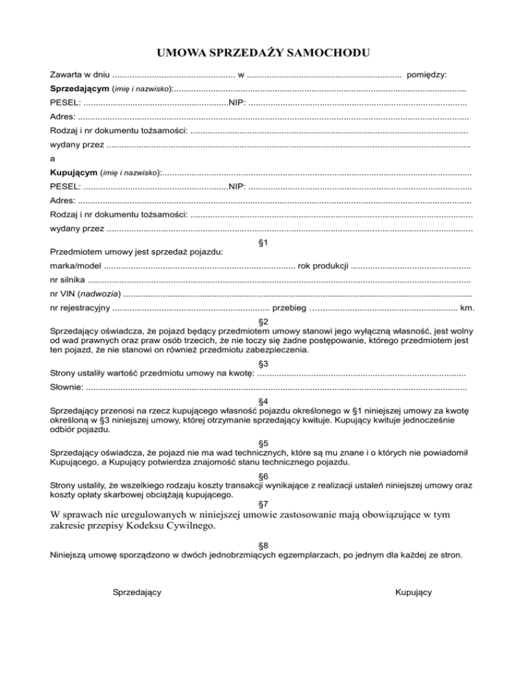 UMOWA SPRZEDAŻY SAMOCHODU Zawarta w dniu .................................................. w ............................................................... pomiędzy: Sprzedającym (imię i nazwisko):....................................................................................................................... PESEL: ...........................................................NIP: ......................................................................................... Adres: ............................................................................................................................................................... Rodzaj i nr dokumentu tożsamości: ................................................................................................................. wydany przez .................................................................................................................................................... a Kupującym (imię i nazwisko):.............................................................................................................................. PESEL: ...........................................................NIP: ........................................................................................... Adres: ................................................................................................................................................................ Rodzaj i nr dokumentu tożsamości: ................................................................................................................... wydany przez ..................................................................................................................................................... §1 Przedmiotem umowy jest sprzedaż pojazdu: marka/model .............................................................................. rok produkcji ................................................. nr silnika ............................................................................................................................................................ nr VIN (nadwozia) .............................................................................................................................................. nr rejestracyjny ................................................................ przebieg …......................................................... km. §2 Sprzedający oświadcza, że pojazd będący przedmiotem umowy stanowi jego wyłączną własność, jest wolny od wad prawnych oraz praw osób trzecich, że nie toczy się żadne postępowanie, którego przedmiotem jest ten pojazd, że nie stanowi on również przedmiotu zabezpieczenia. §3 Strony ustaliły wartość przedmiotu umowy na kwotę: ..................................................................................... Słownie: ........................................................................................................................................................... §4 Sprzedający przenosi na rzecz kupującego własność pojazdu określonego w §1 niniejszej umowy za kwotę określoną w §3 niniejszej umowy, której otrzymanie sprzedający kwituje. Kupujący kwituje jednocześnie odbiór pojazdu. §5 Sprzedający oświadcza, że pojazd nie ma wad technicznych, które są mu znane i o których nie powiadomił Kupującego, a Kupujący potwierdza znajomość stanu technicznego pojazdu. §6 Strony ustaliły, że wszelkiego rodzaju koszty transakcji wynikające z realizacji ustaleń niniejszej umowy oraz koszty opłaty skarbowej obciążają kupującego. §7 W sprawach nie uregulowanych w niniejszej umowie zastosowanie mają obowiązujące w tym zakresie przepisy Kodeksu Cywilnego. §8 Niniejszą umowę sporządzono w dwóch jednobrzmiących egzemplarzach, po jednym dla każdej ze stron. Sprzedający Kupujący