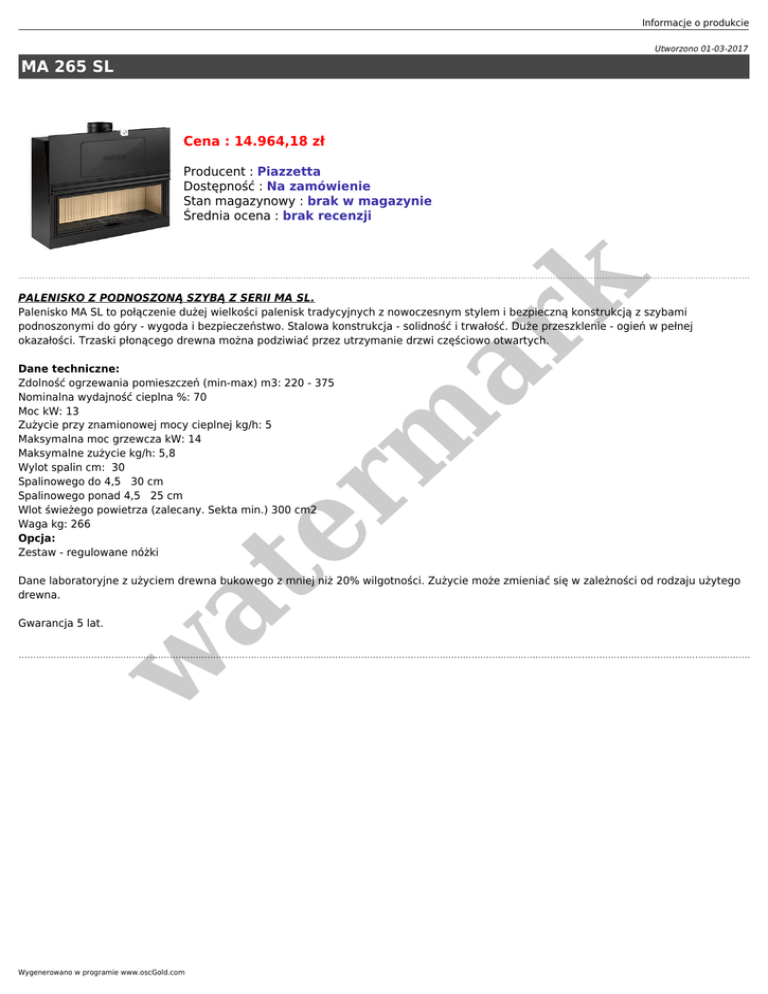Informacje o produkcie Utworzono 01-03-2017 MA 265 SL Cena : 14.964,18 zł er m ar k Producent : Piazzetta Dostępność : Na zamówienie Stan magazynowy : brak w magazynie Średnia ocena : brak recenzji PALENISKO Z PODNOSZONĄ SZYBĄ Z SERII MA SL. Palenisko MA SL to połączenie dużej wielkości palenisk tradycyjnych z nowoczesnym stylem i bezpieczną konstrukcją z szybami podnoszonymi do góry - wygoda i bezpieczeństwo. Stalowa konstrukcja - solidność i trwałość. Duże przeszklenie - ogień w pełnej okazałości. Trzaski płonącego drewna można podziwiać przez utrzymanie drzwi częściowo otwartych. at Dane techniczne: Zdolność ogrzewania pomieszczeń (min-max) m3: 220 - 375 Nominalna wydajność cieplna %: 70 Moc kW: 13 Zużycie przy znamionowej mocy cieplnej kg/h: 5 Maksymalna moc grzewcza kW: 14 Maksymalne zużycie kg/h: 5,8 Wylot spalin cm: 30 Spalinowego do 4,5 30 cm Spalinowego ponad 4,5 25 cm Wlot świeżego powietrza (zalecany. Sekta min.) 300 cm2 Waga kg: 266 Opcja: Zestaw - regulowane nóżki Dane laboratoryjne z użyciem drewna bukowego z mniej niż 20% wilgotności. Zużycie może zmieniać się w zależności od rodzaju użytego drewna. w Gwarancja 5 lat. Wygenerowano w programie www.oscGold.com