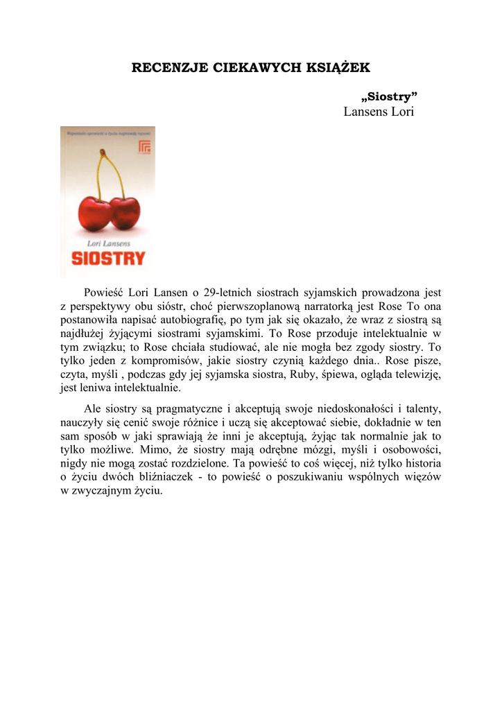 RECENZJE CIEKAWYCH KSIĄŻEK „Siostry” Lansens Lori Powieść Lori Lansen o 29-letnich siostrach syjamskich prowadzona jest z perspektywy obu sióstr, choć pierwszoplanową narratorką jest Rose To ona postanowiła napisać autobiografię, po tym jak się okazało, że wraz z siostrą są najdłużej żyjącymi siostrami syjamskimi. To Rose przoduje intelektualnie w tym związku; to Rose chciała studiować, ale nie mogła bez zgody siostry. To tylko jeden z kompromisów, jakie siostry czynią każdego dnia.. Rose pisze, czyta, myśli , podczas gdy jej syjamska siostra, Ruby, śpiewa, ogląda telewizję, jest leniwa intelektualnie. Ale siostry są pragmatyczne i akceptują swoje niedoskonałości i talenty, nauczyły się cenić swoje różnice i uczą się akceptować siebie, dokładnie w ten sam sposób w jaki sprawiają że inni je akceptują, żyjąc tak normalnie jak to tylko możliwe. Mimo, że siostry mają odrębne mózgi, myśli i osobowości, nigdy nie mogą zostać rozdzielone. Ta powieść to coś więcej, niż tylko historia o życiu dwóch bliźniaczek - to powieść o poszukiwaniu wspólnych więzów w zwyczajnym życiu.