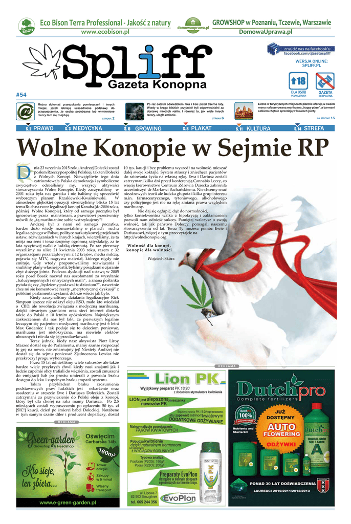 WERSJA ONLINE: spliff.pl Gazeta Konopna #54 pełnoletnich strona PRAWO S. 3 2 MEDYCYNA S. 6 GROWING strona S. 8 6 PLAKAT GAZETA BEZPŁATNA Liczne w turystycznych miejscach pizzerie oferują w swoim menu nafaszerowaną marihuaną „happy pizzę”, a barmani całkiem chętnie sprzedają w lokalach jointy. Po raz ostatni odwiedziłem Fixa i Foxi przed trzema laty. Wtedy w kręgu bliskich przyjaciół byli odpowiedzialni za dostawę młodych roślin. I również to, jak wiele innych rzeczy, uległo zmianie. Można dokonać przeszukania pomieszczeń i innych miejsc, jeżeli istnieją uzasadnione podstawy do przypuszczenia, że osoba podejrzana lub wymienione rzeczy tam się znajdują. S. 2 Dla osób S. 11 KULTURA na stronie S. 14 STREFA Wolne Konopie w Sejmie RP D nia 23 września 2015 roku Andrzej Dołecki został posłem Rzeczypospolitej Polskiej, tak ten Dołecki z Wolnych Konopi. Niewątpliwie tego dnia zatriumfowała Polska demokracja i symboliczne zwycięstwo odnieśliśmy my, wszyscy aktywiści stowarzyszenia Wolne Konopie. Kiedy zaczynaliśmy w 2001 roku była nas garstka i nie baliśmy się sprzeciwić wyborczym planom Krzaklewski-Kwaśniewski. W atmosferze głębokiej opozycji stworzyliśmy blisko 15 lat temu Ruch na rzecz legalizacji konopi Kanaba [do 2006 roku, później Wolne Konopie], który od samego początku był ignorowany przez mainstream, a prawicowi przeciwnicy mówili że „tą marihuanine sobie wstrzykujemy”! Andrzej był z nami od samego początku, bardzo dużo wtedy rozmawialiśmy o planach ruchu legalizacyjnego w Polsce, polityce narkotykowej, projektach ustaw, rozwiązaniach w innych krajach, wierzyliśmy, że ta misja ma sens i teraz czujemy ogromną satysfakcję, za te lata syzyfowej walki z ludzką ciemnotą. Po raz pierwszy wyszliśmy na ulice 21 kwietnia 2003 roku, razem z 32 organizacjami pozarządowymi z 12 krajów, media milczą, pojawia się MTV, nagrywa materiał, którego nigdy nie emituje. Gdy wtedy proponowaliśmy rozwiązania i snuliśmy plany własnej partii, byliśmy posądzani o zjaranie zbyt dużego jointa. Podczas dyskusji nad ustawą w 2005 roku poseł Bosak nazwał nas oszołomami za wysyłanie „halucynogennych i onirycznych maili”, a znana posłanka pytała się czy „będziemy podawać to dzieciom?”, nawet nie chce mi się komentować reszty „merytorycznej dyskusji” z polskimi parlamentarzystami, dobrze wiecie jak było. Kiedy zaczynaliśmy działania legalizacyjne Rick Simpson jeszcze nie odkrył oleju RSO, mało kto wiedział o CBD, ale rewolucja związana z medyczną marihuaną, dzięki otwartym granicom oraz sieci internet dotarła także do Polski z 10 letnim opóźnieniem. Największym zaskoczeniem dla nas był fakt, że pierwszym legalnie leczącym się pacjentem medycznej marihuany jest 6 letni Max Gudaniec i tak podaje się to dzieciom ponieważ, marihuana jest nietoksyczna, ma niewiele efektów ubocznych i nie da się jej przedawkować. Teraz jednak, kiedy nasz aktywista Piotr Liroy Marzec dostał się do Parlamentu, mamy szansę rozpocząć tę grę na nowo, nie zmarnujmy jej! Niestety Andrzej nie dostał się do sejmu ponieważ Zjednoczona Lewica nie przekroczył progu wyborczego. Przez 15 lat odnieśliśmy wiele sukcesów ale także bardzo wiele przykrych chwil kiedy nasi znajomi jak i ludzie zupełnie obcy trafiali do więzienia, zostali zmuszeni do emigracji lub po prostu umierali z powodu braku dostępu do leku i zupełnym braku empatii systemu. Takim przykładem braku zrozumienia podstawowych praw ludzkich jest oskarżenie oraz osadzeniu w areszcie Ewe i Dariusza Dołeckich. Zostali zatrzymani za przywiezienie do Polski oleju z konopi, który był dla chorej na raka mamy Dariusza. Po 2,5 miesiącach zostali wypuszczeniu po opłaceniu 50 tys. zł [SIC!] kaucji, dzień po śmierci babci Dołeckiej. Notabene w tym samym czasie diler i producent dopalaczy, dostał REKLAMA Oświęcim Garbarska 14b Growshop & Headshop Kto ieje, ten zbiera... www.e-green-garden.pl 160 m2 Towar od ręki Zakupy w 5 minut Własny transport 10 tys. kaucji i bez problemu wyszedł na wolność, mieszać dalej swoje koktajle. System straszy i zniechęca pacjentów do ratowania życia na własną rękę. Ewa i Dariusz zostali zatrzymani kilka dni przed konferencją Cannabis Leczy, co więcej kierownictwo Centrum Zdrowia Dziecka zabroniła uczestniczyć dr Markowi Bachańskiemu. Nie chcemy snuć niezdrowych teorii ale ludzka głupota i kilka grup interesu m.in. farmaceutycznego, tytoniowego, alkoholowego czy policyjnego jest nie na rękę zmiana prawa względem marihuany. Nie daj się ogłupić, dąż do normalności, tylko konsekwentna walka z hipokryzją i zakłamaniem pozwoli nam odnieść sukces. Pamiętaj walczysz o swoją wolność, tak jak państwo Dołeccy, pomagali naszemu stowarzyszeniu od lat. Teraz Ty możesz pomóc Ewie i Dariuszowi, więcej o tym przeczytajcie na http://wolnekonopie.org Wolność dla konopi, konopie dla wolności Wojciech Skóra REKLAMA 15 2 Spliff Gazeta Konopna Prawo PRAWNIK SPLIFF.PL Zwracam się z prośbą o poradę? Może bardziej o wyjaśnienie sytuacji. Problem nie dotyczy spotkania z Policją a konfliktu prawa i sprawiedliwości. Według przepisów popełniam każdego dnia przestępstwo zagrożone karą pozbawienia wolności. Jestem ciężko chory, nie mam możliwości zaprzestania terapii. Znając niesprawiedliwe przepisy, świadomie je łamię. Cierpiałem bardzo długi czas, nie mogąc odnaleźć skutecznej terapii właściwej dla moich nawarstwiających się dolegliwości. Kolejne leki wnosiły do mojego organizmu negatywne skutki uboczne, nie dając przy tym rozwiązania. Po przeanalizowaniu wszelkich argumentów lekarz nieformalnie przyznał, że nie ma przeciwwskazań do stosowania u mnie przetworów Cannabis. Żadna z oferowanych przez farmację metod leczenia nie przyniosła skutku. Było to „zielone światło” dla mojego syna, który od dłuższego czasu przedstawiał mi badania dotyczące d