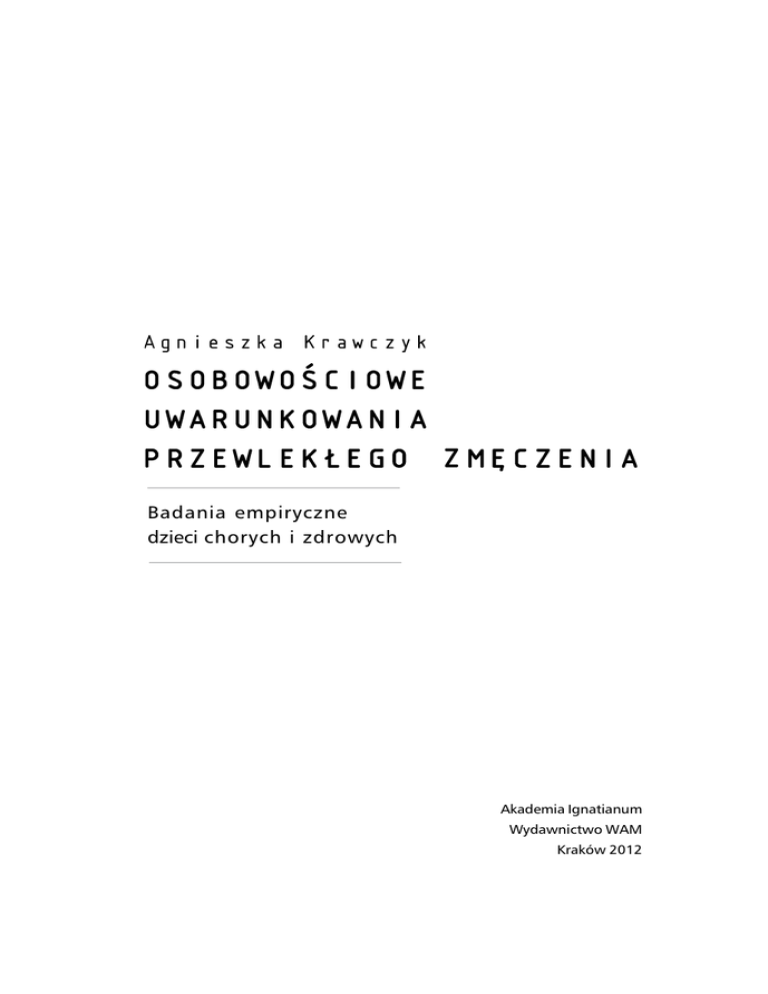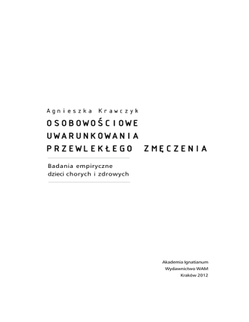 Badania empiryczne dzieci chorych i zdrowych Akademia Ignatianum Wydawnictwo WAM Kraków 2012 Spis treści Wstęp11 Rozdział I Psychologiczna analiza zmęczenia 1.1. Wielowymiarowa natura zmęczenia 1.2. Subiektywne i obiektywne objawy zmęczenia 1.3. Przyczyny zmęczenia 1.4. Charakterystyka zmęczenia fizycznego i psychicznego 1.5. Różnice jakościowe pomiędzy znużeniem, zmęczeniem a wyczerpaniem 1.6. Uwarunkowania przewlekłego zmęczenia 1.6.1. Czynniki determinujące wystąpienie przewlekłego zmęczenia w wieku dorastania 1.6.2. Osobowościowe korelaty zmęczenia 19 19 22 27 30 36 40 44 49 Rozdział II Zespół przewlekłego zmęczenia 53 2.1. Konsensualne definicje zespołu przewlekłego zmęczenia – Chronic Fatigue Syndrome (CFS) 53 2.2. Epidemiologia zespołu przewlekłego zmęczenia 61 2.3. Etiopatogeneza i patofizjologia zespołu przewlekłego zmęczenia63 2.3.1. Neurobiologiczne i immunologiczne aspekty zespołu przewlekłego zmęczenia 67 2.3.2. Czynniki psychospołeczne 71 2.4. Trudności diagnostyczne CFS 74 2.4.1. CFS a depresja 76 2.4.2. CFS a neurastenia i fibromialgia 82 2.5. Modele psychopatologiczne wyjaśniające mechanizm CFS 85 2.5.1. Model Raya 85 2.5.2. Model biomedyczny 86 2.5.3. Model sieciowy Hylanda 87 2.5.4. Modele biopsychospołeczne 89 8 Spis treści 2.5.5. Model Fennell 90 2.5.6. Kognitywno-behawioralne modele CFS 92 2.6. Psychologiczny obraz pacjentów z diagnozą CFS 94 2.7. Neuropsychologiczne dysfunkcje w zespole przewlekłego zmęczenia107 2.8. Diagnoza zespołu przewlekłego zmęczenia u dzieci i adolescentów110 2.9. Terapia zespołu przewlekłego zmęczenia 121 Rozdział III Psychologiczna specyfika chorób przewlekłych u nastolatków 3.1. Choroby przewlekłe – charakterystyka zjawiska 3.2. Uwarunkowania chorób przewlekłych 3.3. Zmęczenie jako symptom chorób przewlekłych 3.4. Następstwa chorób przewlekłych u dzieci w wieku rozwojowym 3.4.1. Choroba przewlekła jako źródło negatywnych emocji 3.4.2. Deprywacja potrzeb w chorobach przewlekłych 3.4.3. Wpływ choroby przewlekłej na strukturę osobowości 3.4.4. Jakość życia przewlekle chorych nastolatków 3.5. Przewlekły charakter zaburzeń endokrynologicznych 3.5.1. Cukrzyca insulinozależna 3.5.2. Nadczynność tarczycy 3.5.3. Otyłość prosta Rozdział IV Metodologia badań własnych 4.1. Założenia i cel badań 4.2. Charakterystyka badanych grup 4.2.1. Grupa kontrolna – dzieci zdrowe 4.2.2. Grupa kliniczna – dzieci z zaburzeniami endokrynnymi 4.2.2.1. Cukrzyca 4.2.2.2. Nadczynność tarczycy 4.2.2.3. Otyłość prosta 4.3. Poszukiwanie zmiennych wyjaśniających 4.4. Opis metod badawczych 4.4.1. Kwestionariusz Osobowości R.B. Cattella – HSPQ 4.4.2. Kwestionariusz Skumulowanego Zmęczenia R. Kosugo – CFI 4.4.3. Skala Oceny Zmęczenia J.E. Schwartza, L. Jandorf i L.B. Krupp – FAI 4.5. Sposób przeprowadzenia badań 129 129 130 133 134 135 136 138 139 141 142 147 148 157 157 158 159 161 162 164 165 168 171 172 174 176 178 Spis treści Rozdział V Prezentacja wyników badań własnych 5.1. Analiza porównawcza cech osobowości młodzieży z zaburzeniami endokrynnymi i z grupy kontrolnej 5.2. Poziom zmęczenia i charakterystyka jego przejawów w grupie kontrolnej i klinicznej 5.2.1. Porównanie zmiennych związanych z oceną zmęczenia na podstawie Skali FAI 5.2.2. Porównanie wyników otrzymanych w Kwestionariuszu Skumulowanego Zmęczenia – CFI u dzieci zdrowych i chorych 5.3. Zmęczenie psychiczne a cechy osobowości 5.4. Analiza zmiennych wyjaśniających 9 181 181 205 205 209 225 231 Rozdział VI Omówienie i dyskusja wyników badań własnych 245 6.1. Profile osobowości nastolatków z zaburzeniami endokrynnymi 245 6.2. Wyznaczniki przewlekłego zmęczenia u młodzieży chorej i zdrowej 251 6.3. Zmienne wyjaśniające zmęczenie 254 6.4. Cechy osobowości jako determinanty przewlekłego zmęczenia260 6.5. Podsumowanie 266 Wnioski Bibliografia Summary 270 273 309
