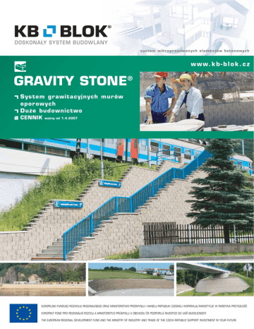 system wibr oprasowanych elementów betonowych w w w. k b - b l o k . c z GRAVITY STONE® System grawitacyjnych mur ów opor owych Duże budownictwo CENNIK ważny od 1.4.2007 EUROPEJSKI FUNDUSZ ROZWOJU REGIONALNEGO ORAZ MINISTERSTWO PRZEMYSŁU I HANDLU REPUBLIKI CZESKIEJ WSPIERAJĄ INWESTYCJE W PAŃSTWA PRZYSZŁOŚĆ EVROPSKÝ FOND PRO REGIONÁLNÍ ROZVOJ A MINISTERSTVO PRŮMYSLU A OBCHODU ČR PODPORUJÍ INVESTICE DO VAŠÍ BUDOUCNOSTI THE EUROPEAN REGIONAL DEVELOPMENT FUND AND THE MINISTRY OF INDUSTRY AND TRADE OF THE CZECH REPUBLIC SUPPORT INVESTMENT IN YOUR FUTURE GRAVITY STONE ® wstęp System konstrukcyjny GRAVITY STONE® przeznaczony jest do budowania grawitacyjnych murów oporowych. System składa się z kilku kształtek betonowych, które można ułożyć jak klocki do wielu wariantów ścian oporowych. Połączenia kształtek są suche, kształtki w jednej warstwie łączone są w ukształtowany zamek, kształtki nad sobą łączy się przy pomocy plastikowych kołków. Wewnętrzna przestrzeń muru zasypywana jest odpowiednim materiałem zasypowym. Elementy systemu produkowane są na liniach produkcyjnych kupionych w USA, w technologii betonu wibroprasowanego z niskim współczynnikiem wodnym. Dzięki tej technologii osiągana jest wysoka wytrzymałość betonu. Wykonywanie murów oporowych w systemie GRAVITY STONE® jest szybkie i proste. System GRAVITY STONE® stosowany jest zwłaszcza w budownictwie murów oporowych w następujących dziedzinach: • • • • • • budowa dróg i szos kolej mosty drogowe i kolejowe uporządkowanie terenu podczas budowania obiektów budowli naziemnych uporządkowanie i regulacja obszarów wodnych oraz cieków architektura ogrodowa 2 system wibroprasowanych elementów betonowych zalety systemu GRAVITY STONE ® Estetyczny wygląd Ściany oporowe wykonane w systemie GRAVITY STONE® są bardzo ładne. Projektując ścianę można wybierać między różnymi kolorami kształtek, a także między różnymi wykończeniami powierzchniowymi elementu licowego. Do dyspozycji są elementy licowe gładkie oraz łupane. W ofercie jest sześć podstawowych wykonań kolorystycznych. Montowanie ściany z poszczególnych kształtek umożliwia różne kształty ścian zarówno w rzucie (ściany zaokrąglone, załamane itd.), jak i w układzie wysokościowym. Główny efekt estetyczny tych ścian polega na członkowaniu dużych monotonnych powierzchni na mniejsze i lepiej postrzegane całości. Uniwersalność System konstrukcyjny ścian oporowych GRAVITY STONE® dostosuje się do jakiegokolwiek kształtu rzutowego. Ściany mogą być proste, faliste, wklęsłe lub wypukłe albo załamane do kątów wewnętrznych lub zewnętrznych. Owa uniwersalność umożliwia budowanie ścian wariantowo zgodnie z ciągiem terenu, różnego ukształtowania wysokościowego itd. Ściany grawitacyjne umożliwiają budowanie konstrukcji uzupełniających, takich jak schody i rampy terenowe, i umożliwiają także zróżnicowanie wysokości ściany w razie zmiennej spadzistości terenu. System umożliwia reagowanie w prosty sposób na aktualne warunki podczas realizacji - np. można łatwo ominąć duże głazy, ocalić drzewa itd. Ściany systemu GRAVITY STONE® można zaprojektować jako ściany modułowe (zmontowane wyłącznie z kształtek) lub uzbrojone (grunt za murem uzbrojony jest geokratą). Ściany modułowe odpowiednie są do wysokości 6m i do bardziej stałego np. skalnego środowiska ziemnego. Projektowanie ściany uzbrojonej wskazane jest dla gruntów niższej jakości lub w przypadku obciążenia dynamicznego. Wykonanie Bezzaprawowe suche połączenia systemu GRAVITY STONE® są pod wieloma względami bardziej korzystne od sztywniejszych zaprawowych połączeń klasycznych murów oporowych. Konstrukcje wykonane suchym montażem umożliwiają przesunięcie względne pomiędzy poszczególnymi kształtkami spowodowane nierównomiernym osiadaniem, zróżnicowanym obciążeniem oraz innymi oddziaływaniami. Suche szczeliny swoją istotą wykluczają szpetne pęknęcia w spoinach wspornych i szczelinach stykowych, które spotykane są w przypadku klasycznych, zwłaszcza otynkowanych ścian. Suchymi spoinami wspornymi pomiędzy kształtkami wyciskana jest swobodnie woda przed ścianę, dzięki czemu obniża się ciśnienie hydrostatyczne za ścianą. Montaż Montaż ściany oporowej z kształtek GRAVITY STONE® nie jest wymagający. Przedstawia kilka prostych, powtarzających się czynności roboczych, które nie wymagają wykwalifikowanych czy zawodowo przeszkolonych pracowników. Do montażu potrzebne jest jedynie skromne wyposażenie. Z kolei instrukcje montażu tak, jak są zapisane, zapewniają najwyższą możliwą osiągalną jakość. Optymalna wydajność zostanie osiągnięta po odbyciu stosunkowo krótkiej praktyki, z reguły po zaledwie kilku budowach. W razie potrzeby można od firmy KB-BLOK zażądać fachowego przeszkolenia w dziedzinie montowania ściany Trwałość Do produkcji kształtek systemu GRAVITY STONE® stosowany jest beton o wysokiej trwałości z niskim współczynnikiem wodnym. Jeśli ściana oporowa ulokowana jest w typowym środowisku, to przez okres jej przewidywanej , tj. ok. 100 lat, jej jakość nie pogarsza się. Żywotność pozostałych komponentów ściany, takich jak zasyp żwirowy, geokrata polimerowa czy kołek plastikowy, jest również bardzo wysoka. Cena Koszty inwestycyjne zrealizowania ściany oporowej w systemie GRAVITY STONE® są porównywalne do pozostałych systemów murowanych, i są wyraźnie niższe od kosztów inwestycyjnych wykonania 3 betonowej ściany. Ze względu na trwałość oraz długookresowy ładny wygląd ściany są koszty utrzymania minimalne. w w w. k b - b l o k . c z GRAVITY STONE ® badanie geologiczne Przed rozpoczęciem budowy trzeba wykonać badanie geologiczne w zakresie i kosztach, które odpowiadają rozmiarom i złożoności budowli. Realizacja projektu czy budowa bez badania geologicznego 