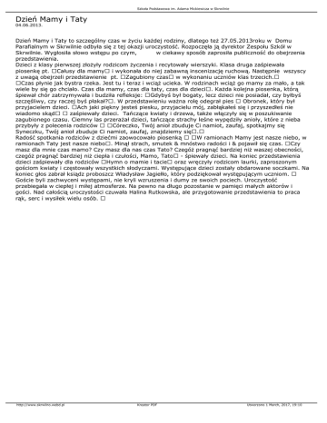 Szkoła Podstawowa im. Adama Mickiewicza w Skrwilnie Dzień Mamy i Taty 04.06.2013. Dzień Mamy i Taty to szczególny czas w życiu każdej rodziny, dlatego też 27.05.2013roku w Domu Parafialnym w Skrwilnie odbyła się z tej okazji uroczystość. Rozpoczęła ją dyrektor Zespołu Szkół w Skrwilnie. Wygłosiła słowo wstępu po czym, w ciekawy sposób zaprosiła publiczność do obejrzenia przedstawienia. Dzieci z klasy pierwszej złożyły rodzicom życzenia i recytowały wierszyki. Klasa druga zaśpiewała piosenkę pt. Całusy dla mamy i wykonała do niej zabawną inscenizację ruchową. Następnie wszyscy z uwagą obejrzeli przedstawienie pt. Zagubiony czas w wykonaniu uczniów klas trzecich. Czas płynie jak bystra rzeka. Jest tu i teraz i wciąż ucieka. W rodzinach wciąż go mamy za mało, a tak wiele by się go chciało. Czas dla mamy, czas dla taty, czas dla dzieci. Każda kolejna piosenka, którą śpiewał chór zatrzymywała i budziła refleksje: Gdybyś był bogaty, lecz dzieci nie posiadał, czy byłbyś szczęśliwy, czy raczej byś płakał?. W przedstawieniu ważna rolę odegrał pies Obronek, który był przyjacielem dzieci. Ach jaki piękny jesteś piesku, przyjacielu mój, zabłąkałeś się i przyszedłeś nie wiadomo skąd zaśpiewały dzieci. Tańczące kwiaty i drzewa, także włączyły się w poszukiwanie zagubionego czasu. Ciemny las przerażał dzieci, tańczące strachy leśne wypędziły anioły, które z nieba przybyły z polecenia rodziców Córeczko, Twój anioł zbuduje Ci namiot, zaufaj, spotkajmy się Syneczku, Twój anioł zbuduje Ci namiot, zaufaj, znajdziemy się. Radość spotkania rodziców z dziećmi zaowocowało piosenką W ramionach Mamy jest nasze niebo, w ramionach Taty jest nasze niebo. Minął strach, smutek & mnóstwo radości i & pojawił się czas. Czy masz dla mnie czas mamo? Czy masz dla nas czas Tato? Czegóż pragnąć bardziej niż waszej obecności, czegóż pragnąć bardziej niż ciepła i czułości, Mamo, Tato - śpiewały dzieci. Na koniec przedstawienia dzieci zaśpiewały dla rodziców Hymn o mamie i tacie oraz wręczyły rodzicom laurki, zaproszonym gościom kwiaty i częstowały wszystkich słodyczami. Występujące dzieci zostały obdarowane soczkami. Na koniec głos zabrał ksiądz proboszcz Władysław Jagiełło, który podziękował występującym uczniom. Goście byli zachwyceni występami, nie kryli wzruszenia i dumy ze swoich pociech. Uroczystość przebiegała w ciepłej i miłej atmosferze. Na pewno na długo pozostanie w pamięci małych aktorów i gości. Nad całością uroczystości czuwała Halina Rutkowska, ale przygotowanie przedstawienia to praca rąk, serc i wysiłek wielu osób. http://www.skrwilno.webd.pl Kreator PDF Utworzono 1 March, 2017, 19:10