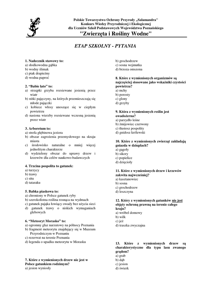 Polskie Towarzystwo Ochrony Przyrody ,,Salamandra'' Konkurs Wiedzy Przyrodniczej i Ekologicznej dla Uczniów Szkół Podstawowych Województwa Poznańskiego "Zwierzęta i Rośliny Wodne" ETAP SZKOLNY - PYTANIA 1. Nadecznik stawowy to: a) słodkowodna gąbka b) wodny ślimak c) ptak drapieżny d) wodna paproć 2. “Babie lato” to: a) strzępki grzyba rozsiewane jesienią przez wiatr b) nitki pajęczyny, na których przemieszczają się młode pajączki c) kobiece włosy unoszące się w ciepłym powietrzu d) nasiona wierzby rozsiewane wczesną jesienią przez wiatr 3. Arboretum to: a) strefa głębinowa jeziora b) obszar zagrożenia przemysłowego na skraju miasta c) środowisko naturalne o mniej więcej jednolitym charakterze d) wydzielony obszar do uprawy drzew i krzewów dla celów naukowo-badawczych 4. Trzcina pospolita to gatunek: a) turzycy b) trawy c) situ d) tataraku 5. Babka piaskowa to: a) chroniony w Polsce gatunek ryby b) szerokolistna roślina rosnąca na wydmach c) gatunek pająka łowiący owady bez użycia sieci d) gatunek trawy o niskich wymaganiach glebowych 6. “Meteoryt Morasko” to: a) ogromny głaz narzutowy na północy Poznania b) fragment meteorytu znajdujący się w Muzeum Przyrodniczym w Poznaniu c) rezerwat na terenie Poznania d) legenda o upadku meteorytu w Morasku 7. Które z wymienionych drzew nie jest w Polsce gatunkiem rodzimym? a) jesion wyniosły b) grochodrzew c) sosna wejmutka d) brzoza omszona 8. Które z wymienionych organizmów są najczęściej stosowane jako wskaźniki czystości powietrza? a) mchy b) porosty c) glony d) grzyby 9. Która z wymienionych roślin jest owadożerna? a) parzydło leśne b) żmijowiec czerwony c) tłustosz pospolity d) gnidosz królewski 10. Które z wymienionych zwierząt zakładają gniazda w dziuplach? a) gągoły b) sikory c) popielice d) dzięcioły 11. Które z wymienionych drzew i krzewów zakwita najwcześniej? a) kasztanowiec b) sosna c) grochodrzew d) leszczyna 12. Który z wymienionych gatunków nie jest objęty ochroną prawną na terenie całego kraju? a) wróbel domowy b) wilk c) jeż d) traszka zwyczajna 13. Które z wymienionych drzew są charakterystyczne dla typu lasu zwanego grądem? a) grab b) dąb c) jesion d) świerk 14. Które z wymienionych gatunków to chrząszcze wodne? a) pływak żółtobrzeżek b) kałużnica czarnozielona c) krętak pospolity d) pluskolec pospolity 15. Który z wymienionych gatunków ptaków ostatnio zmniejsza swoją liczebność w Polsce? a) kruk b) kormoran c) bocian d) sroka 16. Co stanowi podstawę pokarmu zimorodka? a) ważki b) ślimaki c) ryby d) drobne płazy 17. Co to jest wężymord stepowy? a) chroniona prawnie roślina zielna b) ptak drapieżny odżywiający się głównie gadami c) jeden z najrzadszych polskich gadów występujący na Polesiu d) krzew iglasty o charakterystycznie wydłużonych, żółtych kwiatach 18. Co to jest orzechówka? a) muchówka, której larwy odżywiają się orzechami b) niewielki nadrzewny gryzoń c) występujący w naszych lasach krzew liściasty d) ptak z rodziny krukowatych 19. Zarodniki sromotnika bezwstydnego roznoszone są przez: a) wiatr b) muchy c) wodę d) Roślina ta ma nasiona, a nie zarodniki. 20. Zaznacz, które z wymienionych zwierząt wyginęły bezpowrotnie. a) salamadry plamiste b) tury c) tarpany d) rarogi 21. Dzięcioły duże odlatują na zimę: a) już na początku sierpnia, do Afryki b) na przełomie września i października, nad Morze Śródziemne c) dopiero na początku grudnia, do Europy Zachodniej d) w ogóle nie odlatują na zimę 22. Wpisując tak lub nie oceń prawdziwość zdań. a) Tułów nietoperza pokryty jest gęstym futerkiem. b) Głównym pożywieniem zaskrońca są żaby. c) Kosarze są to pająki o bardzo długich nogach. 23. Wpisując tak lub nie oceń prawdziwość zdań. a) Łuskiewnik różowy jest to krzew kwitnący wczesną wiosną. b) Podgrzybek pasożytniczy jest to grzyb objęty w Polsce całkowitą ochroną gatunkową. c) Bluszczyk kurdybanek to pospolita w naszych lasach liściastych roślina pnąca. 24. Wpisując tak lub nie oceń prawdziwość zdań. a) Karlik malutki to gryzoń. b) Tygrzyk paskowany to nietoperz. c) Drzemlik to ptak. 25. Jak nazywa się samiec pszczoły? 26. Wymień polskie parki znajdujące się nad morzem. narodowe 27. Jak nazywa się jedyna niepasożytnicza grupa płazińców? 28. Który z występujących w Polsce gryzoni osiąga największe rozmiary? 29. Którego z naszych płazów można spotkać na drzewie? 30. Wymień dwa gatunki susła występujące w Polsce.