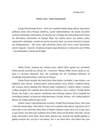14 lipiec 2013 Temat: Jezus – dobry Samarytanin Księga Powtórzonego Prawa - łatwo jest wypełniać nakazy Boga nakazy, Jego prawa, podlewać ziarno słowa Bożego, modlitwą, życiem sakramentalnym, ale przede wszystkim czynami miłosierdzia, miłosierdzie, nie możemy żyć w letargu, bez miłosierdzia uczeń Jezusa nie doświadczy miłosierdzia od Samego Boga, bez miłości prawo jest martwe, dobry samarytanin -obojętność, czasami jest gorsza niż jawna złość, czy może nienawiść, Ja jestem tym Samarytaninem – Pan Jezus, bądź miłosierny wobec tych, którzy ciebie skrzywdzili, zranili, Gospoda – Kościół, świadectwo księdza Jogna Boschaora o wybaczeniu cioci, Polska – kraj miłosierdzia, wybrany przez Boga Duchu Święty, natchnij nas, natchnij mnie, miłości Boża ogarnij nas, przeniknij. Duchu prawdy, prowadź nas, uświęć nas w prawdzie. Maryjo, Matko Jezusa, spójrz na nas, teraz i z Jezusem, błogosław nam. Od wszelkiego zła, od wszelkiego złudzenia, od wszelkiego niebezpieczeństwa zachowaj nas Maryjo. Duchu Święty przyjdź, aby każde słowo które będzie wychodzić z tego miejsca z ust kapłanów, było słowem namaszczonym, słowem pełnym mocy, miłości i mądrości Bożej, aby wszyscy, którzy słuchają słów Bożych mogli wypełniać je i znaleźć radość i szczęcie według ewangelii. Kto wypełnia słowo Boże jest szczęśliwy i żyje w pokoju. Przyjdź Duchu Święty, aby każdy z nas, poprzez wypełnianie słowa Bożego, poprzez życie ewangelią był człowiekiem pokoju, szczęśliwym, błogosławionym. Przyjdź, abyśmy żyli według mądrości Bożej a nie według mądrości tego świata. Ostatni werset z tego dzisiejszego czytania, z Księgi Powtórzonego Prawa mówi nam o słowach samego Boga , który mówi, że łatwo jest wypełniać Jego nakazy, Jego prawo, bo to prawo jest w tym człowieku, który idzie za Bogiem wpisane w jego sercu. Jest w jego sercu, w jego ustach, więc łatwo jest wypełniać prawo Boże, które jest tak blisko człowieka i dzisiaj kiedy usłyszeliśmy słowo Pana, słowo Boże, poprzez uszy naszych ciał zapadło głęboko w głębinę naszych serc, jest już w nas obecny. Jest w nas słowo Boże. Ono będzie tam żyło, 1 można powiedzieć swoim życiem. Ono będzie w nas rozwijało się, owocowało jeżeli będziemy podlewali ziarna słowo Bożego, modlitwą, życiem sakramentalnym, ale przede wszystkim czynami miłosierdzia, bo jak mówi Pismo Święte, miłosierdzie odnosi triumf nas sądem. Miłosierni są błogosławieni przez Boga i osiągną niebo, przejdą z ziemi do nieba. Człowiek pełen miłosierdzia jest podobny do Boga, który jest Bogiem miłosierdzia. I dzisiaj Słowo Boże nas napomina żebyśmy nie oszukiwali siebie samych mówiąc, jestem chrześcijaninem, katolikiem i moje życie chrześcijańskie wygląda tylko na minimalnej praktyce religijnej. Dzisiaj, Chrystus Jezus, nas nauczyciel, naucza nas, że nie możemy żyć w takim letargu, w takim uśpieniu duchowym, że ten, który jest uczniem Jezusa i jest nim naprawdę to powinien czynić miłosierdzie. Bez miłosierdzia uczeń Jezusa nie doświadczy miłosierdzia od Samego Boga, jeżeli nie przebaczymy tym, którzy nas skrzywdzili, nam Bóg też nie wybaczy. Dlatego w dzisiejszej ewangelii są słowa, które mówią nam mówią o tym, że miłość wyraża się w czynie miłosierdzia i jeden z uczonych w Prawie, był zaniepokojony o swoje zbawienie. Często zresztą zdarzało się, że do Jezusa przychodzili ludzie, którzy pytali się co mam czynić, aby osiągnąć wieczność, życie wieczne. Bogaty młodzieniec, też Apostołowie pytali się co osiągniemy za to, że wszystko zostawiliśmy i poszliśmy za Tobą i ten człowiek dzisiaj się pyta, znawca prawa: Panie, odpowiedz mi według prawa, co mam uczynić żeby osiągnąć wieczność? Jezus pyta, również odpowiadając tego człowieka: jak czytasz w Prawie? Jesteś znawcą Pisma, według ciebie, znając Pismo, powiedz co mówi Pismo Święte, żeby osiągnąć życie? I on można powiedzieć, trafił w dziesiątkę, doskonale wiedział, można powiedzieć, że to był naprawdę prawdziwy znawca Pisma Świętego. Taki człowiek uczciwy, podchodzący do Pisma Świętego w sposób też taki rzetelny i mówi, w Prawie jest napisane: będziesz miłował Boga sercem, umysłem ze wszystkich sił całym sobą, a bliźniego jak siebie samego. Czyli można powiedzieć, czytając Pismo Święte, Bóg przez Pismo Święte oświecił tego człowieka i pokazał mu: to jest najważniejsze, nie zachowywanie rytuałów, nie zachowywanie szabatu, nie nawet składanie ofiar w świątyni, tylko miłość. Bez miłości to prawo Żydowskie jest martwe i może nawet zabić człowieka, który je wypełnia. Tak samo stało się z Panem Jezusem, bo Pan Jezus został ukrzyżowany, skazany na śmierć, dokładnie według prawa. Uczeni w Piśmie, arcykapłani skazali Pana Jezusa na śmierć dokładnie według Prawa. Oni nie złamali Prawa, oni je wypełnili, tylko bez miłości, bez miłosierdzia. Co do joty wypełniali Prawo względem Jezusa. I zabili Pana Jezusa według 2 Prawa, bluźnierca powinien umrzeć. Tam mówi Prawo. Dlatego, jeżeli w Prawie nie będzie miłości, Prawo będzie zabijać. Jeżeli też my, ludzie wierzący, będziemy chodzili do kościoła, będziemy się modlili, ale nie będziemy kochali bliźnich, nie będziemy okazywali im miłosierdzia, to na nic to się nie przyda. To będziemy jeszcze bardziej surowiej sądzeni przez Boga, bo byliśmy obłudnikami. Zobaczcie, kapłan, lewita, Pan Jezus pokazuje historię człowieka, który jest bliźnim, bo ten się pyta: kto jest moim bliźnim? Izraelita? Czy ktoś z mojej rodziny? I Pan Jezus mówi przypowieść, ale prawdopodobnie to była rzeczywista, prawdziwa historia człowieka, który został napadnięty przez zbójców, obrabowany, obdarty, na pół nagi, poraniony i jeszcze konający i samotny. To był człowiek, któ