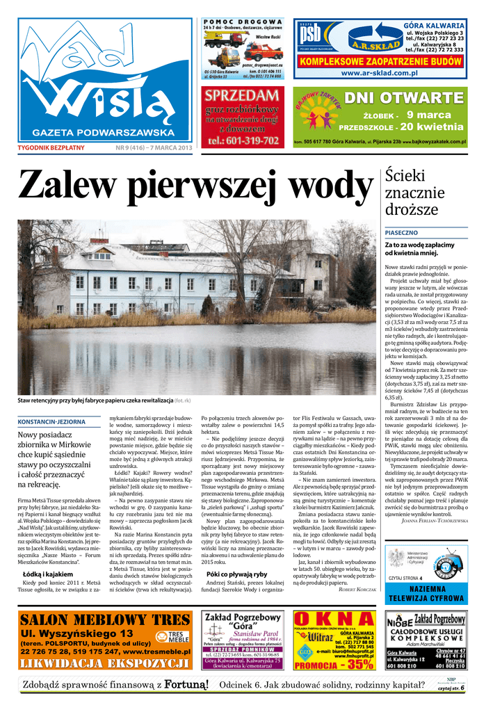 GÓRA KALWARIA ul. Wojska Polskiego 3 tel./fax (22) 727 23 23 ul. Kalwaryjska 8 tel./fax (22) 72 72 333 KOMPLEKSOWE ZAOPATRZENIE BUDÓW www.ar-sklad.com.pl DNI OTWARTE 9 marca PRZEDSZKOLE - 20 kwietnia ŻŁOBEK - tygodnik BEZPŁATNy kom. 505 NR 9 (416) – 7 marca 2013 617 780 Góra Kalwaria, ul. Pijarska 23b www.bajkowyzakatek.com.pl Zalew pierwszej wody Ścieki znacznie droższe piaseczno Za to za wodę zapłacimy od kwietnia mniej. Staw retencyjny przy byłej fabryce papieru czeka rewitalizacja (fot. rk) konstancin-jeziorna Nowy posiadacz zbiornika w Mirkowie chce kupić sąsiednie stawy po oczyszczalni i całość przeznaczyć na rekreację. Firma Metsä Tissue sprzedała akwen przy byłej fabryce, jaz niedaleko Starej Papierni i kanał biegnący wzdłuż al. Wojska Polskiego – dowiedziało się „Nad Wisłą”. Jak ustaliliśmy, użytkownikiem wieczystym obiektów jest teraz spółka Marina Konstancin. Jej prezes to Jacek Rowiński, wydawca miesięcznika „Nasze Miasto – Forum Mieszkańców Konstancina”. Łódką i kajakiem Kiedy pod koniec 2011 r. Metsä Tissue ogłosiła, że w związku z za- mykaniem fabryki sprzedaje budowle wodne, samorządowcy i mieszkańcy się zaniepokoili. Dziś jednak mogą mieć nadzieję, że w mieście powstanie miejsce, gdzie będzie się chciało wypoczywać. Miejsce, które może być jedną z głównych atrakcji uzdrowiska. Łódki? Kajaki? Rowery wodne? Właśnie takie są plany inwestora. Kąpielisko? Jeśli okaże się to możliwe – jak najbardziej. – Na pewno zasypanie stawu nie wchodzi w grę. O zasypaniu kanału czy rozebraniu jazu też nie ma mowy – zaprzecza pogłoskom Jacek Rowiński. Na razie Marina Konstancin pyta posiadaczy gruntów przyległych do zbiornika, czy byliby zainteresowani ich sprzedażą. Prezes spółki zdradza, że rozmawiał na ten temat m.in. z Metsä Tissue, która jest w posiadaniu dwóch stawów biologicznych wchodzących w skład oczyszczalni ścieków (trwa ich rekultywacja). Po połączeniu trzech akwenów powstałby zalew o powierzchni 14,5 hektara. – Nie podjęliśmy jeszcze decyzji co do przyszłości naszych stawów – mówi wiceprezes Metsä Tissue Mariusz Jędrzejewski. Przypomina, że sporządzany jest nowy miejscowy plan zagospodarowania przestrzennego wschodniego Mirkowa. Metsä Tissue wystąpiła do gminy o zmianę przeznaczenia terenu, gdzie znajdują się stawy biologiczne. Zaproponowała „zieleń parkową” i „usługi sportu” (ewentualnie farmę słoneczną). Nowy plan zagospodarowania będzie kluczowy, bo obecnie zbiornik przy byłej fabryce to staw retencyjny (a nie rekreacyjny). Jacek Rowiński liczy na zmianę przeznaczenia akwenu i na uchwalenie planu do 2015 roku. Póki co pływają ryby Andrzej Stański, prezes lokalnej fundacji Szerokie Wody i organiza- tor Flis Festiwalu w Gassach, uważa pomysł spółki za trafny. Jego zdaniem zalew – w połączeniu z rozrywkami na lądzie – na pewno przyciągałby mieszkańców. – Kiedy podczas ostatnich Dni Konstancina organizowaliśmy spływ Jeziorką, zainteresowanie było ogromne – zauważa Stański. – Nie znam zamierzeń inwestora. Ale z pewnością będę sprzyjać przedsięwzięciom, które uatrakcyjnią naszą gminę turystycznie – komentuje z kolei burmistrz Kazimierz Jańczuk. Zmiana posiadacza stawu zaniepokoiła za to konstancińskie koło wędkarskie. Jacek Rowiński zapewnia, że jego członkowie nadal będą mogli tu łowić. Odbyły się już zresztą – w lutym i w marcu – zawody podlodowe. Jaz, kanał i zbiornik wybudowano w latach 50. ubiegłego wieku, by zaopatrywały fabrykę w wodę potrzebną do produkcji papieru. Robert Korczak Nowe stawki radni przyjęli w poniedziałek prawie jednogłośnie. Projekt uchwały miał być głosowany jeszcze w lutym, ale wówczas rada uznała, że został przygotowany w pośpiechu. Co więcej, stawki zaproponowane wtedy przez Przedsiębiorstwo Wodociągów i Kanalizacji (3,53 zł za m3 wody oraz 7,5 zł za m3 ścieków) wzbudziły zastrzeżenia nie tylko radnych, ale i kontrolującego tę gminną spółkę audytora. Podjęto więc decyzję o dopracowaniu projektu w komisjach. Nowe stawki mają obowiązywać od 7 kwietnia przez rok. Za metr sześcienny wody zapłacimy 3, 25 zł netto (dotychczas 3,75 zł), zaś za metr sześcienny ścieków 7,45 zł (dotychczas 6,35 zł). Burmistrz Zdzisław Lis przypomniał radnym, że w budżecie na ten rok zarezerwowali 3 mln zł na dotowanie gospodarki ściekowej. Jeśli więc zdecydują się przeznaczyć te pieniądze na dotację celową dla PWiK, stawki mogą ulec obniżeniu. Niewykluczone, że projekt uchwały w tej sprawie trafi pod obrady 20 marca. Tymczasem nieoficjalnie dowiedzieliśmy się, że audyt dotyczący stawek zaproponowanych przez PWiK nie był jedynym przeprowadzonym ostatnio w spółce. Część radnych chciałaby poznać jego treść i planuje zwrócić się do burmistrza z prośbą o ujawnienie wyników kontroli. Joanna Ferlian-Tchórzewska CZYTAJ STRONA 4 NAZIEMNA TELEWIZJA CYFROWA Ul. Wyszyńskiego 13 (teren. POLSPORTU, budynek od ulicy) 22 726 75 28, 519 175 247, www.tresmeble.pl Zdobądź sprawność finansową z Fortuną! Odcinek 6. Jak zbudować solidny, rodzinny kapitał? czytaj str. 6 2 ~ NadWisłą ~ wydarzenia Władze: Podwyżka musi być góra kalwaria Kilkuprocentowy wzrost cen wody i ścieków zachwiał jednomyślnością ekipy rządzącej gminą. Od kwietnia mieszkańcy zapłacą za wodę o 3,9 proc. więcej (3,6 zł za m3 plus VAT), a zrzut ścieków do kanalizacji zdrożeje o 4,1 proc. (do 5,74 zł za m3 plus VAT dla gospodarstw domowych). O 7,9 proc. wzrośnie miesięczny abonament dla odbiorców wody (do 3 zł plus VAT). Pensje tak nie rosną Burmistrz Dariusz Zieliński, który zatwierdził taryfy zaproponowane przez Zakład Gospodarki Komunalnej, przekonywał podczas sesji 26 lutego, że podwyżki „nie uderzą w społeczeństwo”. – Statystyczny mieszkaniec zapłaci za wodę za- By