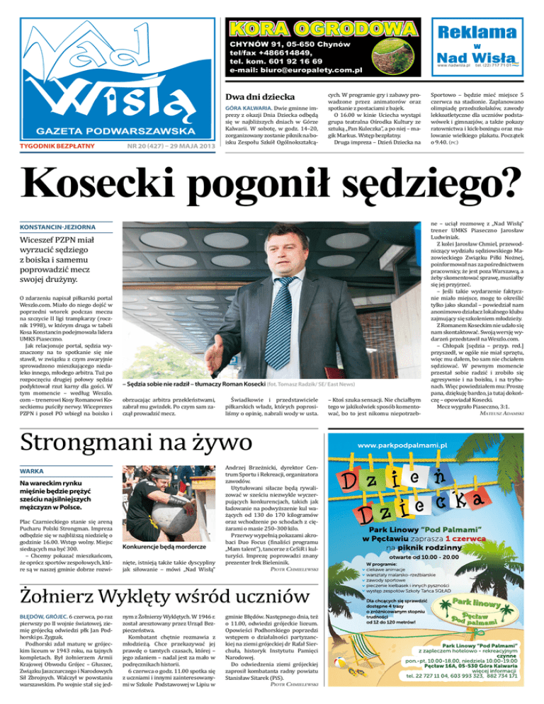 Reklama w www.nadwisla.pl Dwa dni dziecka tygodnik BEZPŁATNy NR 20 (427) – 29 maja 2013 Góra Kalwaria. Dwie gminne imprezy z okazji Dnia Dziecka odbędą się w najbliższych dniach w Górze Kalwarii. W sobotę, w godz. 14–20, zorganizowany zostanie piknik na boisku Zespołu Szkół Ogólnokształcą- cych. W programie gry i zabawy prowadzone przez animatorów oraz spotkanie z postaciami z bajek. O 16.00 w kinie Uciecha wystąpi grupa teatralna Ośrodka Kultury ze sztuką „Pan Kuleczka”, a po niej – magik Markus. Wstęp bezpłatny. Druga impreza – Dzień Dziecka na tel. (22) 717 71 01 Sportowo – będzie mieć miejsce 5 czerwca na stadionie. Zaplanowano olimpiadę przedszkolaków, zawody lekkoatletyczne dla uczniów podstawówek i gimnazjów, a także pokazy ratownictwa i kick-boxingu oraz malowanie wielkiego plakatu. Początek o 9.40. (pc) Kosecki pogonił sędziego? Konstancin-Jeziorna Wiceszef PZPN miał wyrzucić sędziego z boiska i samemu poprowadzić mecz swojej drużyny. O zdarzeniu napisał piłkarski portal Weszlo.com. Miało do niego dojść w poprzedni wtorek podczas meczu na szczycie II ligi trampkarzy (rocznik 1998), w którym druga w tabeli Kosa Konstancin podejmowała lidera UMKS Piaseczno. Jak relacjonuje portal, sędzia wyznaczony na to spotkanie się nie stawił, w związku z czym awaryjnie sprowadzono mieszkającego niedaleko innego, młodego arbitra. Tuż po rozpoczęciu drugiej połowy sędzia podyktował rzut karny dla gości. W tym momencie – według Weszlo. com – trenerowi Kosy Romanowi Koseckiemu puściły nerwy. Wiceprezes PZPN i poseł PO wbiegł na boisko i – Sędzia sobie nie radził – tłumaczy Roman Kosecki (fot. Tomasz Radzik/ SE/ East News) obrzucając arbitra przekleństwami, zabrał mu gwizdek. Po czym sam zaczął prowadzić mecz. Świadkowie i przedstawiciele piłkarskich władz, których poprosiliśmy o opinię, nabrali wody w usta. Strongmani na żywo warka Na wareckim rynku mięśnie będzie prężyć sześciu najsilniejszych mężczyzn w Polsce. Plac Czarnieckiego stanie się areną Pucharu Polski Strongman. Impreza odbędzie się w najbliższą niedzielę o godzinie 16.00. Wstęp wolny. Miejsc siedzących ma być 300. – Chcemy pokazać mieszkańcom, że oprócz sportów zespołowych, które są w naszej gminie dobrze rozwi- nięte, istnieją także takie dyscypliny jak siłowanie – mówi „Nad Wisłą” Błędów, Grójec. 6 czerwca, po raz pierwszy po II wojnie światowej, ziemię grójecką odwiedzi płk Jan Podhorski ps. Zygzak. Podhorski zdał maturę w grójeckim liceum w 1943 roku, na tajnych kompletach. Był żołnierzem Armii Krajowej Obwodu Grójec – Głuszec, Związku Jaszczurczego i Narodowych Sił Zbrojnych. Walczył w powstaniu warszawskim. Po wojnie stał się jed- nym z Żołnierzy Wyklętych. W 1946 r. został aresztowany przez Urząd Bezpieczeństwa. Kombatant chętnie rozmawia z młodzieżą. Chce przekazywać jej prawdę o tamtych czasach, której – jego zdaniem – nadal jest za mało w podręcznikach historii. 6 czerwca o godz. 11.00 spotka się z uczniami i innymi zainteresowanymi w Szkole Podstawowej w Lipiu w Konkurencje będą mordercze Andrzej Brzeżnicki, dyrektor Centrum Sportu i Rekreacji, organizatora zawodów. Utytułowani siłacze będą rywalizować w sześciu niezwykle wyczerpujących konkurencjach, takich jak ładowanie na podwyższenie kul ważących od 130 do 170 kilogramów oraz wchodzenie po schodach z ciężarami o masie 250–300 kilo. Przerwy wypełnią pokazami akrobaci Duo Focus (finaliści programu „Mam talent”), tancerze z CeSiR i kulturyści. Imprezę poprowadzi znany prezenter Irek Bieleninik. Piotr Chmielewski C M Y CM MY CY CMY K Żołnierz Wyklęty wśród uczniów gminie Błędów. Następnego dnia, też o 11.00, odwiedzi grójeckie liceum. Opowieści Podhorskiego poprzedzi wstępem o działalności partyzanckiej na ziemi grójeckiej dr Rafał Sierchuła, historyk Instytutu Pamięci Narodowej. Do odwiedzenia ziemi grójeckiej zaprosił kombatanta radny powiatu Stanisław Sitarek (PiS). Piotr Chmielewski – Ktoś szuka sensacji. Nie chciałbym tego w jakikolwiek sposób komentować, bo to jest nikomu niepotrzeb- plakat dzien dziecka pod palmami B2.ai 1 2013-05-21 11:08:39 ne – uciął rozmowę z „Nad Wisłą” trener UMKS Piaseczno Jarosław Ludwiniak. Z kolei Jarosław Chmiel, przewodniczący wydziału sędziowskiego Mazowieckiego Związku Piłki Nożnej, poinformował nas za pośrednictwem pracownicy, że jest poza Warszawą, a żeby skomentować sprawę, musiałby się jej przyjrzeć. – Jeśli takie wydarzenie faktycznie miało miejsce, mogę to określić tylko jako skandal – powiedział nam anonimowo działacz lokalnego klubu zajmujący się szkoleniem młodzieży. Z Romanem Koseckim nie udało się nam skontaktować. Swoją wersję wydarzeń przedstawił na Weszlo.com. – Chłopak [sędzia – przyp. red.] przyszedł, w ogóle nie miał sprzętu, więc mu dałem, bo sam nie chciałem sędziować. W pewnym momencie przestał sobie radzić i zrobiło się agresywnie i na boisku, i na trybunach. Więc powiedziałem mu: Proszę pana, dziękuję bardzo, ja tutaj dokończę – opowiadał Kosecki. Mecz wygrało Piaseczno, 3:1. Mateusz Adamski 2 reklama ~ NadWisłą ~ Słodko-kwaśne miny kierowców tarczyn Uczniowie tarczyńskiego Zespołu Szkół wcielili się w policjantów drogówki. Mandatami były cytryny. Tak 17 maja wyglądały kontrole drogowe na krajowej „7” w Tarczynie. Młodzież ucząca się w I i II klasie liceum o profilu policyjnym samodzielnie mogła sprawdzić, jak wygląda praca drogówki. Nastolatki uważnie obserwowały kierowców i gdy tylko zauważyły coś niepokojącego, dawały znać policjantowi, by wskazał „lizakiem” na pobocze. Prowadzący samochody musieli wysłuchać pod swoim adresem uwag o zagrożeniu, jakie spowodowali, jadąc zbyt szybko lub łamiąc inne przepisy. Na koniec – za karę – musieli zjeś