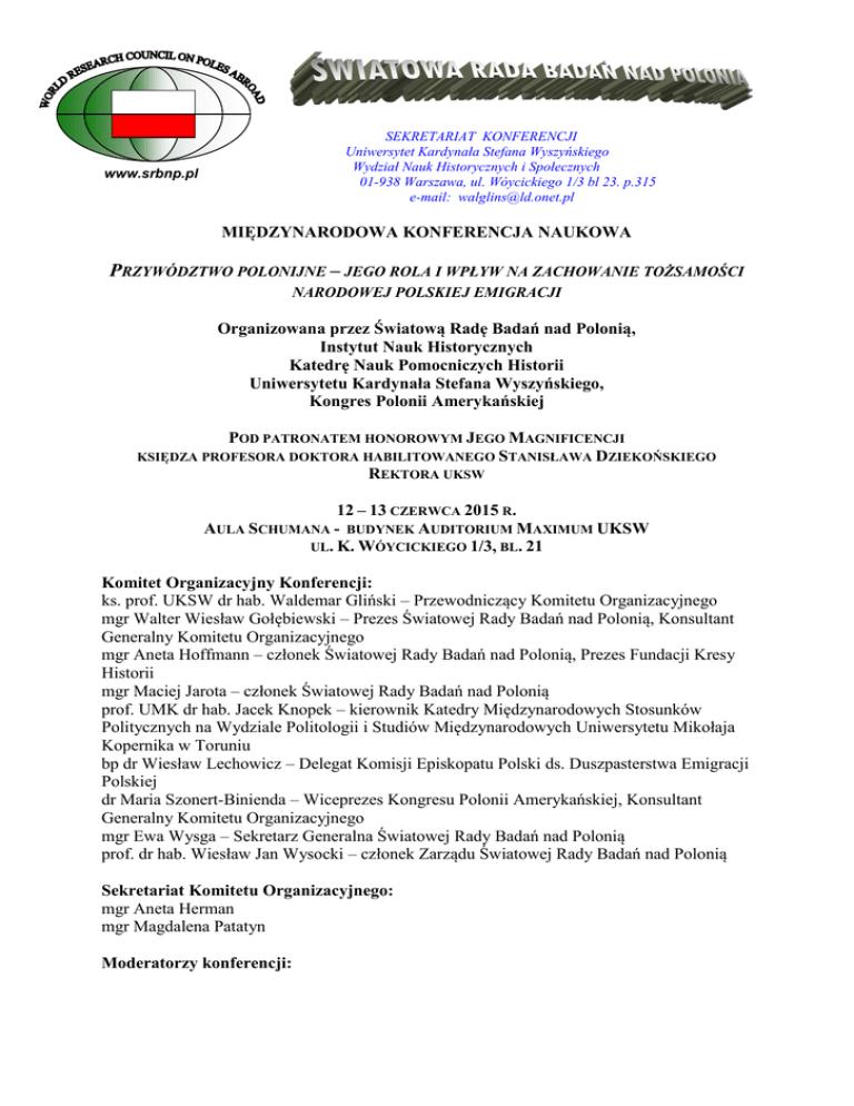 SEKRETARIAT KONFERENCJI Uniwersytet Kardynała Stefana Wyszyńskiego Wydział Nauk Historycznych i Społecznych 01-938 Warszawa, ul. Wóycickiego 1/3 bl 23. p.315 e-mail: [email protected] www.srbnp.pl MIĘDZYNARODOWA KONFERENCJA NAUKOWA PRZYWÓDZTWO POLONIJNE – JEGO ROLA I WPŁYW NA ZACHOWANIE TOŻSAMOŚCI NARODOWEJ POLSKIEJ EMIGRACJI Organizowana przez Światową Radę Badań nad Polonią, Instytut Nauk Historycznych Katedrę Nauk Pomocniczych Historii Uniwersytetu Kardynała Stefana Wyszyńskiego, Kongres Polonii Amerykańskiej POD PATRONATEM HONOROWYM JEGO MAGNIFICENCJI KSIĘDZA PROFESORA DOKTORA HABILITOWANEGO STANISŁAWA DZIEKOŃSKIEGO REKTORA UKSW 12 – 13 CZERWCA 2015 R. AULA SCHUMANA - BUDYNEK AUDITORIUM MAXIMUM UKSW UL. K. WÓYCICKIEGO 1/3, BL. 21 Komitet Organizacyjny Konferencji: ks. prof. UKSW dr hab. Waldemar Gliński – Przewodniczący Komitetu Organizacyjnego mgr Walter Wiesław Gołębiewski – Prezes Światowej Rady Badań nad Polonią, Konsultant Generalny Komitetu Organizacyjnego mgr Aneta Hoffmann – członek Światowej Rady Badań nad Polonią, Prezes Fundacji Kresy Historii mgr Maciej Jarota – członek Światowej Rady Badań nad Polonią prof. UMK dr hab. Jacek Knopek – kierownik Katedry Międzynarodowych Stosunków Politycznych na Wydziale Politologii i Studiów Międzynarodowych Uniwersytetu Mikołaja Kopernika w Toruniu bp dr Wiesław Lechowicz – Delegat Komisji Episkopatu Polski ds. Duszpasterstwa Emigracji Polskiej dr Maria Szonert-Binienda – Wiceprezes Kongresu Polonii Amerykańskiej, Konsultant Generalny Komitetu Organizacyjnego mgr Ewa Wysga – Sekretarz Generalna Światowej Rady Badań nad Polonią prof. dr hab. Wiesław Jan Wysocki – członek Zarządu Światowej Rady Badań nad Polonią Sekretariat Komitetu Organizacyjnego: mgr Aneta Herman mgr Magdalena Patatyn Moderatorzy konferencji: prof. UMK dr hab. Jacek Knopek – kierownik Katedry Międzynarodowych Stosunków Politycznych na Wydziale Politologii i Studiów Międzynarodowych Uniwersytetu Mikołaja Kopernika w Toruniu prof. dr hab. Wiesław Jan Wysocki – członek Zarządu Światowej Rady Badań nad Polonią HARMONOGRAM KONFERENCJI 12 CZERWCA (PIĄTEK) GODZ. 9.00 –9.40 Inauguracja konferencji: - mgr Walter Gołębiewski, Prezes ŚRBnP – powitanie gości i uczestników konferencji, - wystąpienia gospodarza konferencji: Jego Magnificencji ks. prof. UKSW dr hab. Stanisława Dziekońskiego – Rektora UKSW, - wystąpienie biskupa dr Wiesława Lechowicza – delegata ds. Duszpasterstwa Emigracji Polskiej Konferencji Episkopatu Polski, - wystąpienie Dyrektora Departamentu Współpracy z Polonią i Polakami za Granicą MSZ RP – Wojciecha Tycińskiego, - wystąpienie Wicemarszałka Senatu RP – Stanisława Karczewskiego, - wystąpienie Prezesa Zarządu Krajowego Stowarzyszenia Wspólnota Polska – Longina Komołowskiego, - wystąpienie Przewodniczącego Komisji Łączności z Polakami za Granicą Sejmu RP – Adama Lipińskiego, - wystąpienie posła Adama Kwiatkowskiego – członka Komisji Łączności z Polakami za Granicą Sejmu RP. GODZ. 9.40 - 10.00 Przerwa na kawę GODZ. 10.00-11.40 Problemy przywództwa polonijnego w wymiarze globalnym (panel I, moderator – prof. dr hab. Wiesław Jan Wysocki) 1. Dr inż. Aleksander Maciej Jabłoński (Instytut Naukowy im. Oskara Haleckiego w Kanadzie), Jerzy Czartoryski (Kongres Polonii Kanadyjskiej, Ottawa): Strategiczne cele Polonii. 2. Stefan Skulski (Związek Narodowy Polski w Kanadzie): Rola organizacji polonijnych w kształtowaniu i utrwalaniu relacji integralności międzypokoleniowej Polonii. 3. Ks. mgr Damian Szczepanik (ŚRBnP): Polonia jutra. Integracyjna inicjatywa Stanisława Brodzkiego jako przykład budowania przywództwa polonijnego. 4. Mec. Piotr Łukasz Juliusz Andrzejewski (Trybunał Stanu RP, ŚRBnP): Ustawa o podwójny obywatelstwie – wezwanie do aktywności Polonii. 5. Dr Maria Szonert-Binienda (Kongres Polonii Amerykańskiej, ŚRBnP): Reprezentacja Polonii w Polskim Parlamencie - uwarunkowania polityczne, prawne i organizacyjne. GODZ. 11.40-12.00 Dyskusja GODZ. 12.00-14.20 Znaczenie Kościoła katolickiego w kreowaniu przywództwa polonijnego (panel II, moderator – prof. dr hab. Wiesław Jan Wysocki) 6. Dr Zbigniew Tomasz Klimaszewski (ŚRBnP): Ksiądz dr Bolesław Domański – przywódca duchowy i polityczny polskiej mniejszości narodowej w Niemczech. 7. Ks dr hab. Józef Szymański (ŚRBnP): Rola Polskiej Misji Katolickiej we Francji w okresie międzywojennym w zachowaniu i obronie narodowych i religijnych wartości wychodźstwa polskiego. 8. Ks. dr Adam Romejko (Instytut Politologii, Uniwersytet Gdański): Duszpasterstwo polskie jako przestrzeń instytucjonalizacji życia polonijnego w Wielkiej Brytanii. 9. Ks. prof. dr hab. Bernard Kołodziej (Towarzystwo Chrystusowe Poznań, GWSP im. Hlonda w Mysłowicach, wykłady zlecone WT UAM, ŚRBnP): Chrystusowcy w posłudze Polakom w USA. 10. Ks. dr Roman Nir (Instytut Historii i Archiwistyki Polonijnej w Chicago, ŚRBnP): Działalność Pastoralnego Apostolatu Polskiego w USA. 11. Ks. prof. dr hab. Stanisław Nabywaniec (Uniwersytet Rzeszowski): Wkład polskiego duchowieństwa w tworzenie i podtrzymywanie wspólnot, organizacji i instytucji polonijnych w Wisconsin (na przykładzie diecezji La Crosse). 12. Mgr Paweł Glugla (Uniwersytet Rzeszowski): Przywództwo duchowe Misjonarzy na wschodzie Europy – wczoraj i dziś. GODZ. 14.20-14.40 Dyskusja GODZ. 14.40-15.20 Przerwa na obiad GODZ. 15.20-17.40 Wybrane problemy przywództwa polonijnego w krajach pozaeuropejskich (panel III, moderator – prof. UMK dr hab. Jacek Knopek ). 13. Dr Norbert Wójtowicz (IPN, ŚRBnP): Konstanty Zygfryd Hanff i Organizacja Bojowa Wolna Polska, próba integracji czy dezintegracja środowisk polonijnych? 14. Ks. dr Zdzisław Malczewski (Polska Misja Katolicka w Brazylii): Czy można mówić o przywództwie wśród Polonii brazylijskiej? Próba zarysowania problematyki. 15. Mgr Magdale