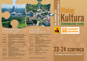 Dni Ożarowa 2012 24 czerwca 2012 (niedziela) 12.00 – zwiedzanie Zakładu Grupy Ożarów S.A. (postój oznaczonego autokaru obok bramy wjazdowej na plac targowy - odjazdy o godz. 12.00, 13.00, 14.00) 12.00-20.00 – Miasteczko Dziecięce: wszystkie atrakcje dla dzieci bezpłatne 15.00-18.00 – namiot dyskusyjny dla służb: ZUS, BHP, PIP oraz WOMP 15.00-18.00 – „Gry miejskie” – impreza integracyjna w przerwie: 16.15-16.30 – wręczenie nagród dla osób aktywnie działających w zakresie BHP 16.30-18.00 – blok młodzieżowy (występ zespołu 4H oraz młodzieży z Dębna) 18.00-18.20 – wręczenie nagród dla osób, które brały udział w „Grach miejskich” 18.20-19.20 – występ zespołu CHMIELNIKERS 19.20-19.30 – wyróżnienia okolicznościowe 19.30-19.50 – wręczenie statuetek dla osób aktywnie działających w zakresie BHP 19.50-20.55 – występ zespołu BAS TAJPAN 21.00-22.30 – Gwiazda wieczoru KASIA KOWALSKA z zespołem 22.30-2. 00 – „Dyskoteka show z rewią tańca nowoczesnego” 2.00 – zakończenie imprezy 10.00-20.00– MIASTECZKO DZIECIĘCE – wszystkie atrakcje dla dzieci bezpłatne 15.00-15.30– występ dzieci z Publicznego Przedszkola w Ożarowie 15.30-15.50– RYSIO KRUK – minikoncert 15.50-16.20– program artystyczny przygotowany przez GOK w Tarłowie (taniec i humor) 16.20-17.00– występ zespołów folklorystycznych z MGOK w Ożarowie cz. 1 17.00-17.15– uroczyste otwarcie Dni Miasta 2012 17.15-17.30– występ zespołów folklorystycznych z MGOK w Ożarowie cz. 2 17.30-18.30– ANDREO I KARINA 18.30-20.30– blok programów artystycznych z MGOK w Ożarowie 20.30-22.00– gwiazda wieczoru – EWA FARNA 22.00 zakończenie imprezy Prowadzący: Joanna Stachurska i Wojciech Szymański Prowadzący: Teresa Opałka i Andrzej Dąbrowski – DZIEŃ OTWARTY GRUPY OŻARÓW S.A. DNI OŻAROWA 2012 Dzień Otwarty Grupy Ożarów S.A. 23 czerwca 2012 r. (sobota) Dialog Kultura Zrównoważony rozwój 23-24 czerwca Plac targowy w Ożarowie przy ul. Kościuszki
