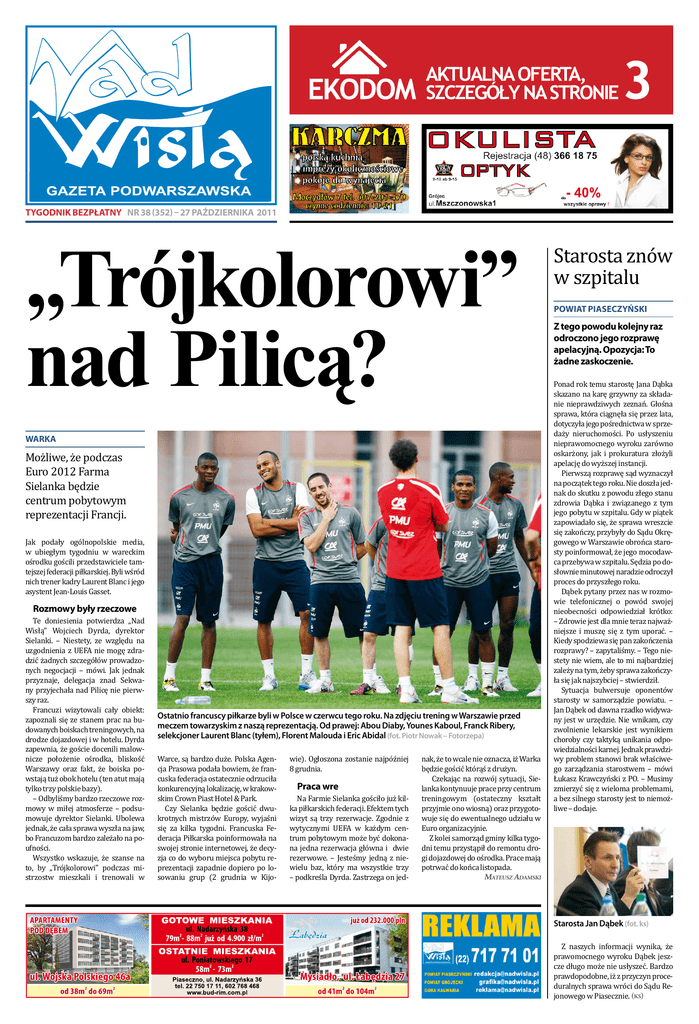 EKODOM AKTUALNA OFERTA, SZCZEGÓŁY NA STRONIE 3 tygodnik BEZPŁATNy NR 38 (352) – 27 października 2011 „Trójkolorowi” nad Pilicą? warka Możliwe, że podczas Euro 2012 Farma Sielanka będzie centrum pobytowym reprezentacji Francji. Jak podały ogólnopolskie media, w ubiegłym tygodniu w wareckim ośrodku gościli przedstawiciele tamtejszej federacji piłkarskiej. Byli wśród nich trener kadry Laurent Blanc i jego asystent Jean-Louis Gasset. Rozmowy były rzeczowe Te doniesienia potwierdza „Nad Wisłą” Wojciech Dyrda, dyrektor Sielanki. – Niestety, ze względu na uzgodnienia z UEFA nie mogę zdradzić żadnych szczegółów prowadzonych negocjacji – mówi. Jak jednak przyznaje, delegacja znad Sekwany przyjechała nad Pilicę nie pierwszy raz. Francuzi wizytowali cały obiekt: zapoznali się ze stanem prac na budowanych boiskach treningowych, na drodze dojazdowej i w hotelu. Dyrda zapewnia, że goście docenili malownicze położenie ośrodka, bliskość Warszawy oraz fakt, że boiska powstają tuż obok hotelu (ten atut mają tylko trzy polskie bazy). – Odbyliśmy bardzo rzeczowe rozmowy w miłej atmosferze – podsumowuje dyrektor Sielanki. Ubolewa jednak, że cała sprawa wyszła na jaw, bo Francuzom bardzo zależało na poufności. Wszystko wskazuje, że szanse na to, by „Trójkolorowi” podczas mistrzostw mieszkali i trenowali w Ostatnio francuscy piłkarze byli w Polsce w czerwcu tego roku. Na zdjęciu trening w Warszawie przed meczem towarzyskim z naszą reprezentacją. Od prawej: Abou Diaby, Younes Kaboul, Franck Ribery, selekcjoner Laurent Blanc (tyłem), Florent Malouda i Eric Abidal (fot. Piotr Nowak – Fotorzepa) Warce, są bardzo duże. Polska Agencja Prasowa podała bowiem, że francuska federacja ostatecznie odrzuciła konkurencyjną lokalizację, w krakowskim Crown Piast Hotel & Park. Czy Sielanka będzie gościć dwukrotnych mistrzów Europy, wyjaśni się za kilka tygodni. Francuska Federacja Piłkarska poinformowała na swojej stronie internetowej, że decyzja co do wyboru miejsca pobytu reprezentacji zapadnie dopiero po losowaniu grup (2 grudnia w Kijo- wie). Ogłoszona zostanie najpóźniej 8 grudnia. Praca wre Na Farmie Sielanka gościło już kilka piłkarskich federacji. Efektem tych wizyt są trzy rezerwacje. Zgodnie z wytycznymi UEFA w każdym centrum pobytowym może być dokonana jedna rezerwacja główna i dwie rezerwowe. – Jesteśmy jedną z niewielu baz, który ma wszystkie trzy – podkreśla Dyrda. Zastrzega on jed- nak, że to wcale nie oznacza, iż Warka będzie gościć którąś z drużyn. Czekając na rozwój sytuacji, Sielanka kontynuuje prace przy centrum treningowym (ostateczny kształt przyjmie ono wiosną) oraz przygotowuje się do ewentualnego udziału w Euro organizacyjnie. Z kolei samorząd gminy kilka tygodni temu przystąpił do remontu drogi dojazdowej do ośrodka. Prace mają potrwać do końca listopada. Mateusz Adamski Starosta znów w szpitalu powiat piaseczyński Z tego powodu kolejny raz odroczono jego rozprawę apelacyjną. Opozycja: To żadne zaskoczenie. Ponad rok temu starostę Jana Dąbka skazano na karę grzywny za składanie nieprawdziwych zeznań. Głośna sprawa, która ciągnęła się przez lata, dotyczyła jego pośrednictwa w sprzedaży nieruchomości. Po usłyszeniu nieprawomocnego wyroku zarówno oskarżony, jak i prokuratura złożyli apelację do wyższej instancji. Pierwszą rozprawę sąd wyznaczył na początek tego roku. Nie doszła jednak do skutku z powodu złego stanu zdrowia Dąbka i związanego z tym jego pobytu w szpitalu. Gdy w piątek zapowiadało się, że sprawa wreszcie się zakończy, przybyły do Sądu Okręgowego w Warszawie obrońca starosty poinformował, że jego mocodawca przebywa w szpitalu. Sędzia po dosłownie minutowej naradzie odroczył proces do przyszłego roku. Dąbek pytany przez nas w rozmowie telefonicznej o powód swojej nieobecności odpowiedział krótko: – Zdrowie jest dla mnie teraz najważniejsze i muszę się z tym uporać. – Kiedy spodziewa się pan zakończenia rozprawy? – zapytaliśmy. – Tego niestety nie wiem, ale to mi najbardziej zależy na tym, żeby sprawa zakończyła się jak najszybciej – stwierdził. Sytuacja bulwersuje oponentów starosty w samorządzie powiatu. – Jan Dąbek od dawna rzadko widywany jest w urzędzie. Nie wnikam, czy zwolnienie lekarskie jest wynikiem choroby czy taktyką unikania odpowiedzialności karnej. Jednak prawdziwy problem stanowi brak właściwego zarządzania starostwem – mówi Łukasz Krawczyński z PO. – Musimy zmierzyć się z wieloma problemami, a bez silnego starosty jest to niemożliwe – dodaje. Starosta Jan Dąbek (fot. ks) Z naszych informacji wynika, że prawomocnego wyroku Dąbek jeszcze długo może nie usłyszeć. Bardzo prawdopodobne, iż z przyczyn proceduralnych sprawa wróci do Sądu Rejonowego w Piasecznie. (ks) 2 gmina konstancin-jeziorna ~ NadWisłą ~ Niemieckie Denzlingen siódmym formalnym partnerem Gminy Konstancin-Jeziorna Podczas wizyty naszych władz i mieszkańców w Denzlingen podpisano akt partnerstwa między tym miastem a Gminą Konstancin-Jeziorna. Uroczystość była zwieńczeniem działań rozpoczętych w czerwcu bieżącego roku w Konstancinie-Jeziornie. Denzlingen (Badenia-Wirtembergia) jest 7. miastem partnerskim naszej Gminy (dla porównania: Konstancin-Jeziorna stanowi 4. miasto partnerskie Denzlingen). W roku ubiegłym radni obu Gmin jednogłośnie przyjęli uchwały o nawiązaniu partnerstwa pomiędzy obydwoma samorządami, które to uchwały były wstępem do sformalizowania rozpoczętej współpracy. W oficjalnym przemówieniu skierowanym do gości obecnych przy podpisaniu aktu partnerstwa Burmistrz Kazimierz Jańczuk zwrócił uwagę na przyjacielskie relacje łączące mieszkańców obu Gmin. Podkreślił przy tym wagę wzajemnych kontaktów opartych na dialogu i zrozumieniu. Dialog, szacunek i zrozumienie są gwarantem dobrych stosunków między pań