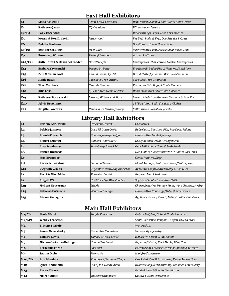 East Hall Exhibitors E1 Linda Kinjerski Cedar Creek Treasures Repurposed Shabby & Chic Gifts & Home Décor E2 Kathleen Quaas KQ Creations Wirewrapped Jewelry E3/E4 Tony Rozendaal E5 Jo-Ann & Don Draheim E6 Debbie Lindauer E7/E8 Jennifer Schulteis D11SC, Inc Mesh Wreaths, Repurposed Cigar Boxes, Soap E9 Rosemary Willner Showoff Creations Aprons & Mittens E10/E11 Ruth Howell & Debra Schroeder Howell Crafts Centerpieces, Dish Towels, Electric Centerpieces E14 Barbara Szymanski Designs by Basia Eyeglass/ID Badge Pins & Hangers, Shawl Pins E15 Paul & Susan Lodl Animal Houses by PSL Bird & Butterfly Houses, Misc. Wooden Items E16 Sandy Bates Christmas Tree Critters Christmas Tree Ornaments E17 Shari VanBeek Cascade Creations Purses, Wallets, Bags, & Table Runners E18 Julie Lesh AJLesh Silver"wear" Jewelry Items made from Silverplate Flatware E19 Kathleen Stopczynski Mittens, Mittens, and More Mittens Made from Recycled Sweaters & Faux Fur E20 Sylvia Bruemmer E21 Brigitte Corcoran Woodturnings - Pens, Bowls, Ornaments Maplewood Pet Beds, Pads, & Toys, Dog Biscuits & Coats Greeting Cards and Home Décor 18" Doll Items, Beds, Furniture, Clothes Renaissance Garden Jewerly Celtic Theme, Gemstone Jewelry Library Hall Exhibitors L1 Darlene Serkowski Occasional Sweets Chocolates L2 Debbie Janssen Dusk Til Dawn Crafts Baby Quilts, Buntings, Bibs, Rag Dolls, Pillows L3 Bonnie Colovich Bonnico Jewelry Designs Handcrafted Beaded Jewelry L4 Robert Lemmer Bamboo Innovations Lucky Bamboo Plant Arrangements L5 Amy Fronberry Sizzleberry Soaps LLC Goat Milk Lotion, Soap & Bath Bombs L6 Debbie Richards L7 Jane Bremmer L8 Karen Schwenkner Common Threads Floral Arrange., Knit Items, Adult/Child Aprons L10 Gwyneth Wilson Gwyneth Wilson Seaglass Artist Authentic Seaglass Art Jewelry & Windows L11 Terri & Allen Miles T-n-A Garden Art Recycled Metal Sculptures L12 Abigail Wier Un-Wined Soy Wax Candles Soy Wax Candles from Wine Bottles L13 Melissa Houterman SiMple Charm Bracelets, Vintage Finds, Wine Charms, Jewelry L14 Deborah Putirskis Windy Gal Designs Handcrafted Handbags/Totes & Accessories L15 Dianne Gallagher Doll Clothes & Accessories for 18" Amer. Girl Dolls Quilts, Runners, Bags Appliance Covers, Towels, Mitts, Caddies, Doll Items Main Hall Exhibitors M1/M2 Linda Ward M2/M3 Wendy Frederick Simple Treasures Quilts - Bed, Lap, Baby, & Table Runners Santa, Snowmen, Penguins, Angels, Elves & more M4 Vincent Picciolo Watercolors M5 Penny Neverdosky Enchanted Emporium Vintage Style Jewelry M6 Tamara Lewis Tammy's Arts & Crafts Handsewn Seasonal Characters M7 Miriam Castanho-Bollinger Unique Sentiments Papercraft Cards, Book Marks, Wine Tags M8 Katherine Foran Foranart Polymer clay bracelets, earrings, pins and hairclips M9 Sabina Diehr Fireworks Highfire Stoneware M10/M11 Erin Manders Knotageek/Perennial Soaps Crocheted Hats & Accessories, Vegan Artisan Soap M12 Cynthia Sandeno Out of the Woods Studio Beadweaving, Metalsmithing, and Bead Embroidery M13 Karen Thoms M14 Sharon Alioto Painted Glass, Wine Bottles, Glasses Sharon's Ornaments Glass & Custom Ornaments South Hall Exhibitors S1 Julie Kweicinski Lighted Snowmen, Lighted Glass Blocks S2 Cindy Trupp Handpainted Glass, Windows, Cards Knit Dishcloths S3 Diane Seymour S4 S5 Jane Schiek Kim Apel S6 Cho Ng Applique Ladies Clothing S7 Tom Fuhrer Country Floral, Victorian Holiday S8 Sharon Gilpin S9 David Senkbeil D & C's Metal Lawn Art Handcrafted Metal Lawn Art S10/11 Julia Desterhoft Parkview General Store Popcorn, Fudge, Candy, Gift Boxes, Popcorn Seed Little Girls Aprons, Embroidered Towels Schiek Originals Kim Stamps It Up Original Painted Items & Ornaments Cards, Hanging Towels, Tile Coasters, Paper Gifts Woven & Crocheted Cloth Non-metallic Necklaces West Hall & West Entrance Exhibitors W1 Deborah Whittenberger Deb's Creations Children's Kitchen, Tool, & Marker Aprons W2 Sharon Powell Crystals & Cards Kumihimo, Chain Maile, Cards, Collages W3 Martha Bresler Blue Barn Candles Handpoured Soy Candles & Related Scented Items W3a Scott Dercks Innovation in Arts & Crafts Functional Pottery W4 Susanne & Charles Reimund The Stoned Birdhouse Birdhouses Made of Cedar & River Rock W5 Debe & Marc Dannecker Cora Gardens Handpainted Glass, Wood, Tin, Canvas, etc W6 Renee Scherr Shared Baskets Handwoven Baskets W7/W8 Rosemary Schires W9 Kathy Sarauer Jewelry-Beaded & Wired, Ornaments Kansachi Bad Kat Beads W10/W11 Kristin Robran W12 Susan Sedushak W13/W14 Fran LeMahieu Unique Earrings & Necklaces Using Stone & Dichrotic Functional & Decorative Handmade Pottery Design Reverie -Suesedu Designs Unique Christmas Stockings, Free-Form Crochet Purses Barbie's Boutique American Girl & Barbie Sized Doll Clothes, Beds & Tents W15 Deanna Peterson Bright as Day Designs Embellished Handbags & Accessories W16 Chris Rees Wheatfield Hill Organics 100% Organic Toffee, Berry Toppings Farmstead Grown W17 Susan Smith A Happy Thought Indeed Jewelry, Home Décor, Cowls, Greeting Cards W18 Rachel Thompson Carnival Cupcakes Handcrafted Cupcakes (Packaged) - Gift Sets WE1 Jenny Kyle-Smith Mixed media Printmaking; Fine Art Glassware & Towels WE2 Dawn Groves Handpainted Wood, Handsewn Items, Penny Rugs WE3 Sandra Kloehn Seasonal & Everyday Florals WE4 Maureen Jasniewski Tiered Treasures Tiered Serving Pieces made of China & Crystal WE5 Barb Schoenherr Barb's Baubles Wirewrapped Pendants, Bracelets & Earrings WE6 Wendy Schuetz Fideler Farm Pantry Homecanned Goods, Jam, Jelly, Pickles Fieldhouse Hall Exhibitors X1/2 Cindy Zingsheim Cindy's Country Crafts Hand-painted Woodcrafts, Seasonal Items & Ornaments X3/4 Lori Stuart L. A. Stuart Swarovski Crystal Bracelets & Handpainted Clothing/Glass X5 Cathy Hildebrandt Nature Made Heaven Scent Soap All Natural Handmade Soaps X6 James Steeno James Steeno Gallery Art Maps, Art Prints, Cards, Original Watercolors X9/10 Maria Berghauer Maria's Enterprises Handpainted Silk, Felted, Sewn Garments, Ponchos & Hats X11 Terry Desormier Chocolate T Toffee, Fudge, Caramel