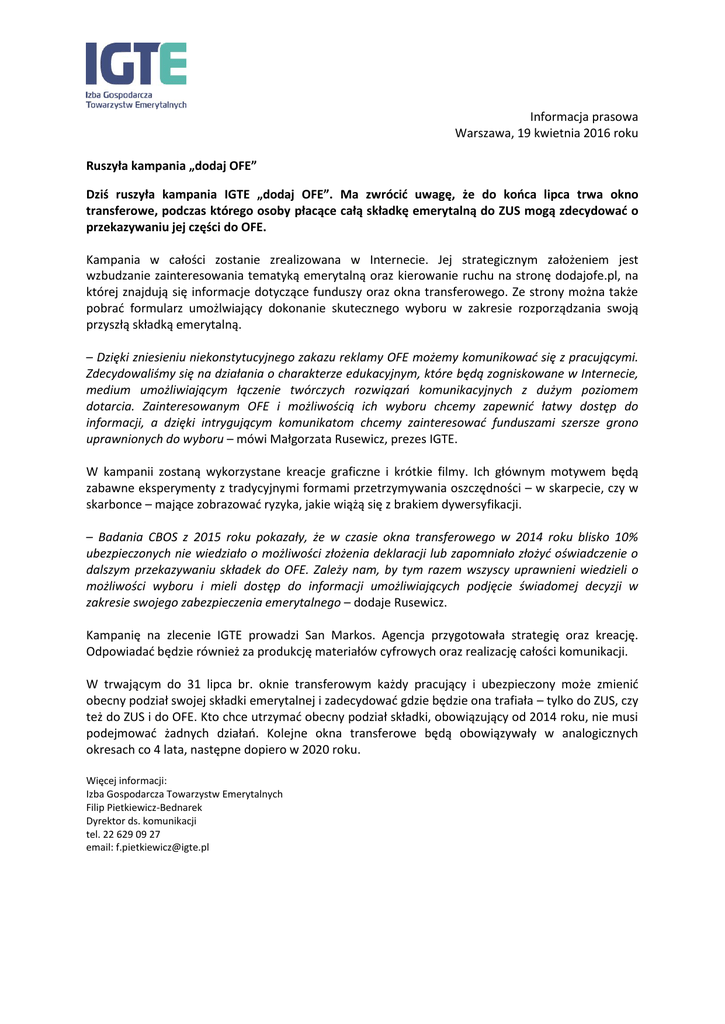 Informacja prasowa Warszawa, 19 kwietnia 2016 roku Ruszyła kampania „dodaj OFE” Dziś ruszyła kampania IGTE „dodaj OFE”. Ma zwrócić uwagę, że do końca lipca trwa okno transferowe, podczas którego osoby płacące całą składkę emerytalną do ZUS mogą zdecydować o przekazywaniu jej części do OFE. Kampania w całości zostanie zrealizowana w Internecie. Jej strategicznym założeniem jest wzbudzanie zainteresowania tematyką emerytalną oraz kierowanie ruchu na stronę dodajofe.pl, na której znajdują się informacje dotyczące funduszy oraz okna transferowego. Ze strony można także pobrać formularz umożlwiający dokonanie skutecznego wyboru w zakresie rozporządzania swoją przyszłą składką emerytalną. – Dzięki zniesieniu niekonstytucyjnego zakazu reklamy OFE możemy komunikować się z pracującymi. Zdecydowaliśmy się na działania o charakterze edukacyjnym, które będą zogniskowane w Internecie, medium umożliwiającym łączenie twórczych rozwiązań komunikacyjnych z dużym poziomem dotarcia. Zainteresowanym OFE i możliwością ich wyboru chcemy zapewnić łatwy dostęp do informacji, a dzięki intrygującym komunikatom chcemy zainteresować funduszami szersze grono uprawnionych do wyboru – mówi Małgorzata Rusewicz, prezes IGTE. W kampanii zostaną wykorzystane kreacje graficzne i krótkie filmy. Ich głównym motywem będą zabawne eksperymenty z tradycyjnymi formami przetrzymywania oszczędności – w skarpecie, czy w skarbonce – mające zobrazować ryzyka, jakie wiążą się z brakiem dywersyfikacji. – Badania CBOS z 2015 roku pokazały, że w czasie okna transferowego w 2014 roku blisko 10% ubezpieczonych nie wiedziało o możliwości złożenia deklaracji lub zapomniało złożyć oświadczenie o dalszym przekazywaniu składek do OFE. Zależy nam, by tym razem wszyscy uprawnieni wiedzieli o możliwości wyboru i mieli dostęp do informacji umożliwiających podjęcie świadomej decyzji w zakresie swojego zabezpieczenia emerytalnego – dodaje Rusewicz. Kampanię na zlecenie IGTE prowadzi San Markos. Agencja przygotowała strategię oraz kreację. Odpowiadać będzie również za produkcję materiałów cyfrowych oraz realizację całości komunikacji. W trwającym do 31 lipca br. oknie transferowym każdy pracujący i ubezpieczony może zmienić obecny podział swojej składki emerytalnej i zadecydować gdzie będzie ona trafiała – tylko do ZUS, czy też do ZUS i do OFE. Kto chce utrzymać obecny podział składki, obowiązujący od 2014 roku, nie musi podejmować żadnych działań. Kolejne okna transferowe będą obowiązywały w analogicznych okresach co 4 lata, następne dopiero w 2020 roku. Więcej informacji: Izba Gospodarcza Towarzystw Emerytalnych Filip Pietkiewicz-Bednarek Dyrektor ds. komunikacji tel. 22 629 09 27 email: [email protected]