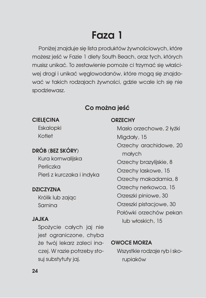 Faza 1 Poni¿ej znajduje siê lista produktów ¿ywnociowych, które mo¿esz jeæ w Fazie 1 diety South Beach, oraz tych, których musisz unikaæ. To zestawienie pomo¿e ci trzymaæ siê w³aciwej drogi i unikaæ wêglowodanów, które mog¹ siê znajdowaæ w takich rodzajach ¿ywnoci, gdzie wcale ich siê nie spodziewasz. Co mo¿na jeæ CIELÊCINA ORZECHY Eskalopki Mas³o orzechowe, 2 ³y¿ki Kotlet Migda³y, 15 DRÓB (BEZ SKÓRY) Kura kornwalijska Perliczka Pier z kurczaka i indyka DZICZYZNA Królik lub zaj¹c Sarnina JAJKA Spo¿ycie ca³ych jaj nie Orzechy arachidowe, 20 ma³ych Orzechy brazylijskie, 8 Orzechy laskowe, 15 Orzechy makadamia, 8 Orzechy nerkowca, 15 Orzeszki piniowe, 30 Orzeszki pistacjowe, 30 Po³ówki orzechów pekan lub w³oskich, 15 jest ograniczone, chyba ¿e twój lekarz zaleci inaczej. W razie potrzeby stosuj substytuty jaj. 24 OWOCE MORZA Wszystkie rodzaje ryb i skorupiaków PRODUKTY MLECZNE Bezt³uszczowy jogurt naturalny Malanka (najwy¿ej 1% t³uszczu) Mleko odt³uszczone Niskot³uszczowe nies³odzo- SERY (najwy¿ej 6 g t³uszczu w porcji) Bezmleczny/sojowy substytut sera mietankowego Cheddar o obni¿onej zawartoci t³uszczu Feta ne mleko sojowe (najwy- Mozzarella ¿ej 5 g t³uszczu w porcji) Parmezan Ricotta PRZYPRAWY I DODATKI Bulion Czosnek Imbir Serek mietankowy niskot³uszczowy Serek wiejski 2% lub bezt³uszczowy Marmite, Vegemite (pasty do smarowania pieczy- S£ODKIE PRZYSMAKI wa na bazie dro¿d¿y) (ograniczyæ do 75 kalorii/ Musztarda /315 kilod¿uli dziennie) Ocet Galaretka bez cukru Olejki (migda³owy, wani- Guma do ¿ucia bez cukru liowy itd.) Kakao nie s³odzone Ostry sos paprykowy Lizaki bez cukru Pieprz (czarny, cayenne, Substytut cukru (s³odzik) czerwony, bia³y) Twarde cukierki bez cukru Przyprawy korzenne Sok cytrynowy i limonkowy T£USZCZE Sos sojowy light Olej arachidowy Sos Worcestershire Olej z orzechów w³oskich Zio³a Olej z rzepaku typu canola 25 Oliwa z oliwek Ogórki Substytuty mas³a bez t³usz- Orzech wodny czów trans TOFU Gatunki naturalne (a nie sma¿one w g³êbokim t³uszczu) WARZYWA I ROLINY STR¥CZKOWE Awokado Bak³a¿any Botwina Broku³y Cebula Ciecierzyca Papryka Pomidory Rukiew wodna Rzepa Sa³ata (wszystkie odmiany) Seler Soczewica Szalotka Szparagi Szpinak WÊDLINY Tylko bezt³uszczowe albo niskot³uszczowe Cukinia Fasola (wie¿a lub suszo- WIEPRZOWINA ne ziarno) Chudy bekon Groch suszony ³uskany Polêdwica Groszek bez³ykowy Szynka gotowana Grzyby (wszystkie odmiany) Kalafior Kapusta Chude czêci, takie jak: Karczochy Górna czêæ udca (krzy- Kie³ki fasoli Kie³ki lucerny 26 WO£OWINA ¿owa) Polêdwica (tak¿e mielona) Czego unikaæ Brie DRÓB Edamski Gê Kaczka Przetworzone produkty z drobiu Skrzyd³a i nogi kurczaka JAGNIÊCINA T³uste czêci, takie jak: £opatka W¹troba NABIA£ Jogurty, wie¿e i mro¿one Lody Mleko pe³ne i o obni¿onej zawartoci t³uszczu S³odzone mleko sojowe OWOCE W Fazie 1 nale¿y unikaæ wszystkich owoców i soków owocowych SERY Wszystkie sery pe³not³uste, w tym: SKROBIE W Fazie 1 nale¿y unikaæ wszystkich produktów skrobiowych. Wyklucz miêdzy innymi: Macê Makaron, wszystkie rodzaje Owsiankê Pieczywo, wszystkie rodzaje P³atki zbo¿owe Produkty m¹czne i pieczywo cukiernicze, wszystkie rodzaje Ry¿, wszystkie rodzaje WARZYWA Buraki Jamsy Karczochy jerozolimskie Kukurydza Marchew Ziemniaki bia³e Ziemniaki s³odkie 27 WIEPRZOWINA Mostek Kie³basa ¯eberka Szynka pieczona w miodzie INNE WO£OWINA Wszelkie alkohole, w tym T³uste czêci, takie jak: wino i piwo Faza 2 Podobnie jak dla Fazy 1, dla Fazy 2 równie¿ podajemy zalecenia dotycz¹ce produktów, które mo¿na jeæ. Pierwszy wykaz zawiera rodzaje ¿ywnoci, które powiniene z powrotem wprowadziæ do swojego jad³ospisu. Druga lista podaje te, które mo¿na jeæ bardzo rzadko je¿eli pozwolisz sobie na nie zbyt czêsto, spowoduj¹ du¿e wahania poziomu cukru we krwi i zniwecz¹ twoje wysi³ki, jeli chodzi o schudniêcie. Co mo¿na z powrotem wprowadziæ do jad³ospisu OWOCE Brzoskwinie Czarne jagody i borówki amerykañskie 28 Melony o zielonym, pomarañczowym i ¿ó³tym mi¹¿szu Morele, wie¿e i suszone Grejpfruty Pomarañcze Gruszki liwki Jab³ka Truskawki Kiwi Winogrona Mango Winie SKROBIE (ograniczaæ) Bajgle, ma³e, z pe³nego ziarna Pra¿ona kukurydza (pra¿ona powietrzem) Ry¿ Jêczmieñ br¹zowy Makarony z pe³nego ziarna dziki Pieczywo pe³noziarniste WARZYWA ry¿owe I ROLINY STR¥CZKOWE wielozbo¿owe Marchew z owsa i otrêbów owsia- Zielony groszek nych Ziemniaki s³odkie, ma³e Pita ze ruty z m¹ki pszennej z pe³nego ziarna P³atki zbo¿owe p³atki owsiane (ale nie b³yskawiczne) p³atki niadaniowe o wysokiej zawartoci b³on- INNE Czekolada, deserowa lub gorzka (szukaj czekolady o du¿ej zawartoci kakao i jedz j¹ rzadko) Deser bezt³uszczowy bez cukru Wino czerwone lub bia³e nika, bez cukru Czego nale¿y unikaæ lub jeæ bardzo rzadko OWOCE Owoce z puszki w soku Ananas Rodzynki Arbuz Soki owocowe Banany 29 SKROBIE Bajgle z oczyszczonej m¹ki pszennej Chleb i bu³ki, bia³e i ciemne WARZYWA Buraki Kukurydza Ziemniaki bia³e Ciasteczka Ciasteczka ry¿owe Maca D¿emy Makarony z bia³ej m¹ki Lody P³atki kukurydziane Miód Ry¿, bia³y 30 INNE JAK KORZYSTAÆ Z TEGO PRZEWODNIKA Dieta South Beach nie wymaga liczenia kalorii ani iloci t³uszczu czy wêglowodanów. Jednak nieraz, nawet o tym nie wiedz¹c, mo¿esz byæ nara¿ony na zjedzenie z³ych t³uszczów lub z³ych wêglowodanów, szczególnie kiedy jesz poza domem albo w popiechu. Ten przewodnik dostarczy ci wiedzy niezbêdnej, by wybieraæ zdrow¹ ¿ywnoæ. Jeli bêdziesz dok³adnie siê trzymaæ zawartych w nim wskazówek, mo¿emy ci zagwarantowaæ, ¿e bêdziesz przestrzegaæ zasad diety South Beach zawsze i wszêdzie. Przewodnik przedstawia ponad 1300 produktów ¿ywnociowych uporz¹dkowanych alfabetycznie w obrêbie poszczególnych kategorii. Przy ka¿dym podano ca³kowit¹ iloæ wêglowodanów, cukru i t³uszczu w jednej porcji. W ostatniej kolumnie znajduj