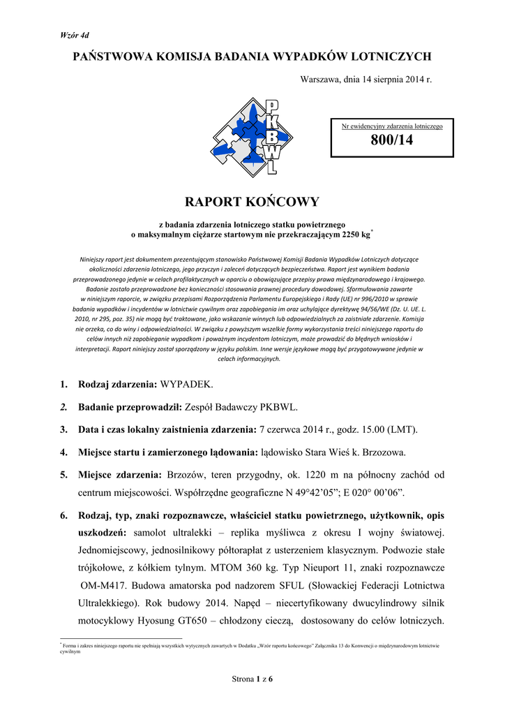 Wzór 4d PAŃSTWOWA KOMISJA BADANIA WYPADKÓW LOTNICZYCH Warszawa, dnia 14 sierpnia 2014 r. Nr ewidencyjny zdarzenia lotniczego 800/14 RAPORT KOŃCOWY z badania zdarzenia lotniczego statku powietrznego o maksymalnym ciężarze startowym nie przekraczającym 2250 kg * Niniejszy raport jest dokumentem prezentującym stanowisko Państwowej Komisji Badania Wypadków Lotniczych dotyczące okoliczności zdarzenia lotniczego, jego przyczyn i zaleceń dotyczących bezpieczeństwa. Raport jest wynikiem badania przeprowadzonego jedynie w celach profilaktycznych w oparciu o obowiązujące przepisy prawa międzynarodowego i krajowego. Badanie zostało przeprowadzone bez konieczności stosowania prawnej procedury dowodowej. Sformułowania zawarte w niniejszym raporcie, w związku przepisami Rozporządzenia Parlamentu Europejskiego i Rady (UE) nr 996/2010 w sprawie badania wypadków i incydentów w lotnictwie cywilnym oraz zapobiegania im oraz uchylające dyrektywę 94/56/WE (Dz. U. UE. L. 2010, nr 295, poz. 35) nie mogą być traktowane, jako wskazanie winnych lub odpowiedzialnych za zaistniałe zdarzenie. Komisja nie orzeka, co do winy i odpowiedzialności. W związku z powyższym wszelkie formy wykorzystania treści niniejszego raportu do celów innych niż zapobieganie wypadkom i poważnym incydentom lotniczym, może prowadzić do błędnych wniosków i interpretacji. Raport niniejszy został sporządzony w języku polskim. Inne wersje językowe mogą być przygotowywane jedynie w celach informacyjnych. 1. Rodzaj zdarzenia: WYPADEK. 2. Badanie przeprowadził: Zespół Badawczy PKBWL. 3. Data i czas lokalny zaistnienia zdarzenia: 7 czerwca 2014 r., godz. 15.00 (LMT). 4. Miejsce startu i zamierzonego lądowania: lądowisko Stara Wieś k. Brzozowa. 5. Miejsce zdarzenia: Brzozów, teren przygodny, ok. 1220 m na północny zachód od centrum miejscowości. Współrzędne geograficzne N 49°42’05”; E 020° 00’06”. 6. Rodzaj, typ, znaki rozpoznawcze, właściciel statku powietrznego, użytkownik, opis uszkodzeń: samolot ultralekki – replika myśliwca z okresu I wojny światowej. Jednomiejscowy, jednosilnikowy półtorapłat z usterzeniem klasycznym. Podwozie stałe trójkołowe, z kółkiem tylnym. MTOM 360 kg. Typ Nieuport 11, znaki rozpoznawcze OM-M417. Budowa amatorska pod nadzorem SFUL (Słowackiej Federacji Lotnictwa Ultralekkiego). Rok budowy 2014. Napęd – niecertyfikowany dwucylindrowy silnik motocyklowy Hyosung GT650 – chłodzony cieczą, dostosowany do celów lotniczych. Forma i zakres niniejszego raportu nie spełniają wszystkich wytycznych zawartych w Dodatku „Wzór raportu końcowego” Załącznika 13 do Konwencji o międzynarodowym lotnictwie cywilnym * Strona 1 z 6 Moc startowa ok. 74 KM. Śmigło drewniane, stałe. Samolot dopuszczony przez nadzór SFUL do prób w locie przed wydaniem zezwolenia na eksploatację. Właściciel, użytkownik – prywatny. Samolot na skutek awarii silnika lądował w terenie przygodnym i został poważnie uszkodzony. Zdjęcie samolotu przed wypadkiem. [foto K. Cwynar] Poniżej kolejne zdjęcia ilustrują charakterystyczne uszkodzenia elementów płatowca i podwozia głównego samolotu, będące następstwem wypadku. Zdjęcie przedstawia fragment uszkodzonego w części przykadłubowej prawego skrzydła [foto PKBWL] Strona 2 z 6 Uszkodzenia prawej części kadłuba – powyżej przód kadłuba, po prawej stronie fragment uszkodzonej kratownicy za kabiną pilota. [foto PKBWL] Zniszczone podwozie główne [foto PKBWL] 7. Typ operacji: lot próbny po modyfikacji układu chłodzenia silnika. Lot w rejonie lądowiska, wg przepisów VFR. 8. Faza lotu: lądowanie awaryjne w terenie przygodnym. 9. Warunki lotu: VMC, przy oświetleniu dziennym. 10. Czynniki pogody: warunki pogodowe nie miały wpływu na zaistnienie zdarzenia. 11. Organizator lotu: prywatny. 12. Dane dotyczące dowódcy statku powietrznego oraz pasażerów: Dowódca statku powietrznego, pilot mężczyzna lat 54, legitymujący się licencją pilota samolotów ultralekkich, wydana przez SFUL, ważną do 11.04.2016 r. Badania lotniczoStrona 3 z 6 lekarskie klasy 2/LAPL, ważne: dla kl.2 - 9.04.2015 r., dla LAPL – 9.04.2016 r. Wg oświadczenia, pilot ukończył szkolenie lotnicze i uzyskał czeską licencję pilota samolotów UL, wydaną przez LAA ČR w 2004 r., którą 2 lipca 2011 r. konwertował na licencję słowacką. Nalot ogólny na samolotach ok. 600 godzin, w tym jako dowódca ok. 580 godzin (wg oświadczenia). Na typie, na którym nastąpił wypadek, pilot wykonał 4 loty w łącznym czasie ok. 40 min. 13. Obrażenia załogi i pasażerów: nie było. 14. Opis przebiegu i analiza zdarzenia: Pilot wykonywał kolejny lot po modyfikacji układu chłodzenia silnika. Samolot po próbach naziemnych wystartował z lądowiska o godzinie 14.55 LMT. Lecąc po małym kręgu samolot osiągnął wysokość 200 m wg QFE. Parametry lotu: prędkość 110 km/h, obroty silnika 6600 min.-1, ciśnienie oleju 5 bar, temperatura oleju 85°C, temperatura płynu chłodzącego 82°C. Parametry były stabilne i bez tendencji do wzrostu, więc pilot zwiększył obroty silnika do 7000 min.-1 i samolot przeszedł na wznoszenie z prędkością 1,5 m/s. Po osiągnięciu 300 m kontynuował lot po obszernym kręgu, ale wtedy pojawiły się silne drgania silnika, który po ok. 6 s nagle przerwał pracę. Pilot zabezpieczył prędkość i przeszedł do lotu szybowego z prędkością 95 km/h. Oceniając oddalenie samolotu od lądowiska (ok. 3 km) i trudny pagórkowaty teren z przeszkodami na trasie dolotu pilot zdecydował się na lądowanie awaryjne w terenie przygodnym. W końcowej fazie podejścia samolot zahaczył prawym dolnym skrzydłem o niewielkie drzewo i wykonał cyrkiel o ok. 90°, poczym zsunął się po niewielkiej skarpie na przyległe pole. Miejsce zdarzenia – zdjęcie wykonano po usunięciu samolotu z miejsca wypadku [foto PKBWL] Strona 4 z 6 Pilot nie odniósł obrażeń i o własnych siłach o