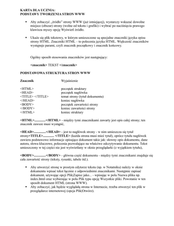 KARTA DLA UCZNIA: PODSTAWY TWORZENIA STRON WWW Aby zobaczyć „źródło” strony WWW (już istniejącej), wystarczy wskazać dowolne miejsce (obszar) strony (wolne od tekstu i grafiki) i wybrać po naciśnięciu prawego klawisza myszy opcję Wyświetl źródło. Ukaże się plik tekstowy, w którym umieszczone są specjalne znaczniki języka opisu strony HTML. Znaczniki HTML – to polecenia języka HTML. Większość znaczników występuje parami, czyli znacznik początkowy i znacznik końcowy. Ogólny sposób stosowania znaczników jest następujący: <znacznik> TEKST </znacznik> PODSTAWOWA STRUKTURA STRON WWW Znacznik Wyjaśnienie <HTML> <HEAD> <TITLE> </TITLE> </HEAD> <BODY> </BODY> </HTML> początek struktury początek nagłówka temat strony (tytuł dokumentu) koniec nagłówka początek zawartości strony koniec zawartości strony koniec struktury <HTML>.............</HTML> - między tymi znacznikami zawarty jest opis całej strony; ten znacznik zawsze musi wystąpić, <HEAD>..............</HEAD> - jest to nagłówek strony - w nim umieszcza się tytuł strony<TITLE>............. </TITLE> (każda strona musi mieć tytuł), oprócz tytułu nagłówek zawiera podstawowe informacje opisujące dokument takie jak: słowny opis dokumentu, dane autora, słowa kluczowe, polecenia pozwalające na właściwe odczytywanie dokumentu. Tekst umieszczony w tej części nie jest wyświetlany w oknie przeglądarki (z wyjątkiem tytułu), <BODY>..............</BODY> - główna część dokumentu - między tymi znacznikami znajduje się cała zawartość strony (teksty, rysunki, tabele itd.). Aby utworzyć stronę w prostym edytorze tekstu (np. w Notatniku) należy w oknie dokumentu wpisać tekst łącznie z odpowiednimi znacznikami. Następnie zapisać dokument, używając opcji Plik|Zapisz jako... - wpisując w polu Nazwa pliku np. index.html oraz wybierając w polu Plik typu opcję Wszystkie pliki. Powstanie w ten sposób dokument HTML (strona WWW). Aby zobaczyć, jak będzie wyglądałą strona w Internecie, trzeba otworzyć ten plik w przeglądarce internetowej (opcja Plik|Otwórz). PODSTAWOWE POLECENIA JĘZYKA HTML POLECENIE OPIS - ZNACZENIE <I>Tekst</I> Czcionka pochylona <B> Tekst</B> Czcionka pogrubiona <U> Tekst</U> Czcionka podkreślona <CENTER>Tekst</CENTER> Ustawienie tekstu i grafiki na środku strony <BR> Przeniesienie tekstu o jeden wiersz w dół <P> </P> Wprowadzenie akapitu poprzedzonego interlinią <P ALIGN=”center”> </P>Ustawienie akapitu na środku <P ALIGN=”left”> </P> Wyrównanie akapitu do lewego marginesu <P ALIGN=”right”> </P> Wyrównanie akapitu do prawego marginesu <P ALIGN=”justify”> </P> Wyrównanie akapitu do lewego i prawego marginesu <FONT COLOR=” kolor”> Tekst</FONT> Kolor czcionki np. <FONT COLOR=”red”> <FONT SIZE=”X”> Tekst</FONT> Wielkość czcionki od 1 do 7 np. <FONT SIZE=”3”> <FONT FACE=”nazwa kroju czcionki”> Tekst</FONT> Rodzaj czcionki np. <FONT FACE=” Arial”> <BODY BGCOLOR=”kolor”> zmiana koloru tła strony <BODY BACKGROUND=”rysunek.jpg”> zmiana tła strony – umieszczony w tle obrazek (pliki typu *.jpg lub *.gif) <BODY LINK=”kolor”> Kolor odsyłacza <BODY VLINK=”kolor”> Kolor „odwiedzonego” odsyłacza <IMG SRC=”rysunek.jpg”> Wstawienie obrazka na stronę (pliki typu *.jpg lub *.gif) <IMG SRC=”rysunek.jpg” WIDTH=”X” HEIGHT=”Y”> Zmiana rozmiarów grafiki, gdzie X oznacza szerokość w pikselach, a Y wysokość w pikselach <A HREF=”http://www.wp.pl”>Tekst lub obraz</A> wstawienie odsyłacza do strony w Internecie <A HREF=”autor.html”>Tekst lub obraz</A> wstawienie odsyłacza do własnej podstrony <HR>Wstawienie poziomej linii na stronie <MARQUEE>Animacja tekstu (obrazu) – tekst (obraz) poruszający się na stronie <UL> <LI> < LI> </UL> Tworzenie listy wypunktowanej <OL> <LI> < LI> </OL> Tworzenie listy numerowanej <TABLE BORDER=”1”> <TR> Wstawienie tabeli na stronę (BORDER=”1” – ramka; BORDER=”0” – brak ramki) Wstawienie pierwszego wiersza w tabeli <TD>Tekst1 </TD> Wstawienie komórki w wierszu tabeli (wstawienie tekstu w komórkę tabeli) <TD><IMG SRC=”kot.jpg”></TD> Wstawienie komórki w wierszu tabeli (wstawienie obrazu w komórkę tabeli) </TR> <TR> Wstawienie drugiego wiersza w tabeli <TD>><IMG SRC=”pies.jpg” > </TD> Wstawienie komórki w wierszu tabeli (wstawienie obrazu w komórkę tabeli) <TD>Tekst2</TD> Wstawienie komórki w wierszu tabeli (wstawienie tekstu w komórkę tabeli) </TR> </TABLE> Efekt na stronie: Tekst1 Tekst2