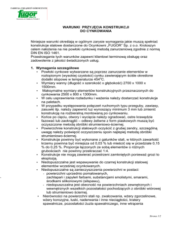 - WARUNKI PRZYJĘCIA KONSTRUKCJI DO CYNKOWANIA Niniejsze warunki określają w ogólnym zarysie wymagania jakie muszą spełniać konstrukcje stalowe dostarczone do Ocynkowni „FUGOR” Sp. z o.o. Krotoszyn celem nałożenia na nie powłoki cynkowej metodą zanurzeniową zgodnie z normą DIN EN ISO 1461. Przestrzeganie tych warunków zapewni klientowi terminową obsługę oraz zadowolenie z jakości świadczonych usług. 1. Wymagania szczegółowe • Powłoki cynkowe wytwarzane są poprzez zanurzanie elementów w roztopionym (wysokiej czystości) cynku zawierającym ściśle określone dodatki stopowe w temperaturze 454oC. • Wymiary wanny (długość x szerokość x głębokość) 2700 x 1000 x 1500mm. • Maksymalne wymiary elementów konstrukcyjnych przeznaczonych do cynkowania 2500 x 800 x 1300mm. • W celu usprawnienia rozładunku i ważenia należy dostarczać konstrukcje na paletach. • W przypadku występowania połączeń ruchomych typu przeguby, zawiasy, zasuwki itp. należy zapewnić luz wynoszący minimum 3 mm lub zmienić konstrukcję na rozbieralną montowaną po cynkowaniu. • Końce po cięciu, otwory i wycięcia należy ogradować, ostre krawędzie fazować lub zaokrąglić – odlewy żeliwne z form piaskowych muszą być oczyszczone metodą obróbki strumieniowo-ściernej. • Powierzchnie konstrukcji stalowych oczyścić z grubej zendry, szczególną uwagę należy poświęcić oczyszczeniu spoin najlepiej metodą obróbki strumieniowo-ściernej. • Konstrukcje powinny być wykonane z gatunków stali, w których zawartość krzemu powinna być mniejsza od 0,03 % lub mieścić się w przedziale 0,15 % do 0,25 %. Proporcje łączonych ze sobą elementów o różnych grubościach nie powinny przekraczać 1:4. • Konstrukcje nie mogą zawierać przestrzeni zamkniętych ponieważ grozi to eksplozją. • Niedopuszczalne jest wspawywanie do czarnej konstrukcji stalowej elementów wcześniej ocynkowanych. • Niedopuszczalne są zanieczyszczenia powierzchni w postaci: - powierzchni uprzednio pomalowanych, zachlapań i zapyleń farbami, substancjami smolistymi, smarami, środkami silikonowymi (silspawu), - niedopuszczalna jest obecność na powierzchniach zewnętrznych i wewnętrznych wszelkich pozostałości pochodzących z obróbki wiórowej lub strumieniowo ściernej. • Nierówności na powierzchni stali np. zwalcowania, wżery zgorzelinowe, wżery korozyjne, łuski, naderwania i inne nieciągłości, kratery spawalnicze, pozostałości żuzla spawalniczego, inne wtrącenia Strona 1/2 • • • • • • • niemetaliczne pozostają po cynkowaniu rozpoznawalne lub dzięki cynkowaniu ogniowemu dopiero stają się widoczne. W przedmiotach nie przystosowanych do cynkowania ogniowego mogą gromadzić się popioły, powstawać nadmierne zlewy cynku oraz miejsca nie pokryte cynkiem, co pogorszy wygląd i jakość powłoki. Jeżeli w konstrukcji występują naprężenia, to cynkowanie ogniowe może doprowadzić do odkształceń (skrzywienia, zwichrowania a nawet pęknięcia). Wynika to z charakteru procesu. Ocynkownia nie ma na to wpływu i nie może ponosić odpowiedzialności. Jeżeli kształt elementu zezwala na nałożenie powłoki, a sprawdzenie jakości powierzchni przed cynkowaniem jest niemożliwe to Ocynkownia nie bierze odpowiedzialności za powłokę w tych miejscach (np. konstrukcje rurowe, skrzynkowe itp.). Ze szczelin lub wnęk wynikających z budowy przedmiotu lub niewłaściwego wykonania np. przy połączeniach spawanych mogą po ocynkowaniu wylewać się resztki topnika pogarszając jakość i wygląd powłoki (tzw. „krwawe wycieki” lub „pocenie”) Ocynkownia nie ma na to wpływu i nie będzie ponosić odpowiedzialności. Ocynkownia nie bierze odpowiedzialności za zalanie cynkiem otworów i gwintów. Usunięcie tych defektów będzie wykonane we własnym zakresie przez Zamawiającego. Ocynkownia nie wykonuje obróbki wykańczającej po ocynkowaniu (np. pod malowanie) jedynie wykonujemy obróbkę zgrubną polegającą na: • oczyszczeniu i zabezpieczeniu miejsc styku z oprzyrządowaniem technologicznym, • stępienie ostrych sopli (bez ich usunięcia) i zacieków cynku. W przypadku gdy powłoka cynkowa ma być dodatkowo zabezpieczona przez nałożenie powłoki malarskiej należy o tym pisemnie powiadomić ocynkownię. 2. Postanowienia końcowe • Ocynkownia nie ponosi odpowiedzialności za wady powłoki cynkowej powstałe z powodu dostarczenia materiału nie spełniającego wymogów właściwego składu chemicznego stali, złego przygotowania powierzchni, odkształceń powstałych w wyniku uwolnienia się naprężeń materiałowych i spawalniczych oraz eksponowania powłoki w środowisku agresywnym dla powłoki cynkowej. • Ocynkownia nie ponosi odpowiedzialności za uszkodzenia lub zniszczenia wyrobów powstałe w czasie transportu, składowania i montażu poza jej terenem • Kiedy jest to wymagane ocynkownia wystawia świadectwo stwierdzające wykonanie powłoki zgodnie z normą PN EN ISO 1461. Krotoszyn, dnia 03.08.2011r. Strona 2/2