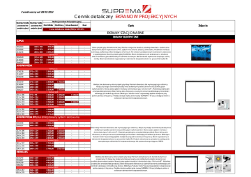 Cennik ważny od: 09/01/2014 Cennik detaliczny EKRANÓW PROJEKCYJNYCH Rodzaj powierzchni projekcyjnej Rozmiar brutto Rozmiar netto Rear powierzchni powierzchni Matt White Matt Grey Glass Beaded projekcyjnej projekcyjnej Cena detaliczna brutto [PLN] z VAT 23% Opis EKRANY STACJONARNE EKRANY ELEKTRYCZNE LUPUS Format 1:1 155x163 175x184 213x216 150 x 150 171 x 171 203 x 203 849,00 972,00 1 095,00 181x140 213x164 244x187 171 x 128 203 x 152 234 x 175 923,00 1 046,00 1 169,00 - - - - - - - - - - - 1 538,00 1 968,00 - - - - Format 4:3 Ekran projekcyjny z linii ekonomicznej. Modna i elegacka kaseta o przekroju kwadratu - zakończona białymi wieczkami wykonanymi z PVC. System mocowania zależny, uniwersalny. Możliwość montażu ściennego, sufitowego. Ekran dostępny w formacie 4:3 w trzech podstawowych rozmiarach, wykonany z wysokiej jakości tkaniny projekcyjnej MattWhite. Ekran dedykowany do zastosowań w edukacji, salach konferencyjno-szkoleniowych lub kinie domowym. Standardowe wykonanie obejmuje czarną ramkę. Ekran standardowo wyposażony w sterowanie bezprzewodowe na poczerwień (pilot IR) ANDROMEDA Format 1:1 177x176 213x207 244x238 171 x 171 203 x 203 234 x 234 1 341,00 1 538,00 1 661,00 181x140 213x164 213 164 250x196 292x227 171 x 128 203 x 152 240 x 180 282 x 211 1 353,00 1 538 538,00 00 1 661,00 2 214,00 181 x 186 213 x 186 231 x 184 244 x 174 292 x 193 171 x 96 203 x 114 221 x 125 234 x 132 282 x 159 1 353,00 1 538,00 1 661,00 1 784,00 2 571,00 213 x 182 243 x 170 290 x 191 203 x 127 234 x 146 280 x 175 1 538,00 1 784,00 2 571,00 Format 4:3 1 415,00 2 325,00 Format 16:9 1 476,00 1 599,00 1 722,00 1 845,00 2 694,00 Elektrycznie ekran projekcyjny klasy P Premium stworzony dla wymagającego odbiorcy. El kt i sterowany t k j k j kl i t dl j dbi Klasyczny design aluminiowej kasety wraz delikatnymi przetłoczeniami oraz perfekcyjnym wykończeniem. Nowoczesny system montażu i demontażu typu "click-on/off" . Materiały projekcyjne amerykańskiej produkcji. Ekran fabrycznie oferowany z czarnymi ramami podkreślającymi kontrast i ułatwiającymi kalibrację obrazu. Silniki typu "tubular motor" zapewniają szybkie rozwijanie przy jednoczesnej cichej pracy. Prestiżu dodaje wytłoczenie nazwy "SUPREMA". W opcji dostępny ekran z radiowym sterowaniem bezprzewodowym. Format 16:10 - ANDROMEDA IM plus zintegrowany system sterowania Format 4:3 250x196 292x227 240 x 180 282 x 211 1 956,00 2 522,00 213 x 186 231 x 184 244 x 174 292 x 193 203 x 114 221 x 125 234 x 132 282 x 159 1 710,00 1 907,00 2 030,00 2 829,00 261 x 137 203 x 127 1 710,00 243 x 170 234 x 146 2 030,00 290 x 191 280 x 175 2 768,00 315x245 372x287 410x316 498x382 305 x 229 362 x 271 400 x 300 488 x 366 3 063,00 4 047,00 4 416,00 6 138,00 376 x 267 410 x 278 366 x 229 400 x 250 3 801,00 4 170,00 - - - - - - - - - - - - - - - - - - - Format 16:9 1 833,00 2 030,00 2 153,00 2 952,00 Format 16:10 2 817,00 Ekran klasy Premium stworzony dla wymagającego odbiorcy. Klasyczny design aluminiowej kasety wraz delikatnymi przetłoczeniami oraz perfekcyjnym wykończeniem. Nowoczesny system montażu i demontażu typu "click-on/off". Materiały projekcyjne amerykańskiej produkcji. Ekran fabrycznie oferowany z czarnymi ramami podkreślającymi kontrast i ułatwiającymi kalibrację obrazu. Silniki typu "tubular motor" zapewniają szybkie rozwijanie przy jednoczesnej cichej pracy. Ekran wyposażony w sterowanie bezprzewodowe na poczerwień (pilot IR). Posiada wbudowane gniazda do podłączenia zewnętrznego odbiornika IR, bezprzewodowego lub przewodowego triggera, RS232. HERKULES Format 4:3 Format 16:10 Elektrycznie sterowany ekran projekcyjny klasy Premium dedykowany do bardzo dużych sal projekcyjnych. Klasyczny design aluminiowej kasety wraz delikatnymi przetłoczeniami oraz perfekcyjnym wykończeniem. Nowoczesny system montażu i demontażu typu "click-on/off" . Materiały projekcyjne amerykańskiej produkcji. Ekran fabrycznie oferowany z czarnymi ramami podkreślajacymi kontrast i ułatwiajacymi kalibrację obrazu. Silniki typu "tubular motor" zapewniają szybkie rozwijanie przy jednoczesnej cichej pracy. Prestiżu dodaje wytłoczenie nazwy SUPREMA. W opcji dostępny ekran z radiowym sterowaniem bezprzewodowym. Zdjęcia Cennik ważny od: 09/01/2014 Cennik detaliczny EKRANÓW PROJEKCYJNYCH Rodzaj powierzchni projekcyjnej Rozmiar brutto Rozmiar netto Rear powierzchni powierzchni Matt White Matt Grey Glass Beaded projekcyjnej projekcyjnej Cena detaliczna brutto [PLN] z VAT 23% Opis Zdjęcia EKRANY ELEKTRYCZNE DRAKO zintegrowany ekran z napinaczami z czarną kasetą Format 4:3 273x227 243 x 182 4 539,00 - - - 324x273 304 x 228 5 769,00 - - - 223x159 254x177 286x194 203 x 114 234 x 132 266 x 149 3 801,00 4 416,00 4 908,00 - - Format 16:9 4 047,00 4 539,00 5 031,00 Ekran DRAKO posiada unikatowy system sterowania obejmujący wbudowany system IR, 12V Trigger , RS232, gniazdo odbiornika IR, oraz 3-pozycyjny przełącznik sterowania ręcznego. Niezawodny system regulacji naprężenia napinaczy nie wymagający jakichkolwiek narzędzi czyni ten ekran idealnym. Zintegrowane elektryczne ekrany z napinaczami DRAKO wykorzystują innowacyjne bezpieczne i łatwe w instalacji uchwyty , ( system montażu niezależnego ) do ściany lub sufitu. DRAKO B zintegrowany ekran z napinaczami z białą kasetą Nowość Format 4:3 273x227 324x273 243 x 182 304 x 228 4 121,00 5 646,00 223x159 254x177 289x199 203 x 114 234 x 132 266 x 149 3 924,00 4 539,00 226x177 257x197 289x216 328x241 203 x 127 234x x 146 266 x 166 304 x 190 3 678 678,00 00 3 924,00 4 662,00 5 154,00 5 769,00 - - - - - - Format 16:9 3 924,00 4 047,00 4 662,00 Format 16:10 - Ekran DRAKO posiada unikatowy system sterowania obejmujący wbudowany system IR, 12V Trigger , RS232, gniazdo odbiornika IR, oraz 3-pozycyjny przełącznik sterowania ręcznego. Niezawodny system regulacji naprężenia napinaczy nie wymagający jakichkolwiek narzędzi czyni ten ekran idealnym. Zintegrowane elektryczne ekrany z napin
