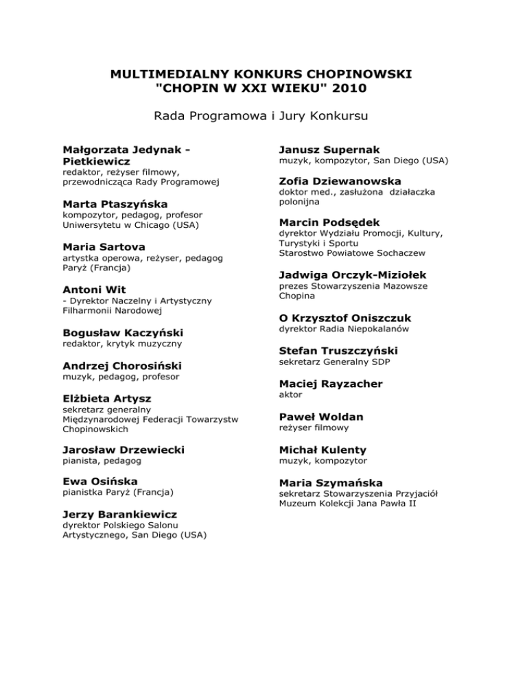 MULTIMEDIALNY KONKURS CHOPINOWSKI "CHOPIN W XXI WIEKU" 2010 Rada Programowa i Jury Konkursu Małgorzata Jedynak Pietkiewicz Janusz Supernak muzyk, kompozytor, San Diego (USA) redaktor, reżyser filmowy, przewodnicząca Rady Programowej Zofia Dziewanowska Marta Ptaszyńska doktor med., zasłużona działaczka polonijna kompozytor, pedagog, profesor Uniwersytetu w Chicago (USA) Marcin Podsędek Maria Sartova artystka operowa, reżyser, pedagog Paryż (Francja) Antoni Wit - Dyrektor Naczelny i Artystyczny Filharmonii Narodowej Bogusław Kaczyński redaktor, krytyk muzyczny Andrzej Chorosiński muzyk, pedagog, profesor dyrektor Wydziału Promocji, Kultury, Turystyki i Sportu Starostwo Powiatowe Sochaczew Jadwiga Orczyk-Miziołek prezes Stowarzyszenia Mazowsze Chopina O Krzysztof Oniszczuk dyrektor Radia Niepokalanów Stefan Truszczyński sekretarz Generalny SDP Maciej Rayzacher Elżbieta Artysz aktor sekretarz generalny Międzynarodowej Federacji Towarzystw Chopinowskich Paweł Woldan Jarosław Drzewiecki Michał Kulenty reżyser filmowy pianista, pedagog muzyk, kompozytor Ewa Osińska Maria Szymańska pianistka Paryż (Francja) Jerzy Barankiewicz dyrektor Polskiego Salonu Artystycznego, San Diego (USA) sekretarz Stowarzyszenia Przyjaciół Muzeum Kolekcji Jana Pawła II