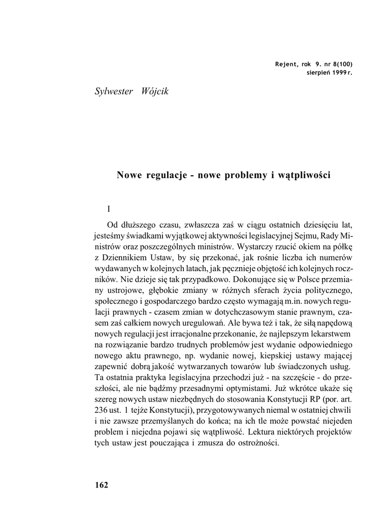 Rejent, rok 9. nr 8(100) sierpień 1999 r. Sylwester Wójcik Nowe regulacje - nowe problemy i wątpliwości I Od dłuższego czasu, zwłaszcza zaś w ciągu ostatnich dziesięciu lat, jesteśmy świadkami wyjątkowej aktywności legislacyjnej Sejmu, Rady Ministrów oraz poszczególnych ministrów. Wystarczy rzucić okiem na półkę z Dziennikiem Ustaw, by się przekonać, jak rośnie liczba ich numerów wydawanych w kolejnych latach, jak pęcznieje objętość ich kolejnych roczników. Nie dzieje się tak przypadkowo. Dokonujące się w Polsce przemiany ustrojowe, głębokie zmiany w różnych sferach życia politycznego, społecznego i gospodarczego bardzo często wymagają m.in. nowych regulacji prawnych - czasem zmian w dotychczasowym stanie prawnym, czasem zaś całkiem nowych uregulowań. Ale bywa też i tak, że siłą napędową nowych regulacji jest irracjonalne przekonanie, że najlepszym lekarstwem na rozwiązanie bardzo trudnych problemów jest wydanie odpowiedniego nowego aktu prawnego, np. wydanie nowej, kiepskiej ustawy mającej zapewnić dobrą jakość wytwarzanych towarów lub świadczonych usług. Ta ostatnia praktyka legislacyjna przechodzi już - na szczęście - do przeszłości, ale nie bądźmy przesadnymi optymistami. Już wkrótce ukaże się szereg nowych ustaw niezbędnych do stosowania Konstytucji RP (por. art. 236 ust. 1 tejże Konstytucji), przygotowywanych niemal w ostatniej chwili i nie zawsze przemyślanych do końca; na ich tle może powstać niejeden problem i niejedna pojawi się wątpliwość. Lektura niektórych projektów tych ustaw jest pouczająca i zmusza do ostrożności. 162 Nowe regulacje - nowe problemy i wątpliwości Jest zrozumiałe, że przedmiot oraz metody regulacji zawarte w nowych regulacjach bywają różne. Znaczące miejsce zajmują tu regulacje właściwe prawu cywilnemu, a więc - w zasadzie - dotyczące stosunków majątkowych między równorzędnymi podmiotami. Jest też oczywiste, że nowe uregulowania prawne, w tym i regulacje cywilnoprawne, mogą spełnić założone cele tylko wtedy, gdy są poprawne. 0 poprawności zaś uregulowań prawnych decyduje szereg czynników, a wśród nich zwłaszcza: dobra znajomość ze strony twórcy regulacji prawnej materii, która ma być regulowana; prawidłowe i jednoznaczne określenie celu regulacji; dobór środków prawnych odpowiednich dla osiągnięcia tego celu; regulacja środka prawnego zgodnie z zasadami obowiązującego porządku prawnego, w tym zgodnie z ustalonymi konstrukcjami i pojęciami danej gałęzi prawa; regulacja środków prawnych w sposób spójny, jednoznacznie i konsekwentnie wyrażaj ący przewodnią myśl stanowionych norm i przepisów. Spełnienie tych wymagań i przygotowań aktu prawnego zawierającego takie regulacje, które mogłyby zadowolić - nie jest łatwe. Z reguły projektu odpowiedniego aktu prawnego nie jest w stanie przygotować ani jedna osoba, ani tylko prawnicy; potrzebne jest współdziałanie szeregu osób, specjalistów z różnych dziedzin, wymiana poglądów i dyskusja nad generaliami regulacji oraz nad konkretnymi propozycjami jako ich formalnym wyrazem. Wszystko to, jak wykazuje doświadczenie, wymaga czasu; pośpiech w tworzeniu aktów prawnych z reguły nie prowadzi do dobrych rezultatów. Że tak jest - o tym łatwo się przekonać. II Dość powszechne jest przekonanie, że wśród uregulowań prawnych, także pochodzących z ostatnich lat, najbardziej udane są regulacje z zakresu prawa cywilnego. Nie jest to przekonanie bezpodstawne. Różne przyczyny sprawiły, że w przeszłości - i tej odległej, i niezbyt dawnej - a także współcześnie regulacje cywilnoprawne zawarte z reguły w ustawach, a nie w aktach niższego rzędu, są na ogół regulacjami przynajmniej formalnie udanymi, najbardziej poprawnymi, a w każdym razie najmniej wadliwymi. Godząc się z tymi ocenami co do samej zasady, trzeba jednak powiedzieć wyraźnie, że i wśród uregulowań z zakresu prawa cywilnego zdarzają się 163 Sylwester Wójcik regulacje niezbyt fortunne, do końca nie przemyślane, a nawet wadliwe. Są to regulacje różnej natury - jedne dotyczą kwestii stosunkowo drobnych, jakby technicznych i drugorzędnych, inne zaś odnoszą się do spraw poważnych, nawet o dużym znaczeniu społecznym lub gospodarczym. Lista takich uregulowań - jednych i drugich - nie byłaby krótka; tu ograniczę się do zwrócenia uwagi tylko na kilka spraw. 1. Zacznijmy od dwóch spraw stosunkowo drobnych i dotąd jakby nie zauważonych. a) Przygotowując - pod koniec lat osiemdziesiątych - zmiany k.c., w ramach tzw. pierwszego etapu reformy prawa cywilnego, Komisja do spraw reformy prawa cywilnego proponowała, by spośród przepisów o zasiedzeniu uchylić tylko art. 177 k.c. (art. 178 k.c. został już wcześniej uchylony); pozostałe przepisy dotyczące zasiedzenia należało - zdaniem Komisji utrzymać w mocy bez jakichkolwiek zmian. To stanowisko spotkało się z aprobatą na forum rządowym i taki też - w tym zakresie - projekt ustawy zmieniającej k.c. został skierowany do Sejmu, gdzie podczas prac nad nim zwrócono uwagę, że wszelka własność, w tym i prywatna własność nieruchomości, powinna korzystać z jednakowej ochrony, z ochrony intensywniejszej, niż to było dotąd. Z tą ideą nie są zgodne - jak twierdzono - krótkie terminy zasiedzenia własności nieruchomości przewidziane w pierwotnym tekście k.c. Uważano, że dziesięcioletni termin zasiedzenia nieruchomości w dobrej wierze (przewidziany w art. 172 § 1 k.c.) jest zbyt krótki i termin ten należy przedłużyć do lat dwudziestu, a dwudziestoletni termin zasiedzenia nieruchomości w złej wierze (przewidziany w art. 172 § 2 k.c.) jest też za krótki i termin ten należy przedłużyć do lat trzydziestu. W związku z tym odpowiedniej zmianie powinien ulec też art. 176 § 1 k.c. Ta propozycja spotkała się z negatywną opinią ekspertów, którzy podnosili, że wydłuża