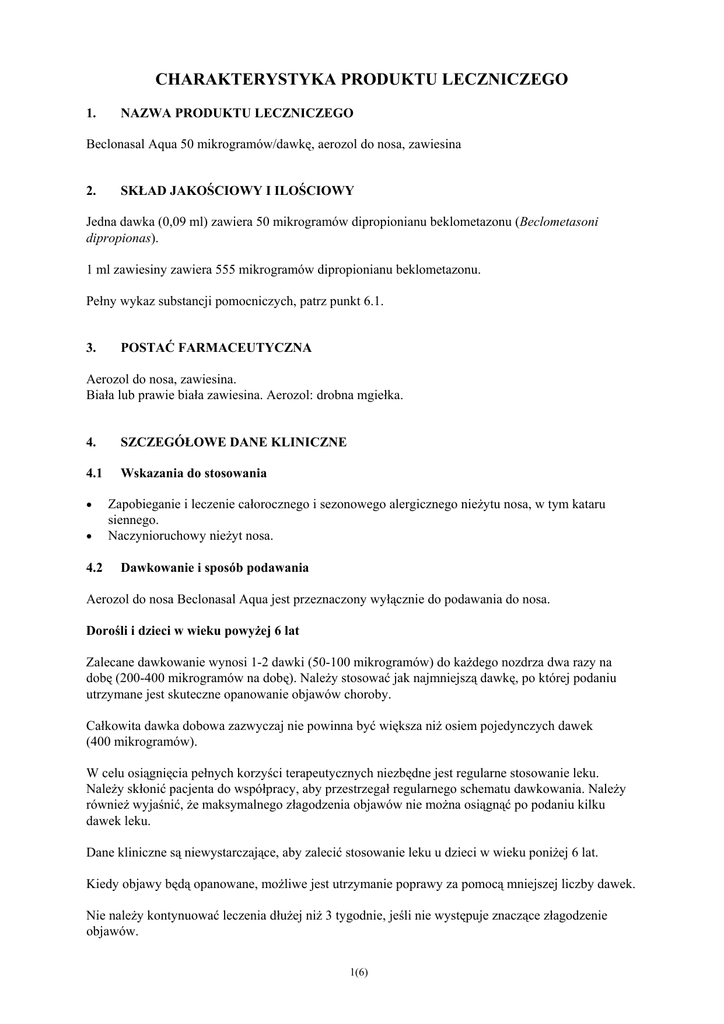 CHARAKTERYSTYKA PRODUKTU LECZNICZEGO 1. NAZWA PRODUKTU LECZNICZEGO Beclonasal Aqua 50 mikrogramów/dawkę, aerozol do nosa, zawiesina 2. SKŁAD JAKOŚCIOWY I ILOŚCIOWY Jedna dawka (0,09 ml) zawiera 50 mikrogramów dipropionianu beklometazonu (Beclometasoni dipropionas). 1 ml zawiesiny zawiera 555 mikrogramów dipropionianu beklometazonu. Pełny wykaz substancji pomocniczych, patrz punkt 6.1. 3. POSTAĆ FARMACEUTYCZNA Aerozol do nosa, zawiesina. Biała lub prawie biała zawiesina. Aerozol: drobna mgiełka. 4. SZCZEGÓŁOWE DANE KLINICZNE 4.1 Wskazania do stosowania • • 4.2 Zapobieganie i leczenie całorocznego i sezonowego alergicznego nieżytu nosa, w tym kataru siennego. Naczynioruchowy nieżyt nosa. Dawkowanie i sposób podawania Aerozol do nosa Beclonasal Aqua jest przeznaczony wyłącznie do podawania do nosa. Dorośli i dzieci w wieku powyżej 6 lat Zalecane dawkowanie wynosi 1-2 dawki (50-100 mikrogramów) do każdego nozdrza dwa razy na dobę (200-400 mikrogramów na dobę). Należy stosować jak najmniejszą dawkę, po której podaniu utrzymane jest skuteczne opanowanie objawów choroby. Całkowita dawka dobowa zazwyczaj nie powinna być większa niż osiem pojedynczych dawek (400 mikrogramów). W celu osiągnięcia pełnych korzyści terapeutycznych niezbędne jest regularne stosowanie leku. Należy skłonić pacjenta do współpracy, aby przestrzegał regularnego schematu dawkowania. Należy również wyjaśnić, że maksymalnego złagodzenia objawów nie można osiągnąć po podaniu kilku dawek leku. Dane kliniczne są niewystarczające, aby zalecić stosowanie leku u dzieci w wieku poniżej 6 lat. Kiedy objawy będą opanowane, możliwe jest utrzymanie poprawy za pomocą mniejszej liczby dawek. Nie należy kontynuować leczenia dłużej niż 3 tygodnie, jeśli nie występuje znaczące złagodzenie objawów. 1(6) 4.3 Przeciwwskazania Nadwrażliwość na dipropionian beklometazonu lub na którąkolwiek substancję pomocniczą. 4.4 Specjalne ostrzeżenia i środki ostrożności dotyczące stosowania Długotrwałe stosowanie kortykosteroidów donosowych, szczególnie w dużych dawkach, może prowadzić do skutków układowych. Przy stosowaniu kortykosteroidów doustnych skutki układowe występują dużo rzadziej i różnią się w zależności od pacjenta i rodzaju preparatu kortykosteroidowego. Do ewentualnych działań układowych należą między innymi: zespół Cushinga, cechy zespołu Cushinga, supresja kory nadnerczy, zahamowanie wzrostu u dzieci i młodzieży, zaćma, jaskra. Rzadziej obserwuje się różne działania psychologiczne i behawioralne, takie jak: nadpobudliwość psychoruchowa, zaburzenia snu, niepokój, depresja lub agresja (szczególnie u dzieci). Zaleca się regularne kontrolowanie wzrostu dzieci długotrwale leczonych kortykosteroidami donosowymi. Jeśli wystąpi spowolnienie wzrostu, należy dokonać ponownej oceny leczenia i zmniejszyć dawkę kortykosteroidu donosowego, jeśli to możliwe, do najmniejszej dawki, po której objawy choroby pozostają opanowane. Dodatkowo, należy rozważyć skierowanie pacjenta do pediatry. Leczenie dawkami większymi niż zalecane może spowodować istotne klinicznie zahamowanie czynności nadnerczy. Jeśli stosowane są dawki większe niż zalecane, należy rozważyć dodatkowe podanie kortykosteroidów działających ogólnoustrojowo w okresie narażenia na stres lub przed planowanymi zabiegami chirurgicznymi. W okresie zmiany leczenia kortykosteroidami działającymi ogólnoustrojowo na leczenie preparatem Beclonasal Aqua należy zachować ostrożność, jeśli istnieje jakikolwiek powód, by przypuszczać, że czynność nadnerczy jest zaburzona. Należy zachować ostrożność podczas stosowania leku u pacjentów z nawracającymi krwawieniami z nosa, urazami nosa lub poddanych zabiegom chirurgicznym w obrębie nosa, z nieleczonymi zakażeniami grzybiczymi, bakteryjnymi lub ogólnoustrojowymi, zakażeniami wirusowymi, astmą lub gruźlicą. Zakażenia nosa i zatok przynosowych powinny być odpowiednio leczone, lecz nie stanowią szczególnego przeciwwskazania do stosowania aerozolu do nosa Beclonasal Aqua. Mimo że aerozol do nosa Beclonasal Aqua w większości przypadków zapewnia kontrolę objawów alergicznego, sezonowego nieżytu nosa, narażenie na bardzo duże stężenia alergenów w okresie letnim może niekiedy spowodować konieczność zastosowania dodatkowego leczenia, zwłaszcza w celu złagodzenia objawów dotyczących oczu. 4.5 Interakcje z innymi lekami i inne rodzaje interakcji Nie odnotowano żadnych interakcji między podawanym miejscowo beklometazonem a innymi produktami leczniczymi. Jednoczesne podawanie innego wziewnego lub podawanego ogólnie steroidu może jednak spowodować nasilone hamowanie czynności nadnerczy. 4.6 Ciąża i laktacja Ciąża: 2(6) Przed zastosowaniem dipropionianu beklometazonu u kobiet w ciąży należy rozważyć, czy korzyści terapeutyczne dla matki przewyższają potencjalne ryzyko dla płodu. Brak wystarczających danych dotyczących bezpieczeństwa stosowania leku u kobiet w ciąży. Podawanie kortykosteroidów ciężarnym zwierzętom może powodować nieprawidłowości w rozwoju płodu, w tym rozszczep podniebienia, wewnątrzmaciczne opóźnienie wzrostu płodu. Dlatego może istnieć bardzo niewielkie ryzyko wystąpienia takich zaburzeń u płodów ludzkich. Jednakże, należy zaznaczyć, że zmiany u płodów zwierzęcych występują po ogólnoustrojowym narażeniu na stosunkowo duże dawki. Beclonasal Aqua zawierający dipropionian beklometazonu jest stosowany bezpośrednio na błonę śluzową nosa, co minimalizuje narażenie ogólnoustrojowe. Laktacja: Nie przeprowadzono badań na zwierzętach dotyczących przenikania dipropionianu beklometazonu do mleka. Należy przyjąć, że dipropionian beklometazonu jest wydzielany do mleka, lecz w dawkach stosowanych bezpośrednio do nosa prawdopodobieństwo wystąpienia znaczącego stężenia w mleku jest małe. P
