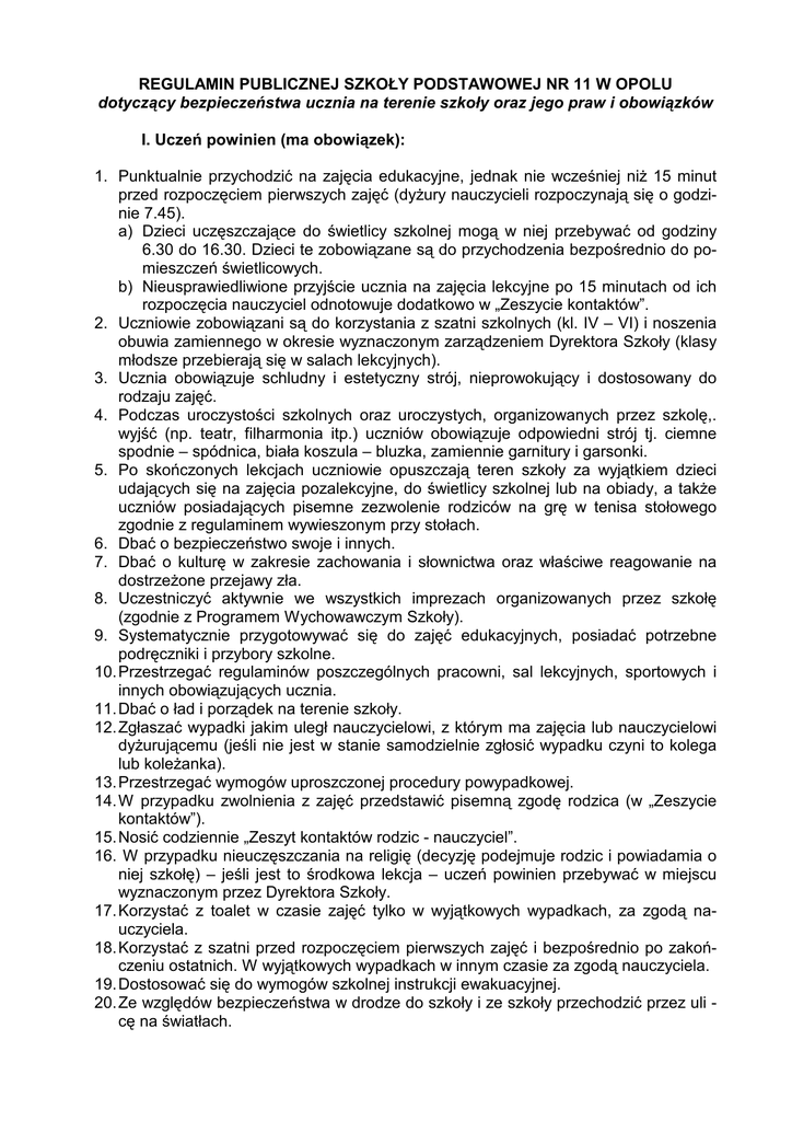 REGULAMIN PUBLICZNEJ SZKOŁY PODSTAWOWEJ NR 11 W OPOLU dotyczący bezpieczeństwa ucznia na terenie szkoły oraz jego praw i obowiązków I. Uczeń powinien (ma obowiązek): 1. Punktualnie przychodzić na zajęcia edukacyjne, jednak nie wcześniej niŜ 15 minut przed rozpoczęciem pierwszych zajęć (dyŜury nauczycieli rozpoczynają się o godzinie 7.45). a) Dzieci uczęszczające do świetlicy szkolnej mogą w niej przebywać od godziny 6.30 do 16.30. Dzieci te zobowiązane są do przychodzenia bezpośrednio do pomieszczeń świetlicowych. b) Nieusprawiedliwione przyjście ucznia na zajęcia lekcyjne po 15 minutach od ich rozpoczęcia nauczyciel odnotowuje dodatkowo w „Zeszycie kontaktów”. 2. Uczniowie zobowiązani są do korzystania z szatni szkolnych (kl. IV – VI) i noszenia obuwia zamiennego w okresie wyznaczonym zarządzeniem Dyrektora Szkoły (klasy młodsze przebierają się w salach lekcyjnych). 3. Ucznia obowiązuje schludny i estetyczny strój, nieprowokujący i dostosowany do rodzaju zajęć. 4. Podczas uroczystości szkolnych oraz uroczystych, organizowanych przez szkolę,. wyjść (np. teatr, filharmonia itp.) uczniów obowiązuje odpowiedni strój tj. ciemne spodnie – spódnica, biała koszula – bluzka, zamiennie garnitury i garsonki. 5. Po skończonych lekcjach uczniowie opuszczają teren szkoły za wyjątkiem dzieci udających się na zajęcia pozalekcyjne, do świetlicy szkolnej lub na obiady, a takŜe uczniów posiadających pisemne zezwolenie rodziców na grę w tenisa stołowego zgodnie z regulaminem wywieszonym przy stołach. 6. Dbać o bezpieczeństwo swoje i innych. 7. Dbać o kulturę w zakresie zachowania i słownictwa oraz właściwe reagowanie na dostrzeŜone przejawy zła. 8. Uczestniczyć aktywnie we wszystkich imprezach organizowanych przez szkołę (zgodnie z Programem Wychowawczym Szkoły). 9. Systematycznie przygotowywać się do zajęć edukacyjnych, posiadać potrzebne podręczniki i przybory szkolne. 10. Przestrzegać regulaminów poszczególnych pracowni, sal lekcyjnych, sportowych i innych obowiązujących ucznia. 11. Dbać o ład i porządek na terenie szkoły. 12. Zgłaszać wypadki jakim uległ nauczycielowi, z którym ma zajęcia lub nauczycielowi dyŜurującemu (jeśli nie jest w stanie samodzielnie zgłosić wypadku czyni to kolega lub koleŜanka). 13. Przestrzegać wymogów uproszczonej procedury powypadkowej. 14. W przypadku zwolnienia z zajęć przedstawić pisemną zgodę rodzica (w „Zeszycie kontaktów”). 15. Nosić codziennie „Zeszyt kontaktów rodzic - nauczyciel”. 16. W przypadku nieuczęszczania na religię (decyzję podejmuje rodzic i powiadamia o niej szkołę) – jeśli jest to środkowa lekcja – uczeń powinien przebywać w miejscu wyznaczonym przez Dyrektora Szkoły. 17. Korzystać z toalet w czasie zajęć tylko w wyjątkowych wypadkach, za zgodą nauczyciela. 18. Korzystać z szatni przed rozpoczęciem pierwszych zajęć i bezpośrednio po zakończeniu ostatnich. W wyjątkowych wypadkach w innym czasie za zgodą nauczyciela. 19. Dostosować się do wymogów szkolnej instrukcji ewakuacyjnej. 20. Ze względów bezpieczeństwa w drodze do szkoły i ze szkoły przechodzić przez uli cę na światłach. 21. Zapoznać się z podstawowymi aktami prawa szkolnego tj. Statutem Szkoły, Programem Wychowawczym Szkoły, Wewnątrzszkolnym Systemem Oceniania, instrukcją ewakuacji z budynku szkoły, uproszczoną procedurą powypadkową. Akty te dostępne są w bibliotece szkolnej i sekretariacie szkoły. Pomogą w ich udostępnieniu uczniom i ich rodzicom wychowawcy klas. 22. Przestrzegać zasad współŜycia w odniesieniu do kolegów, nauczycieli i innych pracowników szkoły. 23. Uczestniczyć co najmniej w jednej formie zajęć pozalekcyjnych lub wyrównawczych. 24. Podporządkowywać się zaleceniom i zarządzeniom Dyrektora Szkoły i nauczycieli, Rady Pedagogicznej oraz ustaleniom Samorządu Uczniowskiego. II. Bezwzględnie zabrania się uczniom: 1. Przebywania w czasie zajęć edukacyjnych w okryciach wierzchnich (kurtkach, płaszczach) w okresie, w którym są czynne szatnie. 2. Noszenia w szkole obuwia typu „martens”, „glany”, farbowania włosów, malowania się oraz noszenia znaków i symboli sugerujących przynaleŜność do prawnie zabronionych grup, kolczyków na róŜnych częściach ciała z wyjątkiem uszu. 3. Przebywania podczas trwania zajęć szkolnych na terenia szkoły bez opieki nauczyciela (korytarze, radiowęzeł, szatnie ...) 4. Wychodzenia poza teren szkoły bez opieki nauczyciela w czasie lekcji i na przerwach. 5. Przynoszenia do szkoły przedmiotów stwarzających zagroŜenie dla zdrowia i Ŝycia dziecka (scyzoryki, noŜe, lasery, środki pirotechniczne, pistolety kulkowe, spraye ...). 6. Przynoszenia do szkoły większych kwot pienięŜnych. 7. Korzystania w czasie zajęć z telefonów komórkowych (muszą być wyłączone). • Uwaga: podczas wycieczek szkolnych kierownik wycieczki ustala zasady korzysta nia z telefonów komórkowych. 8. Palenia papierosów, picia alkoholu i stosowania uŜywek zagraŜających zdrowiu i Ŝyciu. 9. Noszenia na zajęciach wychowania fizycznego i innych sportowych kolczyków i ozdób zagraŜających bezpiecznemu wykonywaniu ćwiczeń. 10. Zapraszania do szkoły i spotykania się na jej terenie z osobami obcymi (spoza szkoły) bez zgody nauczyciela. 11. Przebywania uczniom klas starszych (IV - VI), w czasie przerw i lekcji w pomieszczeniach i korytarzach przeznaczonych dla klas I – III (i odwrotnie). III. Rodzice: 1. Są zobowiązani, w wypadku nieobecności ucznia trwającej powyŜej 3 dni, powiadomić szkołę o przyczynach nieobecności. 2. Są zobowiązani do usprawiedliwiania nieobecności dziecka poprzez „Zeszyt kontaktów” bezpośrednio po powrocie dziecka do szkoły (do 3 dni), w wypadku nieobecności wychowawcy klasy usprawiedliwienie przekazujemy do sekretariatu szkoły. 3. Na nieobecność dziecka trwającą powyŜej 7 dni, a wynikającą 
