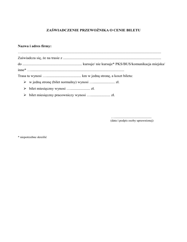 ZAŚWIADCZENIE PRZEWOŹNIKA O CENIE BILETU Nazwa i adres firmy: ….................................................................................................................................................... Zaświadcza się, że na trasie z ........................................................................................................ do ............................................................... kursuje/ nie kursuje* PKS/BUS/komunikacja miejska/ inne* …................................................................................................... Trasa ta wynosi …..................................... km w jedną stronę, a koszt biletu: ➢ w jedną stronę (bilet normalny) wynosi …....................... zł. ➢ bilet miesięczny wynosi …..................... zł. ➢ bilet miesięczny pracowniczy wynosi …..................... zł. …....................................... (data i podpis osoby uprawnionej) * niepotrzebne skreślić