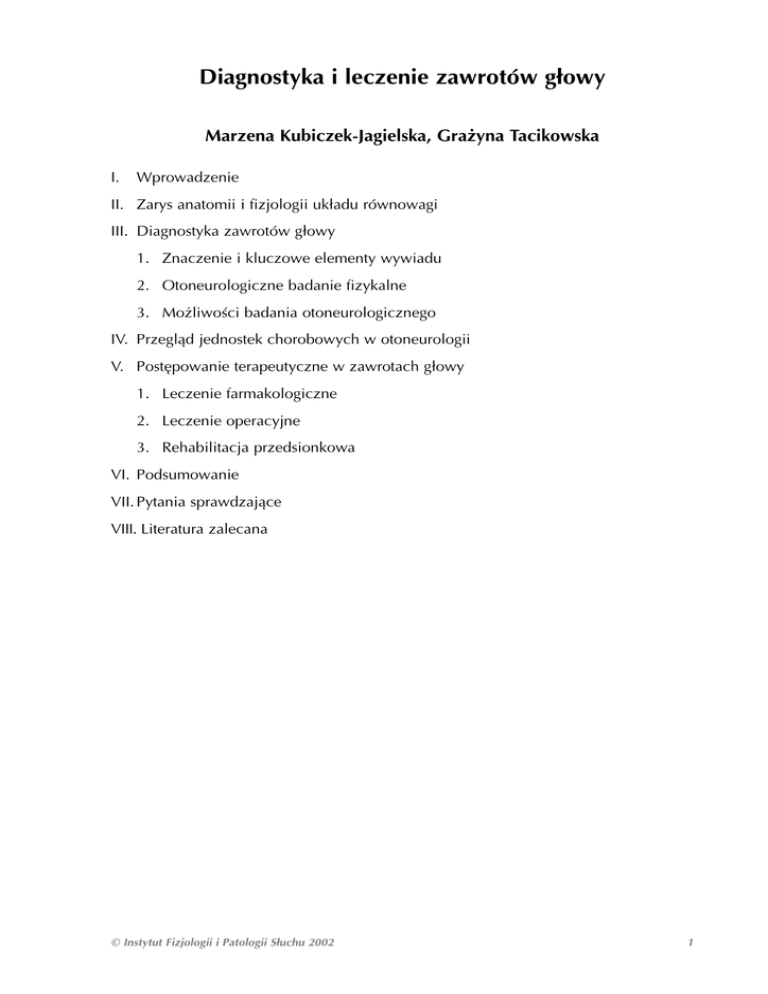 Diagnostyka i leczenie zawrotów głowy Marzena Kubiczek−Jagielska, Grażyna Tacikowska I. Wprowadzenie II. Zarys anatomii i fizjologii układu równowagi III. Diagnostyka zawrotów głowy 1. Znaczenie i kluczowe elementy wywiadu 2. Otoneurologiczne badanie fizykalne 3. Możliwości badania otoneurologicznego IV. Przegląd jednostek chorobowych w otoneurologii V. Postępowanie terapeutyczne w zawrotach głowy 1. Leczenie farmakologiczne 2. Leczenie operacyjne 3. Rehabilitacja przedsionkowa VI. Podsumowanie VII. Pytania sprawdzające VIII. Literatura zalecana © Instytut Fizjologii i Patologii Słuchu 2002 1 I. Wprowadzenie Zawroty głowy i zaburzenia równowagi są, podobnie jak bóle głowy, częstym powodem zgłaszania się pacjenta do lekarza. Są objawem wieloznacznym, tak co do rodzaju schorzenia, które je wyzwala, jak i jego stopnia ciężkości – od lekkich stanów do zagrażających życiu. Szacuje się, że zawroty są proble− mem około 25% populacji naszego kraju. Często są tak dotkliwe, że wpływają niekorzystnie na życie osobiste i zawodowe. Definicja zawrotów Zawrót jest to iluzja ruchu, najczęściej wirowego (otoczenia lub osoby odczuwającej zawrót), czyli rze− czywiste vertigo, natomiast uczucie falowania, zapadania, kołysania, ściągania w bok, oszołomienia – określane jest jako dizziness. Mogą towarzyszyć temu inne nieprzyjemne i niepokojące dolegliwości np.: nudności, wymioty, zaburzenia słuchu, bóle głowy, zaburzenia równowagi oraz zaburzenia orienta− cji przestrzennej. Orientację w przestrzeni, to jest odczucie położenia swojego ciała i/lub jego części w stosunku do kie− runku przyciągania ziemskiego i odczucie przyspieszenia w ruchu prostoliniowym i obrotowym, oraz za− chowanie równowagi fizycznej w spoczynku (równowaga statyczna) i w ruchu (równowaga dynamicz− na) zapewnia nam układ równowagi. W odróżnieniu od innych zmysłów np. wzroku, słuchu, węchu, które mają jeden wyspecjalizowany narząd, na układ równowagi składa się współdziałanie kilku narządów i zmysłów: – narządu równowagi, określanego jako narząd przedsionkowy lub błędnik, którego wyspecjalizowane receptory znajdują się w uchu wewnętrznym (labiryncie), w jego części środkowej, czyli w przedsion− ku (narząd otolitowy woreczka i łagiewki) oraz w części tylnej – w bańkach kanałów półkolistych (na− rząd bańkowy). W przedniej części labiryntu znajduje się narząd słuchu; – narządu wzroku; – narządu zmysłu czucia głębokiego, którego receptory (proprioceptory) wrażliwe na ucisk, rozciąganie, napięcie znajdują się w mięśniach, ścięgnach, powięziach, torebkach stawowych, naczyniach i narzą− dach wewnętrznych. Wymienione trzy narządy: narząd przedsionkowy, narząd wzroku i proprioceptory tworzą układ równowagi. Informacje z różnych receptorów przekazywane są do ośrodków w centralnym układzie nerwowym, w których – po ich analizie i integracji – generowane są bodźce dla efektorów, głównie mięśni gałkoru− chowych i mięśni szkieletowych (posturalnych), wpływających na ich czynność tak, by umożliwić stabili− zację kierunku spojrzenia (fiksacja wzroku na danym obiekcie) i zachowanie równowagi w różnych poło− żeniach i w ruchach głowy i /lub ciała. Połączenie ośrodków narządu równowagi z ośrodkami wegetatyw− nymi powoduje, iż zaburzenia narządu równowagi mogą wywoływać zaburzenia wegetatywne (nudności, wymioty, bladość powłok, zimne poty, tachykardię). Analiza i integracja bodźców napływających z recep− torów obwodowych narządu równowagi, narządu wzroku i narządu czucia głębokiego w ośrodkach ko− rowych jest podstawą świadomego postrzegania naszego położenia i ruchu w przestrzeni. Pobudzenie lub zmiany chorobowe układu równowagi decydują o wystąpieniu dwóch objawów obiek− tywnych tj. oczopląsu i zaburzeń równowagi. Zawroty głowy są jedynie objawem subiektywnym, co nie− wątpliwie utrudnia proces diagnostyczny. W zależności od lokalizacji uszkodzenia w obrazie klinicznym mogą dominować różne objawy, o róż− nym nasileniu. Określenie cech występujących objawów charakterystycznych dla uszkodzenia części ob− wodowej czy ośrodkowej układu równowagi pozwala ukierunkować dalszą diagnostykę różnicową. Rozpoznanie przyczyn zaburzeń układu równowagi z powodu ich różnorodności, tak co do natury, jak i lokalizacji, jest trudne i niekiedy niemożliwe, nawet po wielu badaniach specjalistycznych. © Instytut Fizjologii i Patologii Słuchu 2002 2 Bardzo ważne w procesie diagnostycznym jest ustalenie przyczyn zawrotów głowy ze względu na ich or− ganiczny bądź czynnościowy charakter, układowe pochodzenie czy też stopień zagrożenia dla zdrowia i życia pacjenta. Ma to szczególne znaczenie we wstępnej fazie postępowania rozpoznawczego. II. Zarys anatomii i fizjologii układu równowagi Elementy anatomii Obie części ucha wewnętrznego mają jednorodne środowisko – płyny ucha wewnętrznego (śródchłonkę i przychłonkę). W zmianach chorobowych środowisko to może ulec zmianie; zawierać czynniki uszkadza− jące, które przeniknęły do tych struktur drogą krwionośną lub przez ciągłość, co może stanowić przyczynę uszkodzenia ślimaka (części słuchowej) ucha wewnętrznego i\lub przedsionka (części błędnikowej). Struktury przedsionka, tak jak ślimaka, wyścielone są nabłonkiem zmysłowym rzęsatym zlokalizowanym w pięciu polach zmysłowych (trzech narządach bańkowych kanałów półkolistych oraz plamce łagiewki i plamce woreczka). Powierzchnię komórek nabłonka pokrywają rzęski krótsze – STEREOCYLIE i długie – KINOCILIUM, któ− re odgrywają decydującą rolę w procesie polaryzacji bioelektrycznej komórki. Ruch krótszych rzęsek w kierunku długiej rzęski powoduje zwiększenie przepuszczalności jonów przez błonę