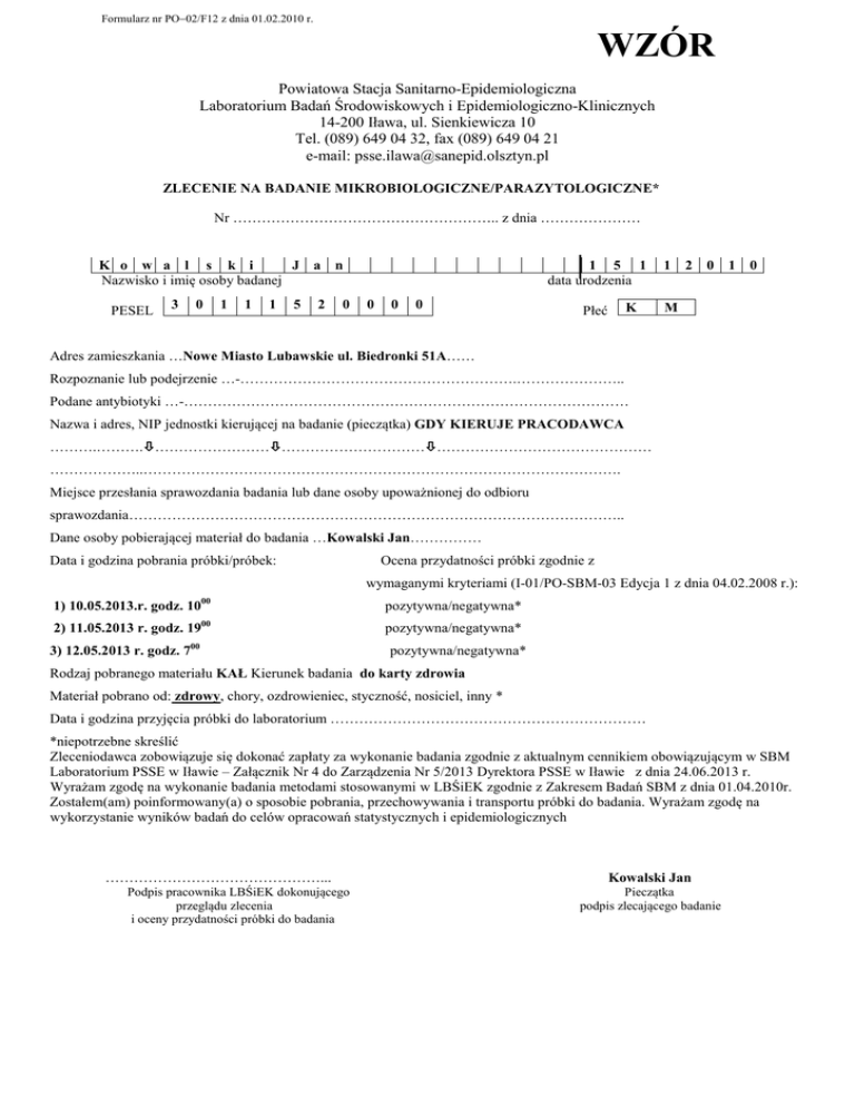 Formularz nr PO−02/F12 z dnia 01.02.2010 r. WZÓR Powiatowa Stacja Sanitarno-Epidemiologiczna Laboratorium Badań Środowiskowych i Epidemiologiczno-Klinicznych 14-200 Iława, ul. Sienkiewicza 10 Tel. (089) 649 04 32, fax (089) 649 04 21 e-mail: [email protected] ZLECENIE NA BADANIE MIKROBIOLOGICZNE/PARAZYTOLOGICZNE* Nr ……………………………………………….. z dnia ………………… K o w a l s k i J a Nazwisko i imię osoby badanej PESEL 3 0 1 1 1 5 2 n 0 1 5 1 data urodzenia 0 0 0 K Płeć 1 2 0 1 0 M Adres zamieszkania …Nowe Miasto Lubawskie ul. Biedronki 51A…… Rozpoznanie lub podejrzenie …-………………………………………………….………………….. Podane antybiotyki …-………………………………………………………………………………… Nazwa i adres, NIP jednostki kierującej na badanie (pieczątka) GDY KIERUJE PRACODAWCA ……….………. …………………… ………………………… ……………………………………… ………………..………………………………………………………………………………………. Miejsce przesłania sprawozdania badania lub dane osoby upoważnionej do odbioru sprawozdania………………………………………………………………………………………….. Dane osoby pobierającej materiał do badania …Kowalski Jan…………… Data i godzina pobrania próbki/próbek: Ocena przydatności próbki zgodnie z wymaganymi kryteriami (I-01/PO-SBM-03 Edycja 1 z dnia 04.02.2008 r.): 1) 10.05.2013.r. godz. 10 00 pozytywna/negatywna* 2) 11.05.2013 r. godz. 19 00 pozytywna/negatywna* 3) 12.05.2013 r. godz. 7 00 pozytywna/negatywna* Rodzaj pobranego materiału KAŁ Kierunek badania do karty zdrowia Materiał pobrano od: zdrowy, chory, ozdrowieniec, styczność, nosiciel, inny * Data i godzina przyjęcia próbki do laboratorium ………………………………………………………… *niepotrzebne skreślić Zleceniodawca zobowiązuje się dokonać zapłaty za wykonanie badania zgodnie z aktualnym cennikiem obowiązującym w SBM Laboratorium PSSE w Iławie – Załącznik Nr 4 do Zarządzenia Nr 5/2013 Dyrektora PSSE w Iławie z dnia 24.06.2013 r. Wyrażam zgodę na wykonanie badania metodami stosowanymi w LBŚiEK zgodnie z Zakresem Badań SBM z dnia 01.04.2010r. Zostałem(am) poinformowany(a) o sposobie pobrania, przechowywania i transportu próbki do badania. Wyrażam zgodę na wykorzystanie wyników badań do celów opracowań statystycznych i epidemiologicznych ………………………………………... Podpis pracownika LBŚiEK dokonującego przeglądu zlecenia i oceny przydatności próbki do badania Kowalski Jan Pieczątka podpis zlecającego badanie
