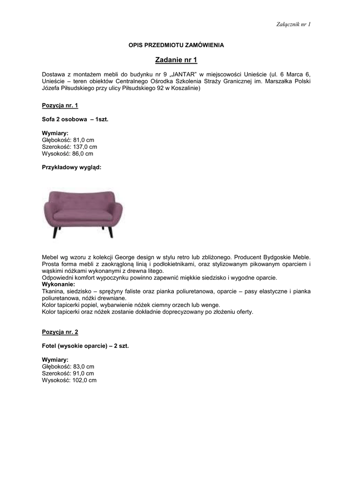Załącznik nr 1 OPIS PRZEDMIOTU ZAMÓWIENIA Zadanie nr 1 Dostawa z montażem mebli do budynku nr 9 „JANTAR” w miejscowości Unieście (ul. 6 Marca 6, Unieście – teren obiektów Centralnego Ośrodka Szkolenia Straży Granicznej im. Marszałka Polski Józefa Piłsudskiego przy ulicy Piłsudskiego 92 w Koszalinie) Pozycja nr. 1 Sofa 2 osobowa – 1szt. Wymiary: Głębokość: 81,0 cm Szerokość: 137,0 cm Wysokość: 86,0 cm Przykładowy wygląd: Mebel wg wzoru z kolekcji George design w stylu retro lub zbliżonego. Producent Bydgoskie Meble. Prosta forma mebli z zaokrągloną linią i podłokietnikami, oraz stylizowanym pikowanym oparciem i wąskimi nóżkami wykonanymi z drewna litego. Odpowiedni komfort wypoczynku powinno zapewnić miękkie siedzisko i wygodne oparcie. Wykonanie: Tkanina, siedzisko – sprężyny faliste oraz pianka poliuretanowa, oparcie – pasy elastyczne i pianka poliuretanowa, nóżki drewniane. Kolor tapicerki popiel, wybarwienie nóżek ciemny orzech lub wenge. Kolor tapicerki oraz nóżek zostanie dokładnie doprecyzowany po złożeniu oferty. Pozycja nr. 2 Fotel (wysokie oparcie) – 2 szt. Wymiary: Głębokość: 83,0 cm Szerokość: 91,0 cm Wysokość: 102,0 cm Załącznik nr 1 Przykładowy wygląd: Mebel wg wzoru z kolekcji George design w stylu retro lub zbliżonego. Producent Bydgoskie Meble. Prosta forma mebli z zaokrągloną linią i podłokietnikami, oraz stylizowanym pikowanym oparciem i wąskimi nóżkami wykonanymi z drewna litego. Odpowiedni komfort wypoczynku powinno zapewnić miękkie siedzisko i wygodne oparcie. Wykonanie: Tkanina, siedzisko – sprężyny faliste oraz pianka poliuretanowa, oparcie – pasy elastyczne i pianka poliuretanowa, nóżki drewniane. Kolor tapicerki popiel, wybarwienie nóżek ciemny orzech lub wenge. Kolor tapicerki oraz nóżek zostanie dokładnie doprecyzowany po złożeniu oferty. Pozycja nr. 3 Hocker (pufa) – 2 szt. Wymiary: Głębokość: 42,0 cm Szerokość: 60,0 cm Wysokość: 48,0 cm Przykładowy wygląd: Mebel wg wzoru z kolekcji George design w stylu retro lub zbliżonego. Producent Bydgoskie Meble. Prosta forma mebli z zaokrągloną linią i podłokietnikami, oraz stylizowanym pikowanym oparciem i wąskimi nóżkami wykonanymi z drewna litego. Odpowiedni komfort wypoczynku powinno zapewnić miękkie siedzisko i wygodne oparcie. Wykonanie: Tkanina, siedzisko – sprężyny faliste oraz pianka poliuretanowa, oparcie – pasy elastyczne i pianka poliuretanowa, nóżki drewniane. Kolor tapicerki popiel, wybarwienie nóżek ciemny orzech lub wenge. Kolor tapicerki oraz nóżek zostanie dokładnie doprecyzowany po złożeniu oferty. Uwaga: poz. 1,2 i 3 musi stanowić komplet. Załącznik nr 1 Pozycja nr. 4 Kredens wg wzoru SUNSET 2D4S Producent Bydgoskie Meble – szt.1 - wymiar kredensu 1538x400x820,(długość może być większa o 150 mm) - kredens podzielony na trzy równe części, prawa i lewa strona, szafki otwierane na zewnątrz, wewnątrz jedna półka w połowie wysokości. W środkowej części kredensu 4 szuflady o jednakowych wysokościach, - kolor jesion czekoladowy lub orzech seleve R 3105 (Pfleiderer), - wykonana z płyty melaminowanej 18mm i 28mm o gęstości 650-690 kg/m³, klasa higieniczności E1. Właściwości płyty: dużą odporność na ścieranie i zarysowanie odporność na działanie czynników chemicznych odporność na działanie temperatury - oklejane obrzeżem PCV odpornym na uderzenia mechaniczne. Boki oklejane 4x PCV, - półki mocowane za pomocą złączy uniemożliwiające ich przypadkowe wysunięcie, - uchwyty ze stopu ZnAl (cynkowo-aluminiowy) wykończony galwanicznie na srebrny mat - front (drzwi) - płyta grubości 18mm. Krawędzie oklejone obrzeżem PVC 2mm, - fronty lewy i prawy mocowany do korpusu za pomocą zawiasów o możliwym kącie otwarcia 110°, - zawiasy wyposażone w system spowalniający, - prowadnice w szufladach kulkowe o pełnym wysuwie - kredens powinien posiadać stabilne stopki umożliwiające jego prawidłowe poziomowanie, - wieniec dolny w kolorze wieńca górnego Przykładowy wygląd: Załącznik nr 1 Pozycja nr. 5 Bufet wg wzoru SUNSET 3D1S Producent Bydgoskie Meble – szt. 1 - wymiar bufetu 1270x400x993,( długość wysokość +- 70mm) - kredens podzielony na dwie części (w pionie), prawa i lewa strona, - kolor jesion czekoladowy lub orzech seleve R 3105 (Pfleiderer), - wykonany z płyty melaminowanej 18mm i 28mm o gęstości 650-690 kg/m³, klasa higieniczności E1. Właściwości płyty: dużą odporność na ścieranie i zarysowanie odporność na działanie czynników chemicznych odporność na działanie temperatury - oklejane obrzeżem PCV odpornym na uderzenia mechaniczne. Boki oklejane 4x PCV, - uchwyty ze stopu ZnAl (cynkowo-aluminiowy) wykończony galwanicznie na srebrny mat, - front (drzwi) - płyta grubości 18mm. Krawędzie oklejone obrzeżem PVC, - fronty lewy mocowany do korpusu szafy za pomocą zawiasów o możliwym kącie otwarcia 110°, - zawiasy wyposażone w system spowalniający, - prowadnice w szufladzie kulkowe o pełnym wysuwie, - wieniec dolny w kolorze wieńca górnego - półki mocowane za pomocą złącz półek „cztery półki poziome ze szkła hartowanego, przeźroczyste, - front drzwi ze szklaną wstawką na całej wysokości zgodnie z rysunkiem poglądowym, szkło przeźroczyste, - bok bufetu (lewa strona) ze szklaną wstawką na całej wysokości zgodnie z rysunkiem poglądowym, szkło przeźroczyste, - prawa strona barku; szafki górna i dolna otwierane do dołu przy pomocy podnośników meblowych z hamulcem, fronty powinny otwierać się i zamykać pozornie nieważkim ruchem, - pomiędzy dwoma szafkami powinna znajdować się szuflada zgodnie z rysunkiem poglądowym Przykładowy wygląd: Uwaga: poz. 4 i 5 musi stanowić komplet. Załącznik nr 1 Pozycja nr. 6 Szafka na buty siedzisko – szt. 1 - wymiar szafki wys.446 x szer.655 x gł. 280, (szerokość, wysokość +-50mm, głębokość – 30mm) - kolo