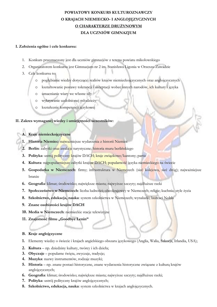 POWIATOWY KONKURS KULTUROZNAWCZY O KRAJACH NIEMIECKO- I ANGLOJĘZYCZNYCH O CHARAKTERZE DRUŻYNOWYM DLA UCZNIÓW GIMNAZJUM I. Założenia ogólne i cele konkursu: 1. Konkurs przeznaczony jest dla uczniów gimnazjów z terenu powiatu mikołowskiego 2. Organizatorem konkursu jest Gimnazjum nr 2 im. Stanisława Ligonia w Orzeszu-Zawadzie 3. Cele konkursu to: o pogłębianie wiedzy dotyczącej realiów krajów niemieckojęzycznych oraz anglojęzycznych o kształtowanie postawy tolerancji i akceptacji wobec innych narodów, ich kultury i języka o umacnianie wiary we własne siły o wykrywanie uzdolnionej młodzieży o kształcenie kompetencji językowej II. Zakres wymaganej wiedzy i umiejętności uczestników: A. Kraje niemieckojęzyczne 1. Historia Niemiec: najważniejsze wydarzenia z historii Niemiec 2. Berlin: zabytki oraz atrakcje turystyczne; historia muru berlińskiego 3. Polityka: ustrój polityczny krajów DACH; kraje związkowe/kantony; partie 4. Kultura: najpopularniejsze zabytki krajów DACH; popularność języka niemieckiego na świecie 5. Gospodarka w Niemczech: firmy; infrastruktura w Niemczech (sieć kolejowa, sieć dróg); najważniejsze branże 6. Geografia: klimat; środowisko; największe miasta; najwyższe szczyty; najdłuższe rzeki 7. Społeczeństwo w Niemczech: liczba ludności; obcokrajowcy w Niemczech; religie; kuchnia; style życia 8. Szkolnictwo, edukacja, nauka: system szkolnictwa w Niemczech; wynalazki; laureaci Nobla 9. Znane osobistości krajów DACH 10. Media w Niemczech: niemieckie stacje telewizyjne 11. Znajomość filmu „Goodbye Lenin” B. Kraje anglojęzyczne 1. Elementy wiedzy o świecie i krajach angielskiego obszaru językowego (Anglia, Walia, Szkocja, Irlandia, USA); 2. 3. 4. 5. Kultura – np. dziedziny kultury, twórcy i ich dzieła; Obyczaje – popularne święta, zwyczaje, tradycje; Muzyka: nazwy instrumentów, rodzaje muzyki; Historia – np. znane postaci historyczne, znane wydarzenia historyczne związane z kulturą krajów anglojęzycznych; 6. Geografia: klimat; środowisko; największe miasta; najwyższe szczyty; najdłuższe rzeki; 7. Polityka: ustrój polityczny krajów anglojęzycznych; 8. Szkolnictwo, edukacja, nauka: system szkolnictwa w krajach anglojęzycznych. 1 9. Rodzina królewska: Królowa Elżbieta II, książę Karol, William, Harry oraz księżna Diana. III. Literatura podstawowa i pomocnicza: o Podręcznik do nauki języka niemieckiego w gimnazjum/ elementy wiedzy o krajach DACH o Societäts-Verlag „Niemcy w świetle faktów i liczb” o Stanisław Bęza „Eine kleine Landeskunde der deutschsprachigen Länder” o Podręczniki do nauki języka angielskiego w gimnazjum/ elementy wiedzy o krajach anglojęzycznych. o o Roman Ociepa “United Kingdom at a glance” “Dictionary of English language and culture” wyd. Longman IV. Regulamin konkursu: 1. W konkursie mogą wziąć udział uczniowie gimnazjów z terenu powiatu mikołowskiego. Każdą szkołę reprezentują dwuosobowe drużyny (maksymalnie 2 z danej szkoły). 2. Uczestnictwo w konkursie jest dobrowolne. Kandydatów należy zgłaszać do dn. 26. lutego 2014. 3. Konkurs rozpoczyna się dn. 6. marca 2014 (czwartek) o godz. 12.00 i potrwa około 2 godzin. 4. Konkurs składa się z czterech części: o Część pierwsza: krótki test sprawdzający wiedzę o krajach niemieckojęzycznych oraz anglojęzycznych o Część druga: konkurencje drużynowe sprawdzające podstawowe wiadomości realioznawcze o krajach niemieckojęzycznych oraz anglojęzycznych o Część trzecia: konkurencje drużynowe sprawdzające znajomość filmu „Goodbye Lenin” 5. Zadania w teście mogą mieć następującą formę: multiple-choice, przyporządkowania, uzupełnianie luk w zdaniach. 6. W skład komisji wchodzą nauczyciele j.ang. oraz j.niem., zaś wyniki zostaną ogłoszone tego samego dnia. 7. Laureaci konkursu otrzymują dyplomy oraz nagrody rzeczowe. 8. W przypadku zbyt dużej liczby chętnych, organizator zastrzega sobie prawo do zredukowania ilości drużyn reprezentujących daną szkołę. O ewentualnej zmianie szkoły zostaną poinformowane najpóźniej 27. lutego 2013 r. 9. Dodatkowe informacje można uzyskać pod numerem telefonu Gimnazjum: 032 2215271 lub u organizatorówp. Moniki Musioł-Skrzypiec (tel. 507-942-638, [email protected] ) oraz p. Anny Darłowskiej (tel. 517-277-322, [email protected]). Zapraszamy do wzięcia udziału w naszym konkursie !!! 2