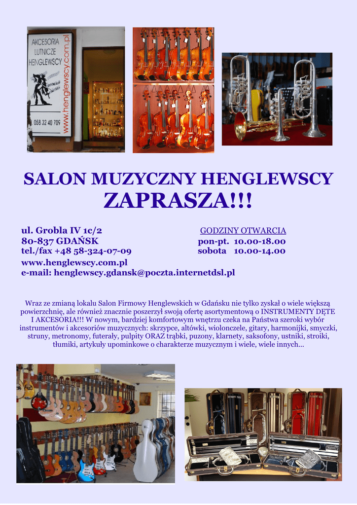 SALON MUZYCZNY HENGLEWSCY ZAPRASZA!!! ul. Grobla IV 1c/2 80-837 GDAŃSK GODZINY OTWARCIA pon-pt. 10.00-18.00 sobota 10.00-14.00 tel./fax +48 58-324-07-09 www.henglewscy.com.pl e-mail: [email protected] Wraz ze zmianą lokalu Salon Firmowy Henglewskich w Gdańsku nie tylko zyskał o wiele większą powierzchnię, ale również znacznie poszerzył swoją ofertę asortymentową o INSTRUMENTY DĘTE I AKCESORIA!!! W nowym, bardziej komfortowym wnętrzu czeka na Państwa szeroki wybór instrumentów i akcesoriów muzycznych: skrzypce, altówki, wiolonczele, gitary, harmonijki, smyczki, struny, metronomy, futerały, pulpity ORAZ trąbki, puzony, klarnety, saksofony, ustniki, stroiki, tłumiki, artykuły upominkowe o charakterze muzycznym i wiele, wiele innych... SALON FIRMOWY HENGLEWSCY ..................................................................................................................................................... NOWOŚCI!!! LABOGA – lampowe wzmacniacze gitarowe Wieloletnia obecność firmy LABOGA w branży pozwala na zrozumienie potrzeb muzyków i dokonanie takich zmian w konstrukcji, żeby dostosować się do gustu odbiorcy. Co za tym idzie, to świetnej jakości wzmacniacze lampowe, o ogromnym spektrum brzmienia; od "californiacream-soft", aż po "britisch-medium-hard"; dzięki temu każdy muzyk szybko i łatwo odnajduje osobiste brzmienie dla swojej gitary. Wyselekcjonowane materiały, ręcznie dokonywana produkcja i 72-godzinny test każdego wzmacniacza - to standardy w produkcji LABOGA. Gitara elektryczna VGS RADIOACTIVE TD-SPECIAL Mostek "EVER TUNE" w sposób ciągły dostraja poszczególne struny, dzięki czemu gitara bez względu na warunki otoczenia pozostaje zawsze idealnie nastrojona. Samoistne dostrajanie odbywa się przy pomocy specjalnie skonstruowanego, w pełni mechanicznego systemu. Progi "TRUE TEMPERAMENT" – specjalnie zaprojektowane asymetryczne progi zapewniają idealny strój gitary na całej długości gryfu. Progi poprzez swój kształt korygują strój na podstrunnicy w 144 miejscach.