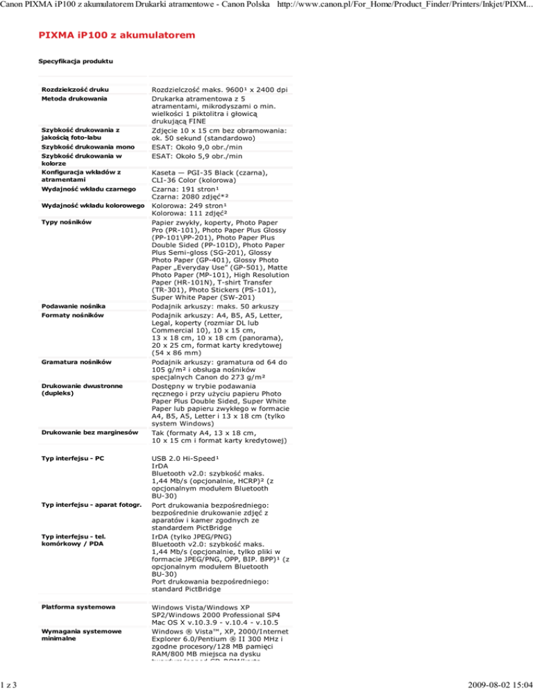 Canon PIXMA iP100 z akumulatorem Drukarki atramentowe - Canon Polska http://www.canon.pl/For_Home/Product_Finder/Printers/Inkjet/PIXM... 1z3 PIXMA iP100 z akumulatorem Specyfikacja produktu Rozdzielczość druku Metoda drukowania Szybkość drukowania z jakością foto-labu Szybkość drukowania mono Szybkość drukowania w kolorze Konfiguracja wkładów z atramentami Wydajność wkładu czarnego Wydajność wkładu kolorowego Typy nośników Podawanie nośnika Formaty nośników Gramatura nośników Drukowanie dwustronne (dupleks) Drukowanie bez marginesów Typ interfejsu - PC Typ interfejsu - aparat fotogr. Typ interfejsu - tel. komórkowy / PDA Platforma systemowa Wymagania systemowe minimalne Rozdzielczość maks. 9600¹ x 2400 dpi Drukarka atramentowa z 5 atramentami, mikrodyszami o min. wielkości 1 piktolitra i głowicą drukującą FINE Zdjęcie 10 x 15 cm bez obramowania: ok. 50 sekund (standardowo) ESAT: Około 9,0 obr./min ESAT: Około 5,9 obr./min Kaseta — PGI-35 Black (czarna), CLI-36 Color (kolorowa) Czarna: 191 stron¹ Czarna: 2080 zdjęć*² Kolorowa: 249 stron¹ Kolorowa: 111 zdjęć² Papier zwykły, koperty, Photo Paper Pro (PR-101), Photo Paper Plus Glossy (PP-101\PP-201), Photo Paper Plus Double Sided (PP-101D), Photo Paper Plus Semi-gloss (SG-201), Glossy Photo Paper (GP-401), Glossy Photo Paper „Everyday Use” (GP-501), Matte Photo Paper (MP-101), High Resolution Paper (HR-101N), T-shirt Transfer (TR-301), Photo Stickers (PS-101), Super White Paper (SW-201) Podajnik arkuszy: maks. 50 arkuszy Podajnik arkuszy: A4, B5, A5, Letter, Legal, koperty (rozmiar DL lub Commercial 10), 10 x 15 cm, 13 x 18 cm, 10 x 18 cm (panorama), 20 x 25 cm, format karty kredytowej (54 x 86 mm) Podajnik arkuszy: gramatura od 64 do 105 g/m² i obsługa nośników specjalnych Canon do 273 g/m² Dostępny w trybie podawania ręcznego i przy użyciu papieru Photo Paper Plus Double Sided, Super White Paper lub papieru zwykłego w formacie A4, B5, A5, Letter i 13 x 18 cm (tylko system Windows) Tak (formaty A4, 13 x 18 cm, 10 x 15 cm i format karty kredytowej) USB 2.0 Hi-Speed¹ IrDA Bluetooth v2.0: szybkość maks. 1,44 Mb/s (opcjonalnie, HCRP)² (z opcjonalnym modułem Bluetooth BU-30) Port drukowania bezpośredniego: bezpośrednie drukowanie zdjęć z aparatów i kamer zgodnych ze standardem PictBridge IrDA (tylko JPEG/PNG) Bluetooth v2.0: szybkość maks. 1,44 Mb/s (opcjonalnie, tylko pliki w formacie JPEG/PNG, OPP, BIP. BPP)¹ (z opcjonalnym modułem Bluetooth BU-30) Port drukowania bezpośredniego: standard PictBridge Windows Vista/Windows XP SP2/Windows 2000 Professional SP4 Mac OS X v.10.3.9 - v.10.4 - v.10.5 Windows ® Vista™, XP, 2000/Internet Explorer 6.0/Pentium ® II 300 MHz i zgodne procesory/128 MB pamięci RAM/800 MB miejsca na dysku twardym/napęd CD-ROM/karta 2009-08-02 15:04 Canon PIXMA iP100 z akumulatorem Drukarki atramentowe - Canon Polska http://www.canon.pl/For_Home/Product_Finder/Printers/Inkjet/PIXM... 2z3 Funkcje sterownika Oprogramowanie w komplecie dostawy Zasilanie Pobór mocy Zakres temperatur Zakres wilgotności Poziom hałasu Wymiary (szer x głęb x wys) Masa Akcesoria opcjonalne Rozdzielczość druku Wydajność wkładu czarnego Wydajność wkładu kolorowego Typ interfejsu - PC twardym/napęd CD-ROM/karta graficzna XGA 1024 x 768 Mac OS X v.10.5 / procesor Intel ®, PowerPC G4 / 512 MB pamięci RAM Mac OS X v.10.4 / procesor Intel ®, PowerPC G3 / 256 MB pamięci RAM Mac OS X v.10.3.9 / procesor Intel ®, PowerPC G3 / 128 MB pamięci RAM Safari / 650 MB miejsca na dysku / napęd CD-ROM / ekran XGA o rozdz. 1024x768 pikseli System Windows: Photo Optimizer PRO, Image Optimizer, Photo Noise Reduction, Vivid Photo System Mac: Photo Optimizer PRO, Photo Noise Reduction, Vivid Photo System Windows Easy-PhotoPrint EX; Mac: Easy-PhotoPrint EX Zasilanie: 100–240 V, 50/60 Hz Zasilacz samochodowy (opcjonalny): PU-200U, napięcie wejściowe 12–24 V DC (ujemne uziemienie) Akumulator i adapter akumulatora: litowo-jonowy LK-62 Tryb czuwania: 1,5 W Wyłączone: około 0,4 W Drukowanie: ok. 9 W Warunki pracy: 5–35°C Wilgotność podczas pracy: 10–90% RH (bez kondensacji) Drukowanie: ok. 38,5 dB(A) w trybie najlepszej jakości 322 x 185 x 61,7 mm Około 2,0 kg Moduł Bluetooth® BU-30 Akumulator i adapter akumulatora LK-62 Zasilacz samochodowy PU-200U ¹ Kropelki tuszu mogą być nanoszone w minimalnych odstępach 1/9600 cala ¹ Drukowanie dokumentu kolorowego ISO/IEC 24712:2006. Deklarowana wartość wydajności zgodnie z normą ISO/IEC 24711:2006. Wartości osiągnięte przy drukowaniu w trybie ciągłym. ² Ciągłe drukowanie standardowych zdjęć Canon formatu 10 x 15 cm na papierze Photo Paper Plus Glossy II z ustawieniami domyślnymi przy użyciu sterownika drukarki dla systemu Windows Vista, w trybie drukowania bez obramowania i z wykorzystaniem programu Windows Vista Home Premium Photo Gallery. Deklarowane wartości wydajności w oparciu o standardowe metody pomiaru firmy Canon, w odniesieniu do normy ISO/IEC 24711. ¹ Drukowanie dokumentu kolorowego ISO/IEC 24712:2006. Deklarowana wartość wydajności zgodnie z normą ISO/IEC 24711:2006. Wartości osiągnięte przy drukowaniu w trybie ciągłym. ² Ciągłe drukowanie standardowych zdjęć Canon formatu 10 x 15 cm na papierze Photo Paper Plus Glossy II z ustawieniami domyślnymi przy użyciu sterownika drukarki dla systemu Windows Vista, w trybie drukowania bez obramowania i z wykorzystaniem programu Windows Vista Home Premium Photo Gallery. Deklarowane wartości wydajności w oparciu o standardowe metody pomiaru firmy Canon, w odniesieniu do normy ISO/IEC 24711. ¹ Działanie można zagwarantować tylko w przypadku komputera PC z wbudowanym portem USB lub USB 2.0 Hi-Speed i wstępnie zainstalowanym systemem Windows Vista, Windows XP, Windows 2000, Windows Me lub Windows 98. ² Dotyczy zgodności z komputerami PC z systemem Windows XP z dodatkiem Service Pack 1 lub nowszą wersją oraz technologią [Obs
