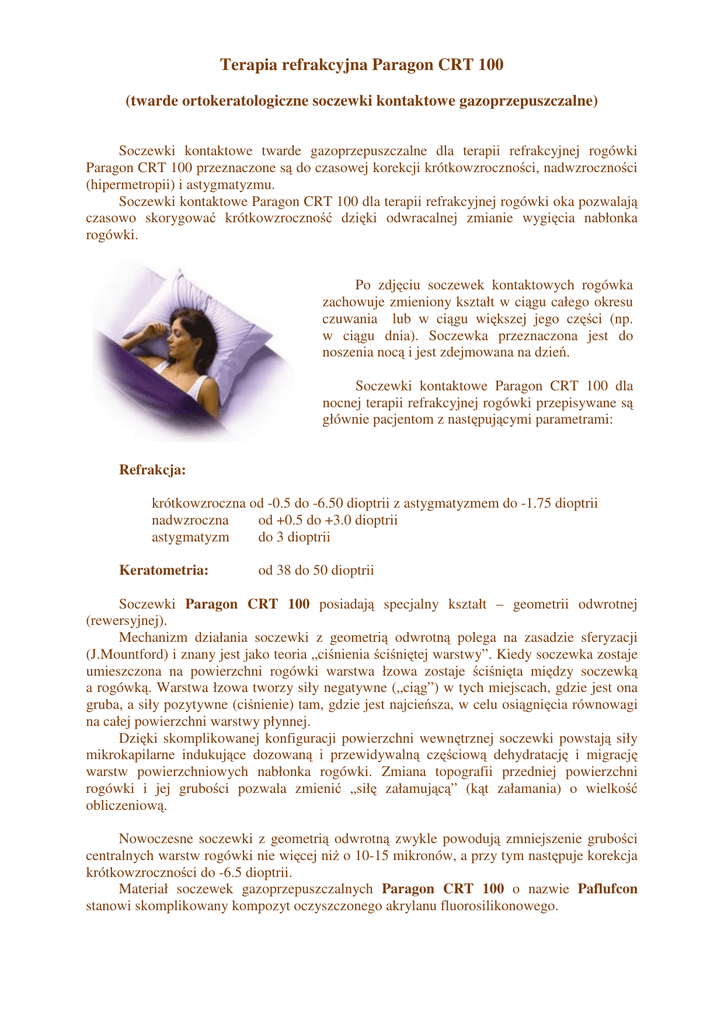 Terapia refrakcyjna Paragon CRT 100 (twarde ortokeratologiczne soczewki kontaktowe gazoprzepuszczalne) Soczewki kontaktowe twarde gazoprzepuszczalne dla terapii refrakcyjnej rogówki Paragon CRT 100 przeznaczone są do czasowej korekcji krótkowzroczności, nadwzroczności (hipermetropii) i astygmatyzmu. Soczewki kontaktowe Paragon CRT 100 dla terapii refrakcyjnej rogówki oka pozwalają czasowo skorygować krótkowzroczność dzięki odwracalnej zmianie wygięcia nabłonka rogówki. Po zdjęciu soczewek kontaktowych rogówka zachowuje zmieniony kształt w ciągu całego okresu czuwania lub w ciągu większej jego części (np. w ciągu dnia). Soczewka przeznaczona jest do noszenia nocą i jest zdejmowana na dzień. Soczewki kontaktowe Paragon CRT 100 dla nocnej terapii refrakcyjnej rogówki przepisywane są głównie pacjentom z następującymi parametrami: Refrakcja: krótkowzroczna od -0.5 do -6.50 dioptrii z astygmatyzmem do -1.75 dioptrii nadwzroczna od +0.5 do +3.0 dioptrii astygmatyzm do 3 dioptrii Keratometria: od 38 do 50 dioptrii Soczewki Paragon CRT 100 posiadają specjalny kształt – geometrii odwrotnej (rewersyjnej). Mechanizm działania soczewki z geometrią odwrotną polega na zasadzie sferyzacji (J.Mountford) i znany jest jako teoria „ciśnienia ściśniętej warstwy”. Kiedy soczewka zostaje umieszczona na powierzchni rogówki warstwa łzowa zostaje ściśnięta między soczewką a rogówką. Warstwa łzowa tworzy siły negatywne („ciąg”) w tych miejscach, gdzie jest ona gruba, a siły pozytywne (ciśnienie) tam, gdzie jest najcieńsza, w celu osiągnięcia równowagi na całej powierzchni warstwy płynnej. Dzięki skomplikowanej konfiguracji powierzchni wewnętrznej soczewki powstają siły mikrokapilarne indukujące dozowaną i przewidywalną częściową dehydratację i migrację warstw powierzchniowych nabłonka rogówki. Zmiana topografii przedniej powierzchni rogówki i jej grubości pozwala zmienić „siłę załamującą” (kąt załamania) o wielkość obliczeniową. Nowoczesne soczewki z geometrią odwrotną zwykle powodują zmniejszenie grubości centralnych warstw rogówki nie więcej niż o 10-15 mikronów, a przy tym następuje korekcja krótkowzroczności do -6.5 dioptrii. Materiał soczewek gazoprzepuszczalnych Paragon CRT 100 o nazwie Paflufcon stanowi skomplikowany kompozyt oczyszczonego akrylanu fluorosilikonowego. Firma Paragon w ciągu prawie 10 lat zajmowała się opracowaniem materiałów z wysokim stopniem oczyszczania silikonu od balastów (przy tym badania były przeprowadzone trzykrotnie w warunkach nieważkości na wahadłowcach Discovery) i stworzyła materiał Paflufcon z optymalnym stosunkiem fluorytu i silikonu o wysokim stopniu oczyszczenia z tlenoprzepuszczalnością 140 (ISO-Fatt). Taki wysoki wskaźnik tlenoprzepuszczalności pozwala stosować soczewki nocą bez zwiększania niedotlenienia fizjologicznego rogówki pod zamkniętymi powiekami. Materiał Paflufcon został opracowany na podstawie technologii membranowych i opatentowany przez firmę Paragon. 100 Lens Diagnostic/Dispensing Set Wysoka przepuszczalność tlenu i niska zawartość wilgoci (poniżej 1%) znacznie zmniejsza niebezpieczeństwo zanieczyszczenia soczewek gazoprzepuszczalnych, ponieważ obniża przenikanie do nich flory patogennej i znacznie ułatwia mechaniczne oczyszczanie. (Wg statystyki ryzyko rozwoju bakteryjnego zapalenia rogówki przy noszeniu twardych soczewek gazoprzepuszczalnych jest 4-krotnie mniejsze, niż w przypadku miękkich soczewek kontaktowych (odpowiednio 0.01 i 0.039%) i 20-krotnie mniejsze, niż przy przedłużonym używaniu miękkich soczewek kontaktowych).