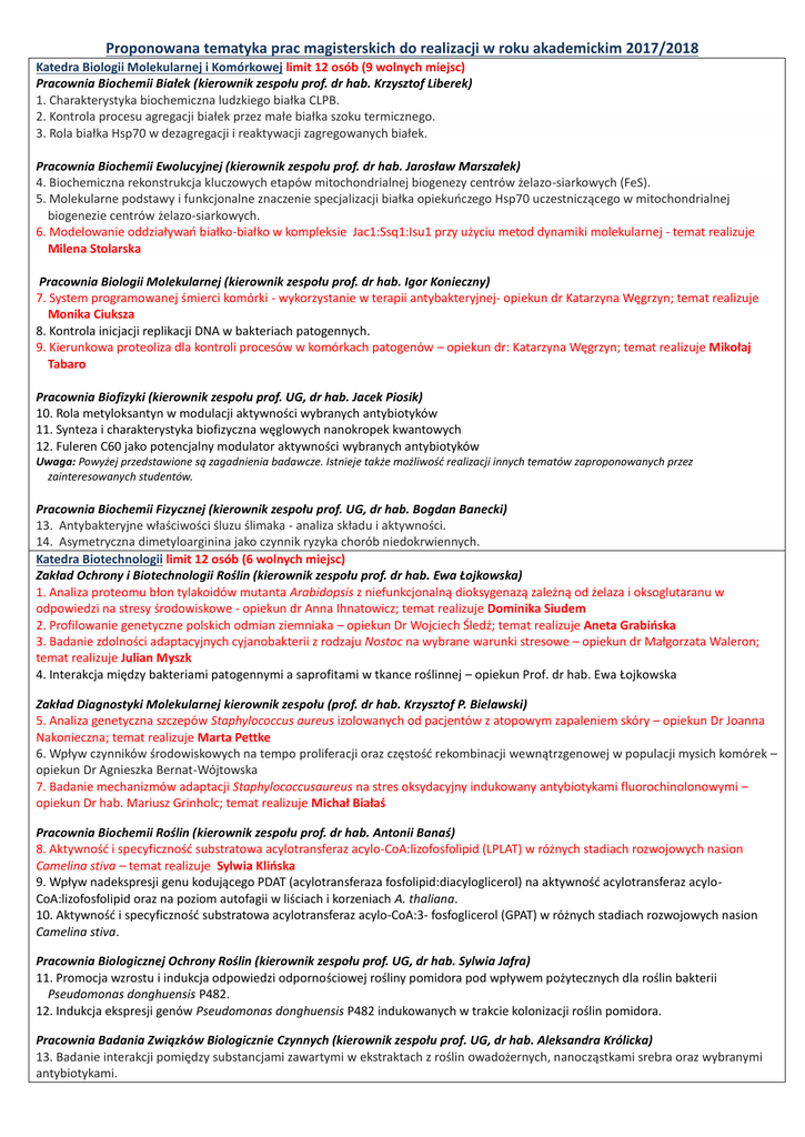 Proponowana tematyka prac magisterskich do realizacji w roku akademickim 2017/2018 Katedra Biologii Molekularnej i Komórkowej limit 12 osób (9 wolnych miejsc) Pracownia Biochemii Białek (kierownik zespołu prof. dr hab. Krzysztof Liberek) 1. Charakterystyka biochemiczna ludzkiego białka CLPB. 2. Kontrola procesu agregacji białek przez małe białka szoku termicznego. 3. Rola białka Hsp70 w dezagregacji i reaktywacji zagregowanych białek. Pracownia Biochemii Ewolucyjnej (kierownik zespołu prof. dr hab. Jarosław Marszałek) 4. Biochemiczna rekonstrukcja kluczowych etapów mitochondrialnej biogenezy centrów żelazo-siarkowych (FeS). 5. Molekularne podstawy i funkcjonalne znaczenie specjalizacji białka opiekuńczego Hsp70 uczestniczącego w mitochondrialnej biogenezie centrów żelazo-siarkowych. 6. Modelowanie oddziaływań białko-białko w kompleksie Jac1:Ssq1:Isu1 przy użyciu metod dynamiki molekularnej - temat realizuje Milena Stolarska Pracownia Biologii Molekularnej (kierownik zespołu prof. dr hab. Igor Konieczny) 7. System programowanej śmierci komórki - wykorzystanie w terapii antybakteryjnej- opiekun dr Katarzyna Węgrzyn; temat realizuje Monika Ciuksza 8. Kontrola inicjacji replikacji DNA w bakteriach patogennych. 9. Kierunkowa proteoliza dla kontroli procesów w komórkach patogenów – opiekun dr: Katarzyna Węgrzyn; temat realizuje Mikołaj Tabaro Pracownia Biofizyki (kierownik zespołu prof. UG, dr hab. Jacek Piosik) 10. Rola metyloksantyn w modulacji aktywności wybranych antybiotyków 11. Synteza i charakterystyka biofizyczna węglowych nanokropek kwantowych 12. Fuleren C60 jako potencjalny modulator aktywności wybranych antybiotyków Uwaga: Powyżej przedstawione są zagadnienia badawcze. Istnieje także możliwość realizacji innych tematów zaproponowanych przez zainteresowanych studentów. Pracownia Biochemii Fizycznej (kierownik zespołu prof. UG, dr hab. Bogdan Banecki) 13. Antybakteryjne właściwości śluzu ślimaka - analiza składu i aktywności. 14. Asymetryczna dimetyloarginina jako czynnik ryzyka chorób niedokrwiennych. Katedra Biotechnologii limit 12 osób (6 wolnych miejsc) Zakład Ochrony i Biotechnologii Roślin (kierownik zespołu prof. dr hab. Ewa Łojkowska) 1. Analiza proteomu błon tylakoidów mutanta Arabidopsis z niefunkcjonalną dioksygenazą zależną od żelaza i oksoglutaranu w odpowiedzi na stresy środowiskowe - opiekun dr Anna Ihnatowicz; temat realizuje Dominika Siudem 2. Profilowanie genetyczne polskich odmian ziemniaka – opiekun Dr Wojciech Śledź; temat realizuje Aneta Grabińska 3. Badanie zdolności adaptacyjnych cyjanobakterii z rodzaju Nostoc na wybrane warunki stresowe – opiekun dr Małgorzata Waleron; temat realizuje Julian Myszk 4. Interakcja między bakteriami patogennymi a saprofitami w tkance roślinnej – opiekun Prof. dr hab. Ewa Łojkowska Zakład Diagnostyki Molekularnej kierownik zespołu (prof. dr hab. Krzysztof P. Bielawski) 5. Analiza genetyczna szczepów Staphylococcus aureus izolowanych od pacjentów z atopowym zapaleniem skóry – opiekun Dr Joanna Nakonieczna; temat realizuje Marta Pettke 6. Wpływ czynników środowiskowych na tempo proliferacji oraz częstość rekombinacji wewnątrzgenowej w populacji mysich komórek – opiekun Dr Agnieszka Bernat-Wójtowska 7. Badanie mechanizmów adaptacji Staphylococcusaureus na stres oksydacyjny indukowany antybiotykami fluorochinolonowymi – opiekun Dr hab. Mariusz Grinholc; temat realizuje Michał Białaś Pracownia Biochemii Roślin (kierownik zespołu prof. dr hab. Antonii Banaś) 8. Aktywność i specyficzność substratowa acylotransferaz acylo-CoA:lizofosfolipid (LPLAT) w różnych stadiach rozwojowych nasion Camelina stiva – temat realizuje Sylwia Klińska 9. Wpływ nadekspresji genu kodującego PDAT (acylotransferaza fosfolipid:diacyloglicerol) na aktywność acylotransferaz acyloCoA:lizofosfolipid oraz na poziom autofagii w liściach i korzeniach A. thaliana. 10. Aktywność i specyficzność substratowa acylotransferaz acylo-CoA:3- fosfoglicerol (GPAT) w różnych stadiach rozwojowych nasion Camelina stiva. Pracownia Biologicznej Ochrony Roślin (kierownik zespołu prof. UG, dr hab. Sylwia Jafra) 11. Promocja wzrostu i indukcja odpowiedzi odpornościowej rośliny pomidora pod wpływem pożytecznych dla roślin bakterii Pseudomonas donghuensis P482. 12. Indukcja ekspresji genów Pseudomonas donghuensis P482 indukowanych w trakcie kolonizacji roślin pomidora. Pracownia Badania Związków Biologicznie Czynnych (kierownik zespołu prof. UG, dr hab. Aleksandra Królicka) 13. Badanie interakcji pomiędzy substancjami zawartymi w ekstraktach z roślin owadożernych, nanocząstkami srebra oraz wybranymi antybiotykami. Pracownia Struktury Biopolimerów (kierownik zespołu Prof. UG, dr hab. Stanisław Ołdziej) – limit 2 osoby (brak wolnych miejsc) 1. Wiązanie hormonów sterydowych przez albuminy osocza – temat realizuje Andrzej Wiese 2. Motyw sekwencyjny DXDGD – uniwersalna sekwencja wiążący kationy Mg(II) i Ca(II) w białkach – temat realizuje Maciej Fras Pracownia Symulacji Układów Biomolekularnych (kierownik zespołu Prof. UG, dr hab. Rajmund Kaźmierkiewicz) – limit 2 osoby (2 wolne miejsca) 1. Badania ucieczki liganda z jego kompleksu z białkiem. 2. Teoretyczne badania nad wieloetapową interkalacją ligandów aromatycznych do DNA. 3. Badania efektów energetycznych towarzyszących dysocjacji dimeru cząsteczek białka. 4. Symulacja zmian konformacyjnych towarzyszących aktywacji (domeny) kinazy FGFR1. 5. Zastosowanie metod teoretycznych do przewidywania oddziaływania wody z cząsteczką białka. Zakład Biologii Molekularnej Wirusów (kierownik zespołu prof. dr hab. Krystyna Bieńkowska-Szewczyk) – limit 4 osoby (2 wolne miejsca) 1. Analiza przebiegu infekcji herpeswirusowej w komórce nowotworowej – opiekun prof. Krystyna Bieńkowska-Szewczyk 2. Rola białek IFITM w infekcjach wirusowych – opiekun dr Alicja Chmiel