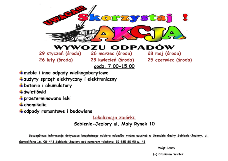 29 styczeń (środa) 26 luty (środa) 26 marzec (środa) 28 maj (środa) 23 kwiecień (środa) 25 czerwiec (środa) godz. 7.00-15.00 meble i inne odpady wielkogabarytowe zużyty sprzęt elektryczny i elektroniczny baterie i akumulatory świetlówki przeterminowane leki chemikalia odpady remontowe i budowlane Lokalizacja zbiórki: Sobienie-Jeziory ul. Mały Rynek 10 Szczegółowe informacje dotyczące bezpłatnego odbioru odpadów można uzyskać w Urzędzie Gminy Sobienie-Jeziory, ul. Garwolińska 16, 08-443 Sobienie-Jeziory pod numerem telefonu: 25 685 80 90 w. 42 Wójt Gminy (-) Stanisław Wirtek PODCZAS AKCJI ZBIERANE BĘDĄ meble i inne stoły, szafy, krzesła, sofy, wersalki, fotele, dywany, wykładziny, materace, kołdry, walizki, torby podróżne, lampy i odpady żyrandole bez żarówek, meble ogrodowe, rowery bez opon, narty, sanki, sprzęt do ćwiczeń, wózki, chodziki, wielkogabarytowe zabawki dużych rozmiarów, duże odpady plastikowe: doniczki, skrzynki, czyste wiaderka itp. zużyty sprzęt sprzęt AGD i RTV, kable, sprzęt teleinformatyczny i telekomunikacyjny, sprzęt audiowizualny, narzędzia elektryczny i elektryczne i elektroniczne z wyjątkiem wielkogabarytowych, stacjonarnych narzędzi przemysłowych, zabawki, elektroniczny sprzęt rekreacyjny i sportowy, gry video, konsole do gier, czujniki dymu, regulatory ciepła, termostaty, wagi. baterie i akumulatory baterie i akumulatory. świetlówki lampy oraz pozostałe urządzenia oświetleniowe służące do celów rozproszenia i kontroli światła, żarówki. przeterminowane tabletki, drażetki, ampułki w opakowaniach, lub luzem. Syropy, krople, roztwory-tylko w szczelnie zamkniętych leki opakowaniach, maście. chemikalia odpady remontowe i budowlane opakowania po: środkach ochrony roślin, detergentach, farbach, klejach, olejach, tłuszczach, kwasach, rozpuszczalnikach. gruz budowlany, armatura łazienkowa (sedesy, umywalki, wanny itp.), terakota, glazura.
